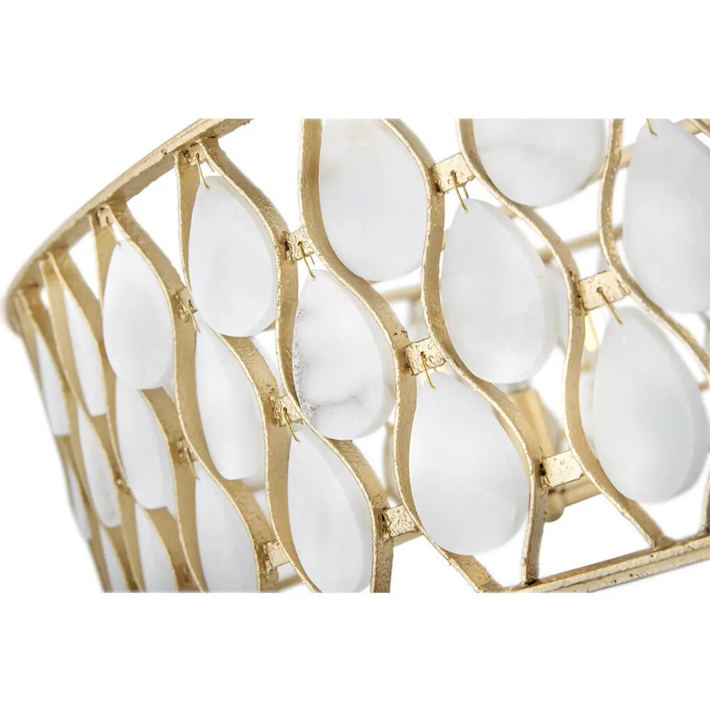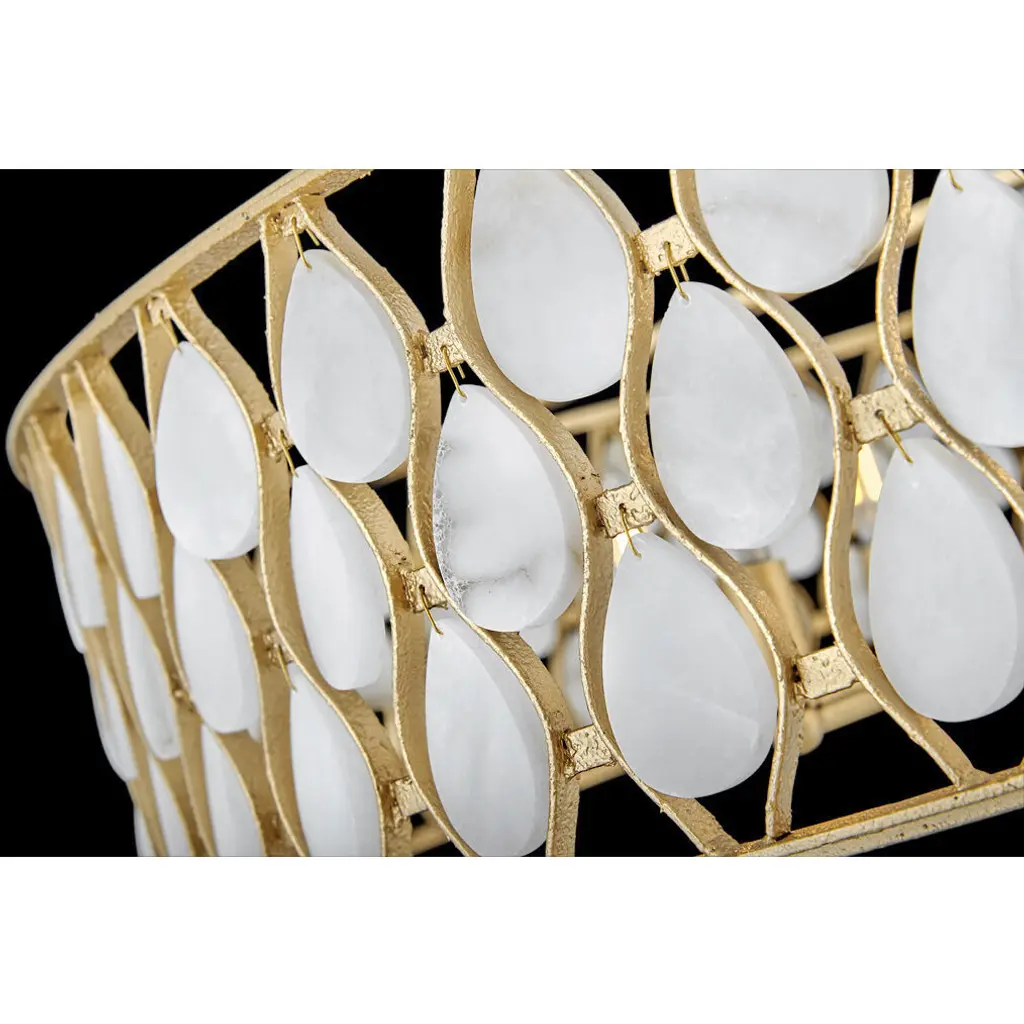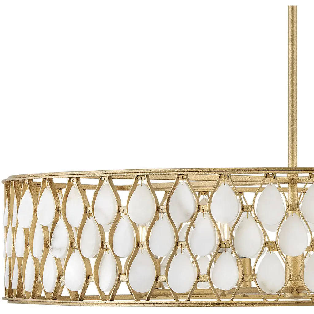 Opulently adorned with natural alabaster stones held within a traditional latticework shade, Estie brings organic elegance to any aesthetic. Intricately curved metalwork complements the frame, chain, and canopy in a textured Piastra Gold finish.
