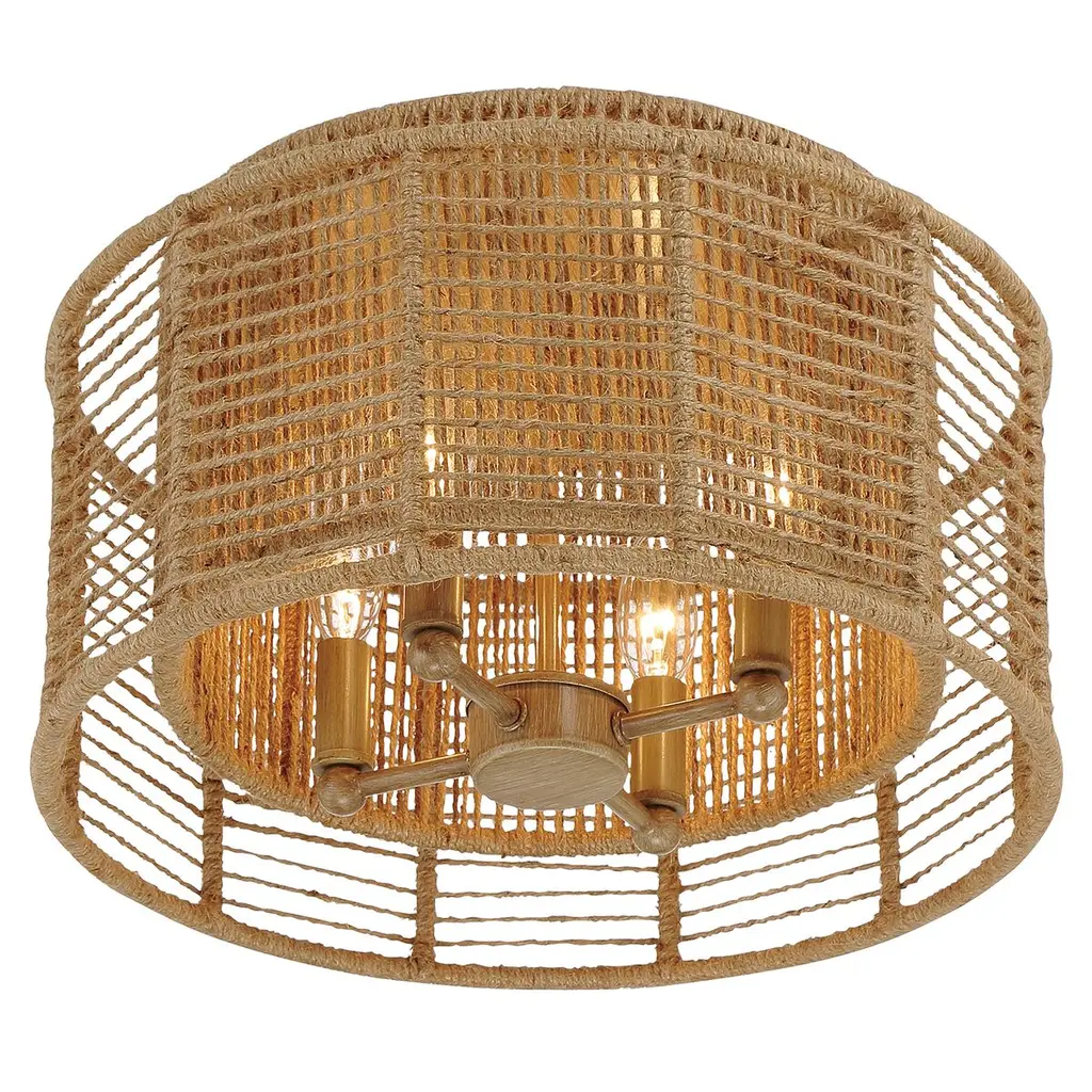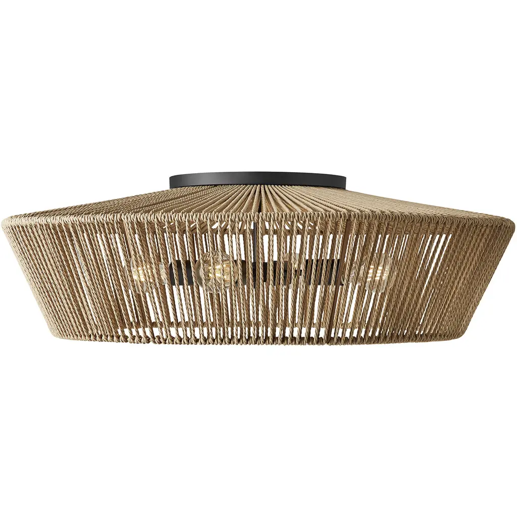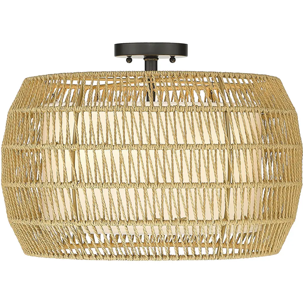 Bring Coastal elegance into your home with the Golden Lighting Everly 4-light Semi-Flush Mount. Featuring a Wicker shade and a Matte Black frame, it creates a welcoming atmosphere.The handwoven Wicker shade, crafted from Natural Rattan, offers a relaxed aesthetic that beautifully diffuses light, making it perfect for creating a cozy ambiance.Our Matte Black finish is both stylish and versatile, providing a sophisticated touch that integrates seamlessly with various design themes.This Damp Location Rated fixture is perfect for areas such as entryways, kitchens, and living spaces with mid-height ceilings. Its convertible construction allows for flexible installation to suit any room layout.Dimensions: 19"W x 13.25"H x 19"D. Requires 4 E12 Candelabra base bulbs (not included), max 60 watts.Quality craftsmanship and a focus on natural textures ensure that this semi-flush mount enhances your homes aesthetic while providing practical illumination.