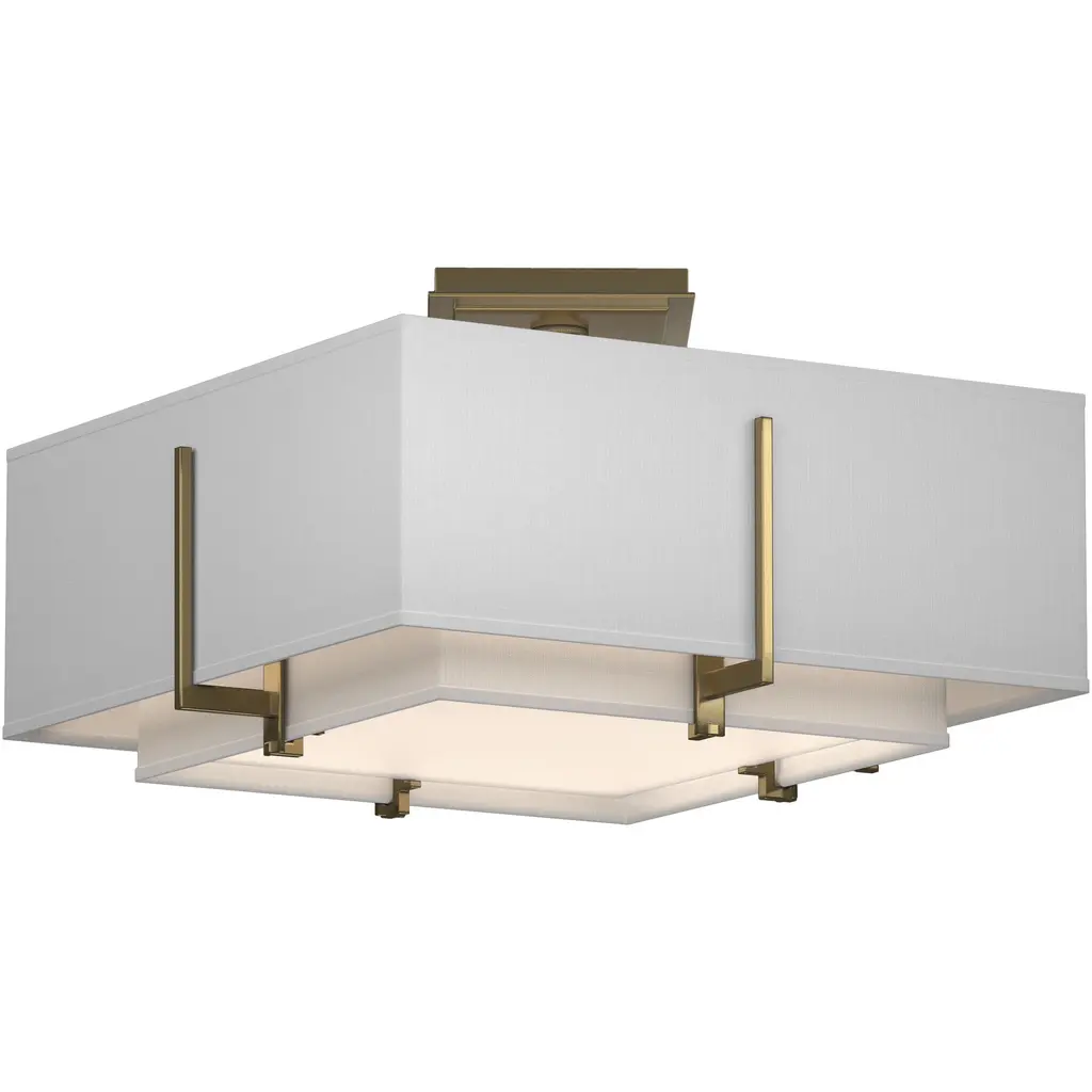 This semi-flush ceiling light features two bulbs within two shades. The shades are cradled by four hand-forged steel bars creating a bold contrast with the bars' vertical lines set against the horizontal planes of the shades. Crafted here at our forge.