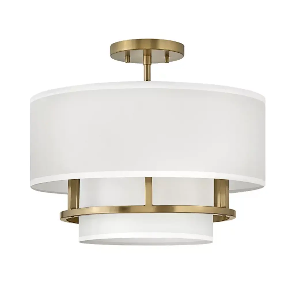 The double-shade design of our large, semi-flush delivers the clean and minimalistic elegance the collection is known for, but adds another visual element with the inclusion of an internal drum shade. Hand-forged steel bars cradle both shades.