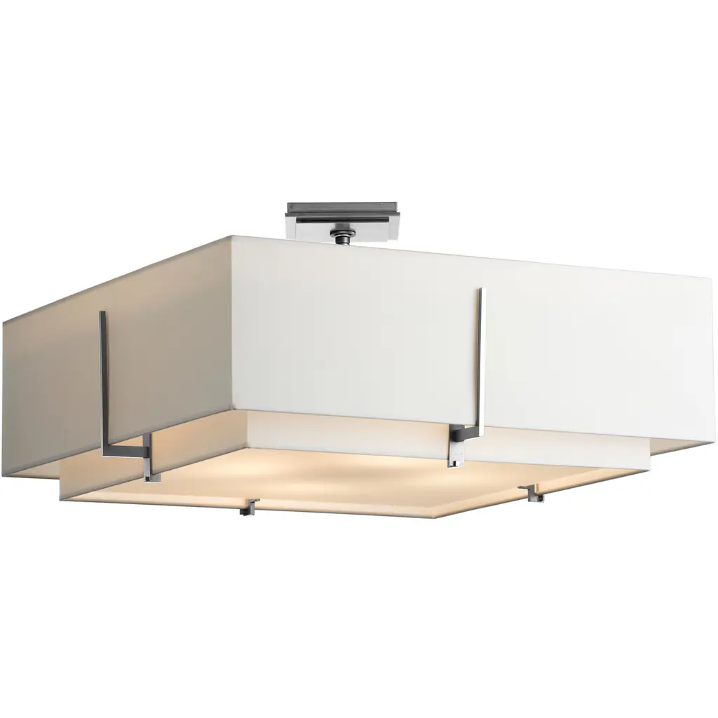 This semi-flush ceiling light features four bulbs within two shades. The shades are cradled by four steel bars creating a bold contrast with the bars' vertical lines set against the horizontal planes of the shades.