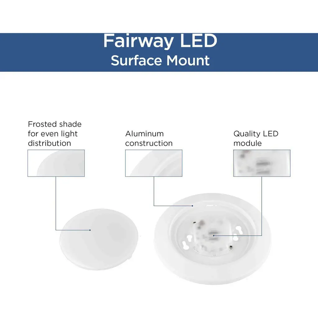 The Fairway 7 in. Surface Mount LED Light combines sleek design with value-driven functionality. Its durable metal trim is coated in a clean white finish paired with a glare-free polycarbonate lens. A 1000- lumen light engine delivers a total of 850 lumens of 3000K, 90 CRI illumination that is dimmable using TRIAC systems and is CA Title 24 Compliant. Its classic design has a gasketed, CSA wet location listed construction and is quickly and easily installed by mounting directly into a j-box into a variety of residential and commercial settings.
