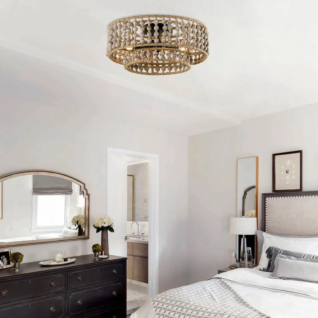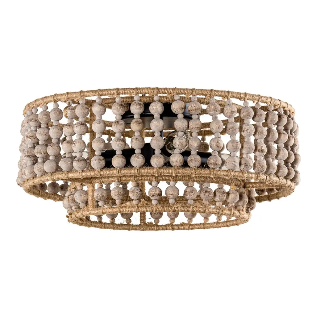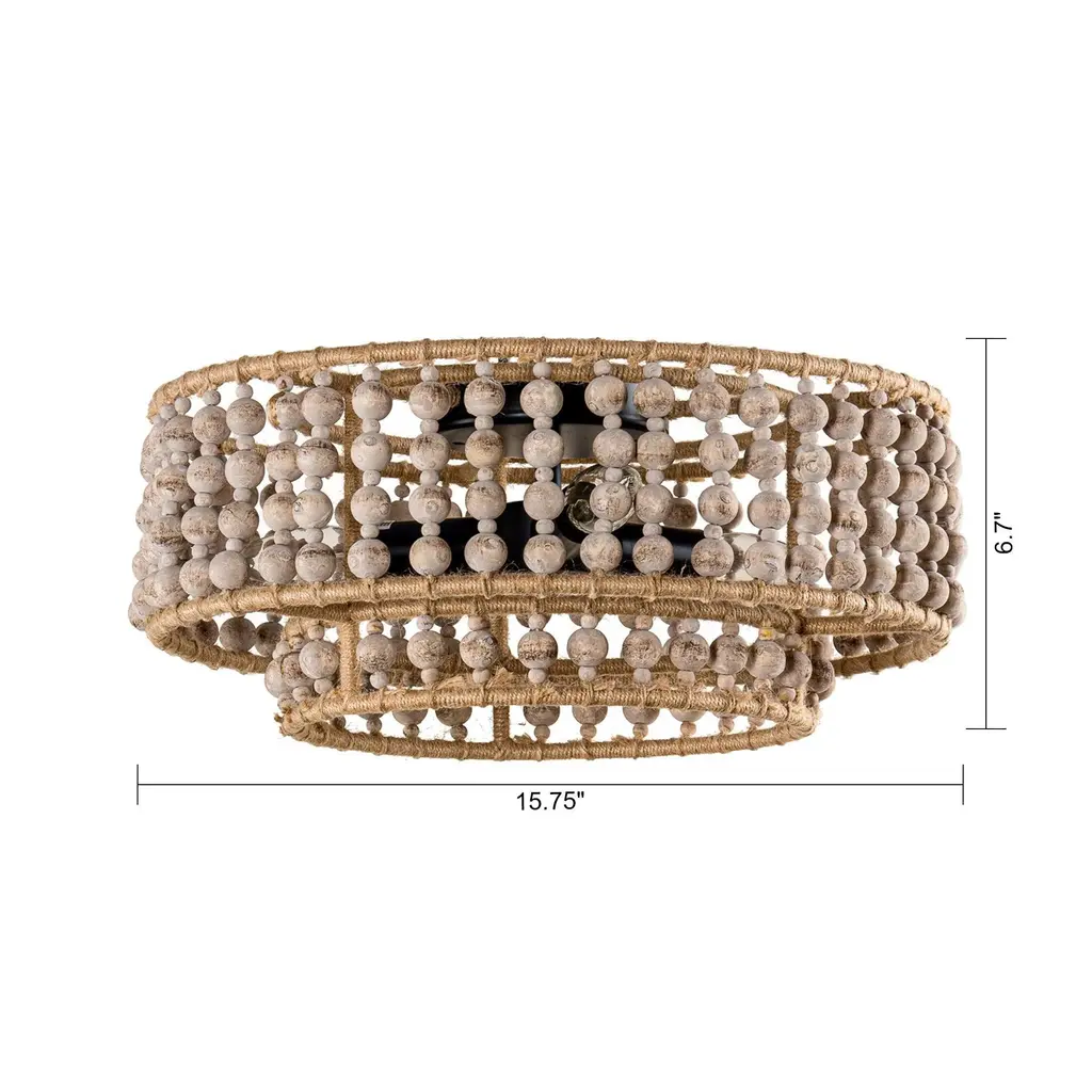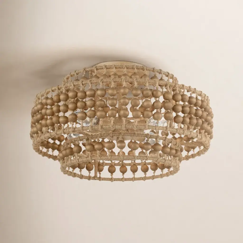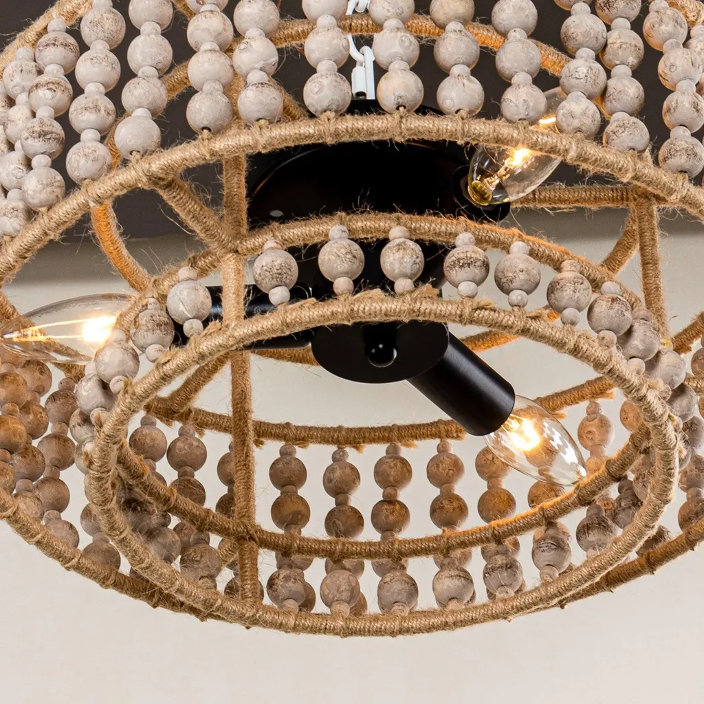 Go Boho in a casual or semi-formal space with this 3-Light wood beaded flush mount ceiling Lights. This contemporary ceiling light features a black iron metal light base with vertical strands of natural wooden beads and rope accents. It perfectly combines classic and modern styles. Provide perfect decoration or lighting for an entryway, kitchen, dining room, living room, entrance, corridor, nursery room, children's room, hotel, dining room, etc. This wood-beaded ceiling light fixture is easy to install, our chandelier set includes all mounting hardware and instructions for quick installation. Just connect screw the bulbs into the socket, link the wires, and install the farmhouse light fixture onto the ceiling.