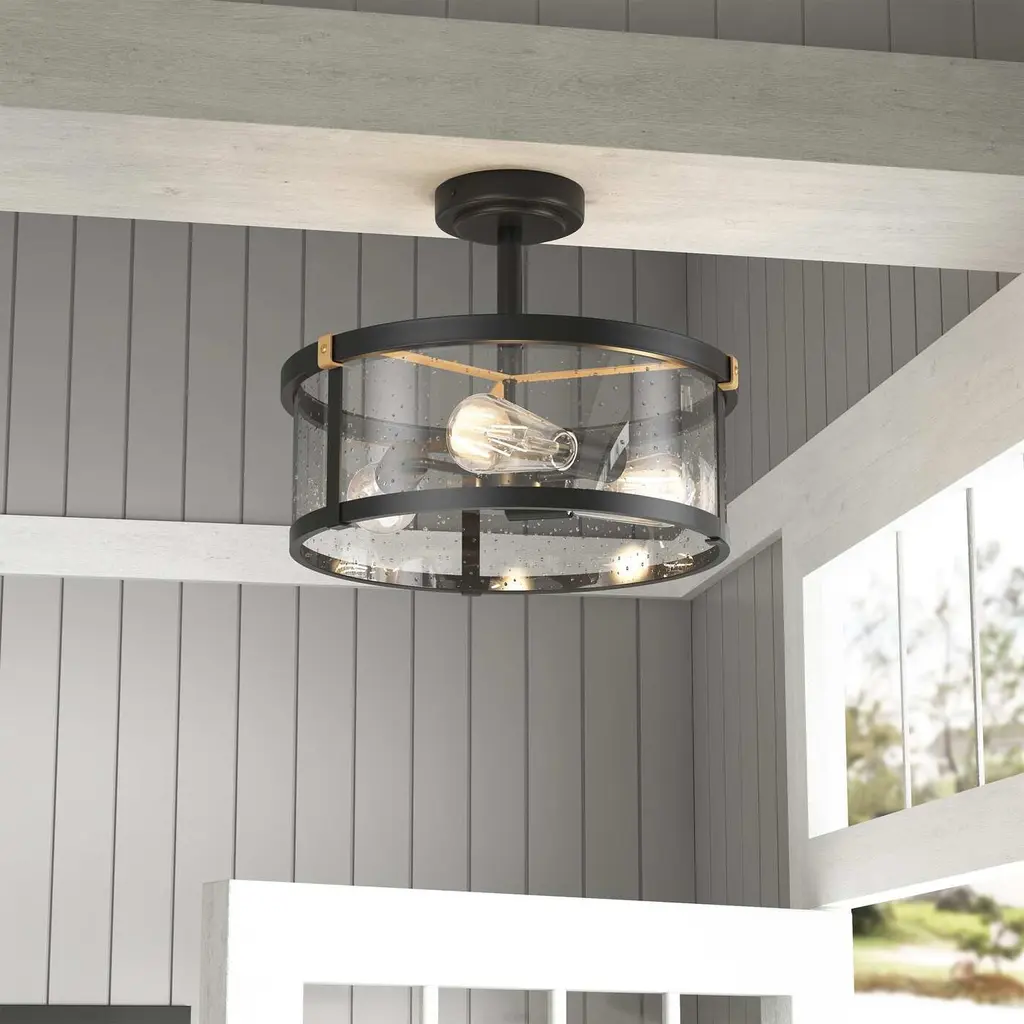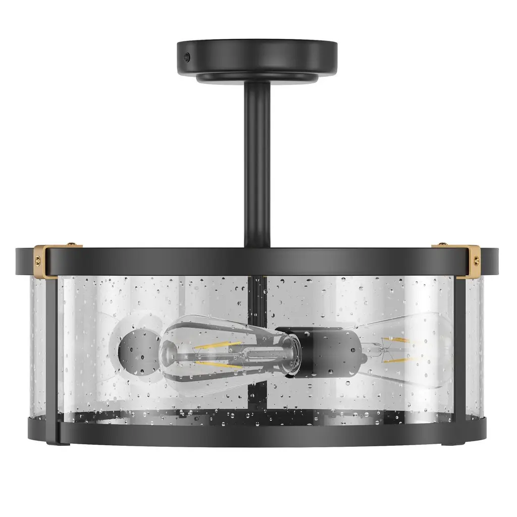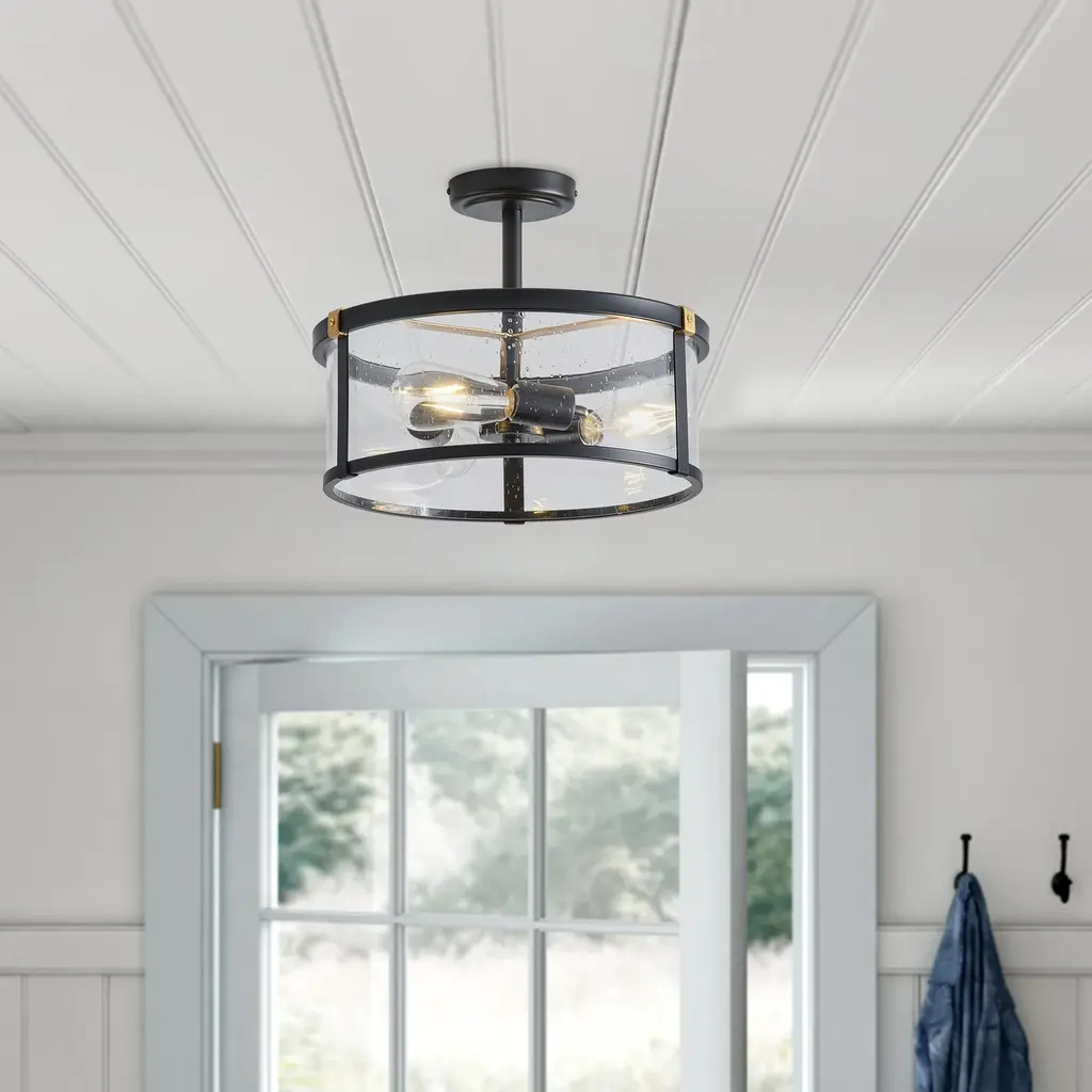 Farmhouse Design: The farmhouse semi flush mount ceiling light features a unique matte black finish with iron and clear seeded glass, gives out illumination lights up the whole room and add a vintage industrial chic touch to your house.Quality Assurance: High-quality metal and glass materials were used to craft the ceiling light. All products in the factory have to undergo rigorous safety monitoring, to ensure quality and safety, which is beautiful, corrosion-resistant, and durable for a long time.Easy to Install: All installation hardware and installation instructions are included in the package for you. We simplify all the complex steps to ensure an easy & quick installation process for you. If you have any problems please feel freely to contact us.ETL Listed & Bulb Requirement: ETL Listed for your safety. The ceiling light is a built-in standard E26 socket, suggest using a dimmable E26*3 base bulb (Max 40W, 120V), it could be fully dimmable and compatible dimmer switch. Bulbs and dimmer switch not included.Ideal Application: This farmhouse ceiling light is perfectly suitable for your bedroom, porch, entryway, kitchen, bathroom, dining room, balcony, closet and wherever you want a bright lighting. Take this good-taste ceiling light fixture home to surprise your guest now!