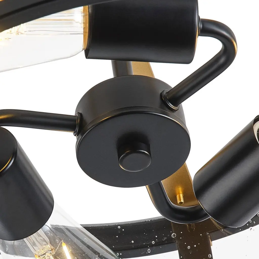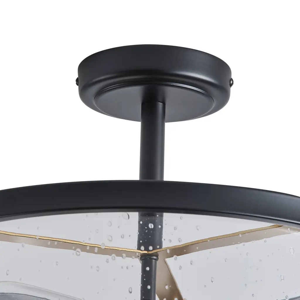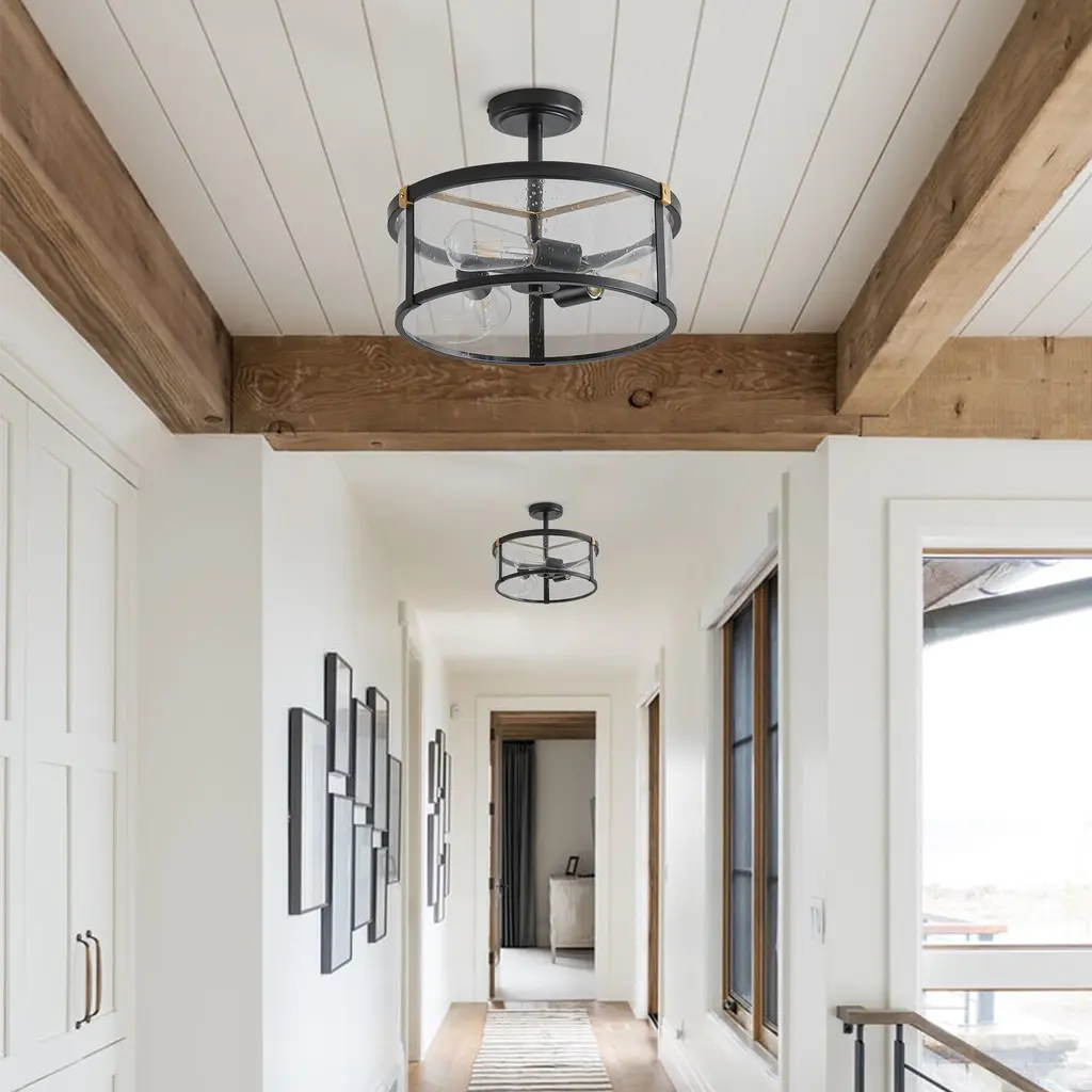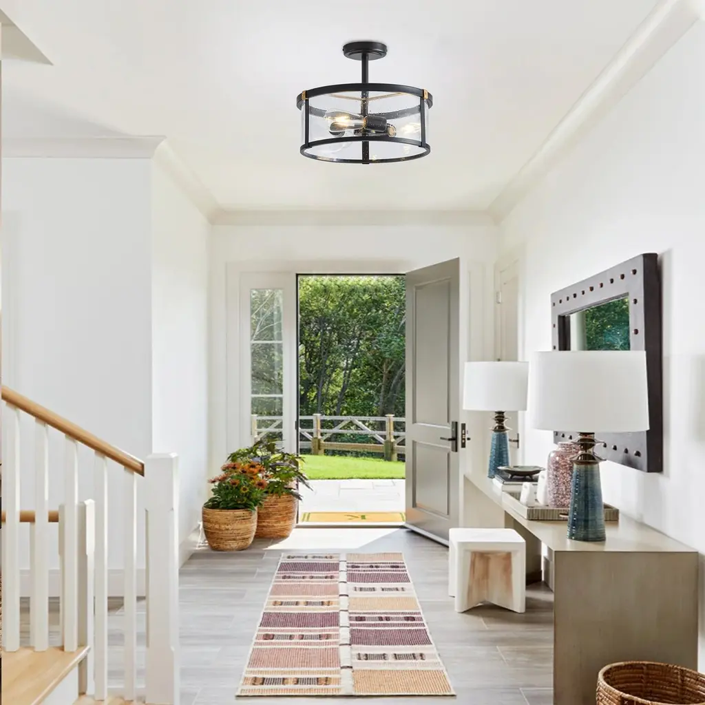 Farmhouse Design: The farmhouse semi flush mount ceiling light features a unique matte black finish with iron and clear seeded glass, gives out illumination lights up the whole room and add a vintage industrial chic touch to your house.Quality Assurance: High-quality metal and glass materials were used to craft the ceiling light. All products in the factory have to undergo rigorous safety monitoring, to ensure quality and safety, which is beautiful, corrosion-resistant, and durable for a long time.Easy to Install: All installation hardware and installation instructions are included in the package for you. We simplify all the complex steps to ensure an easy & quick installation process for you. If you have any problems please feel freely to contact us.ETL Listed & Bulb Requirement: ETL Listed for your safety. The ceiling light is a built-in standard E26 socket, suggest using a dimmable E26*3 base bulb (Max 40W, 120V), it could be fully dimmable and compatible dimmer switch. Bulbs and dimmer switch not included.Ideal Application: This farmhouse ceiling light is perfectly suitable for your bedroom, porch, entryway, kitchen, bathroom, dining room, balcony, closet and wherever you want a bright lighting. Take this good-taste ceiling light fixture home to surprise your guest now!