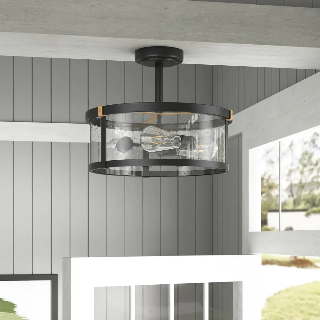 Farmhouse Black 3-Light Semi Flush Mount Ceiling Lighting Fixture With Cylinder Seeded Glass Shade - Black
