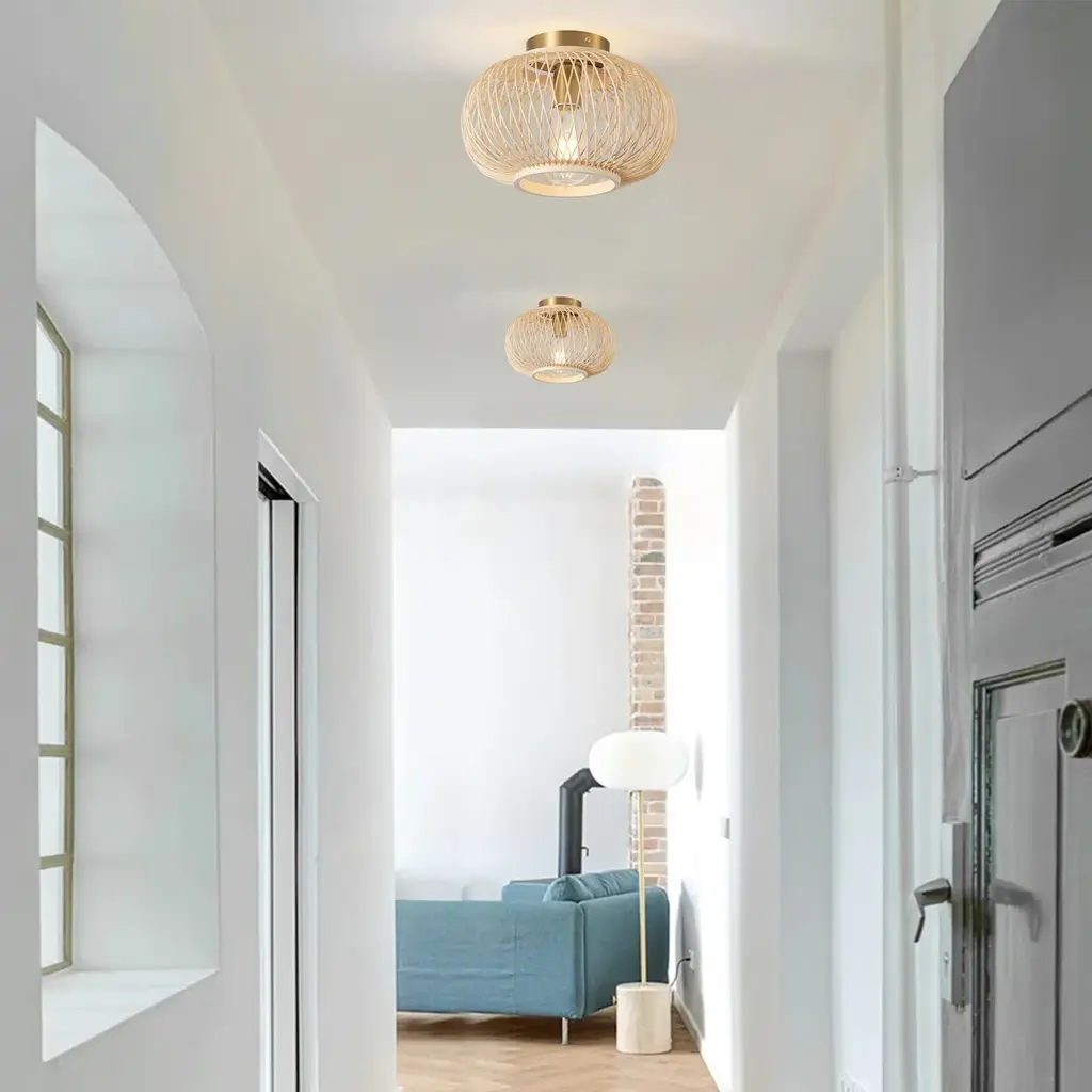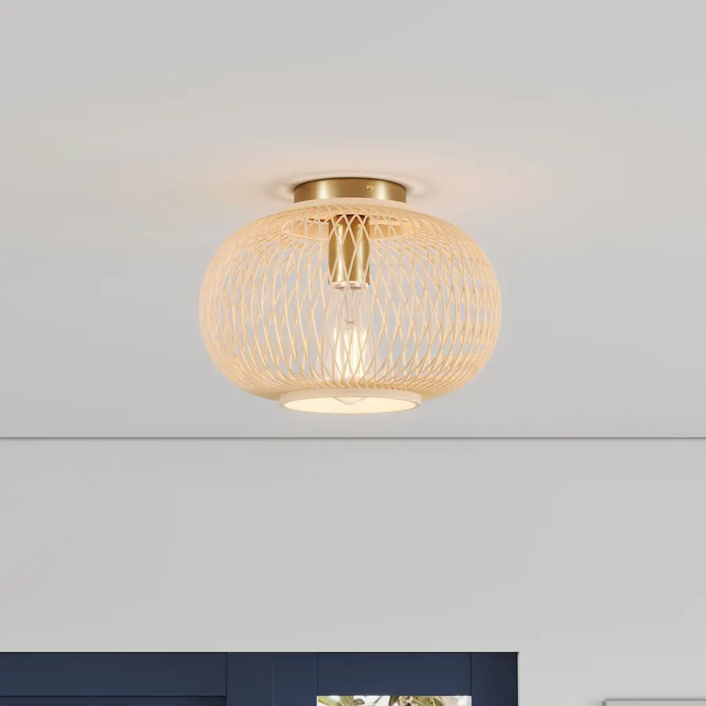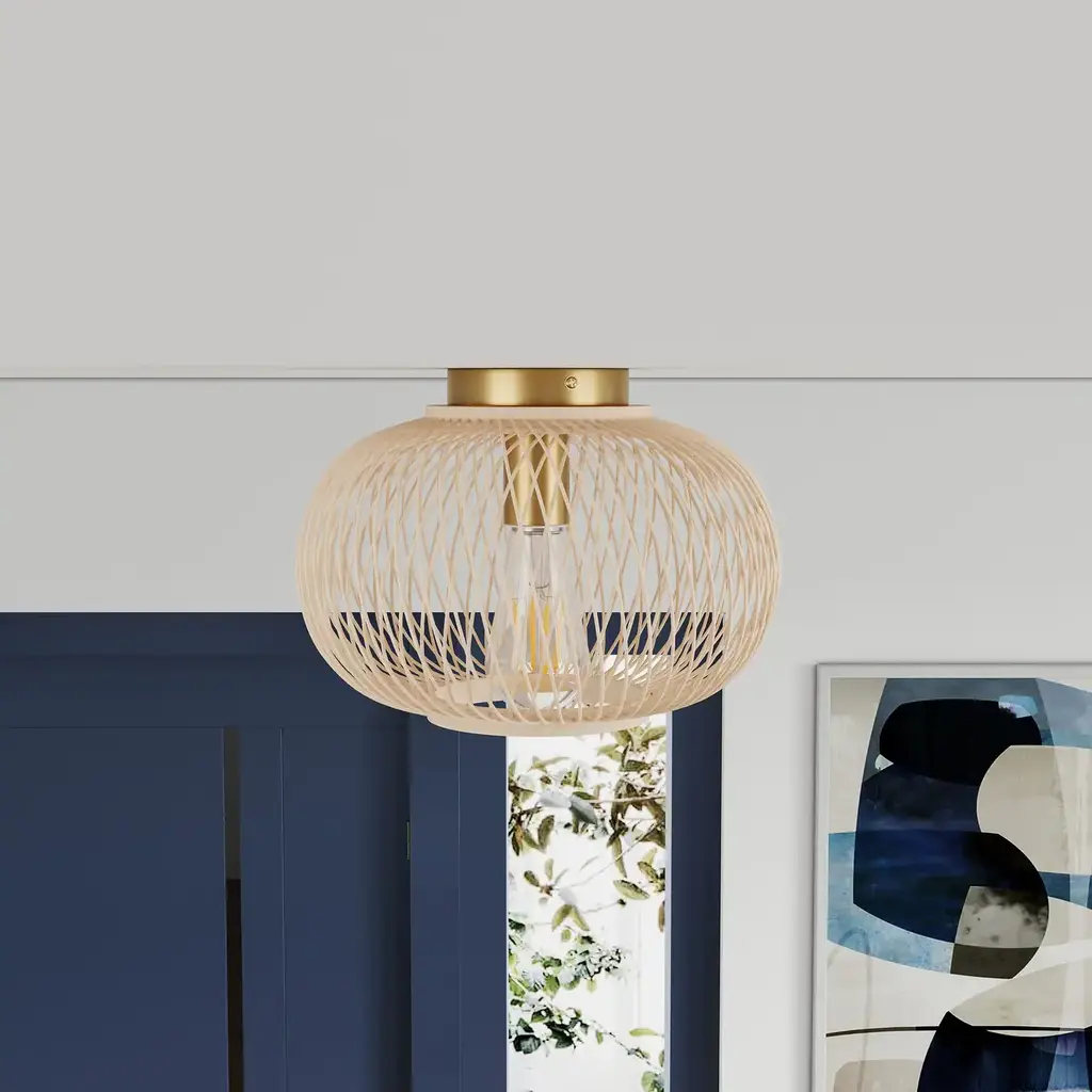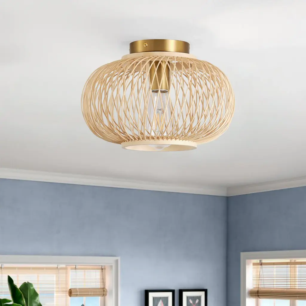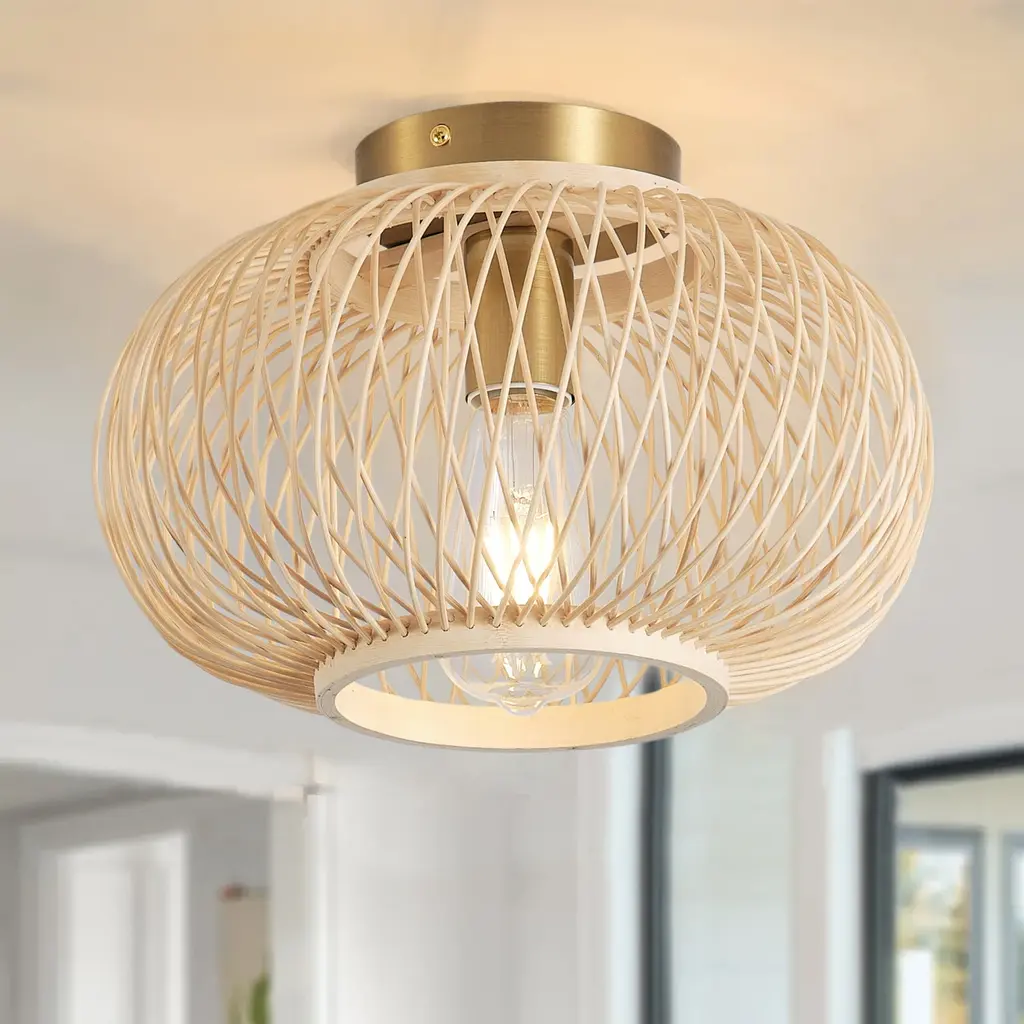 Specifications: Rattan Ceiling Light: The semi-flush mount ceiling light features a sleek, minimalist brushed brass metal canopy and the rattan shade design, creating a vintage and farmhouse look that enhances the style and beauty of any living space, offering a charming and elegant touch that is sure to impress.Quality Assurance: High-quality iron and rattan materials were used to craft the ceiling light. All products in the factory have to undergo rigorous safety monitoring, to ensure quality and safety, which is beautiful, corrosion-resistant, and durable for a long time.Easy to Install: There is no need to worry about the installation difficulty, to achieve installation quickly, all installation hardware and installation instructions are included in the package for you. If you have any problems please feel free to contact us.ETL Listed & Bulb Requirement: ETL Listed for your safety. The ceiling light is a built-in standard E26 socket, suggest using the dimmable E26*1 base bulbs (Max 12W, 120V), it could be a fully dimmable and compatible dimmer switch. Bulbs and dimmer switch not included.Wide Application: The farmhouse ceiling light is the perfect addition to any room in your home or office. It effortlessly enhances the ambiance of your dining room, living room, bedroom, kitchen island, bathroom, hotel, hallway, foyer, loft, or cafe.