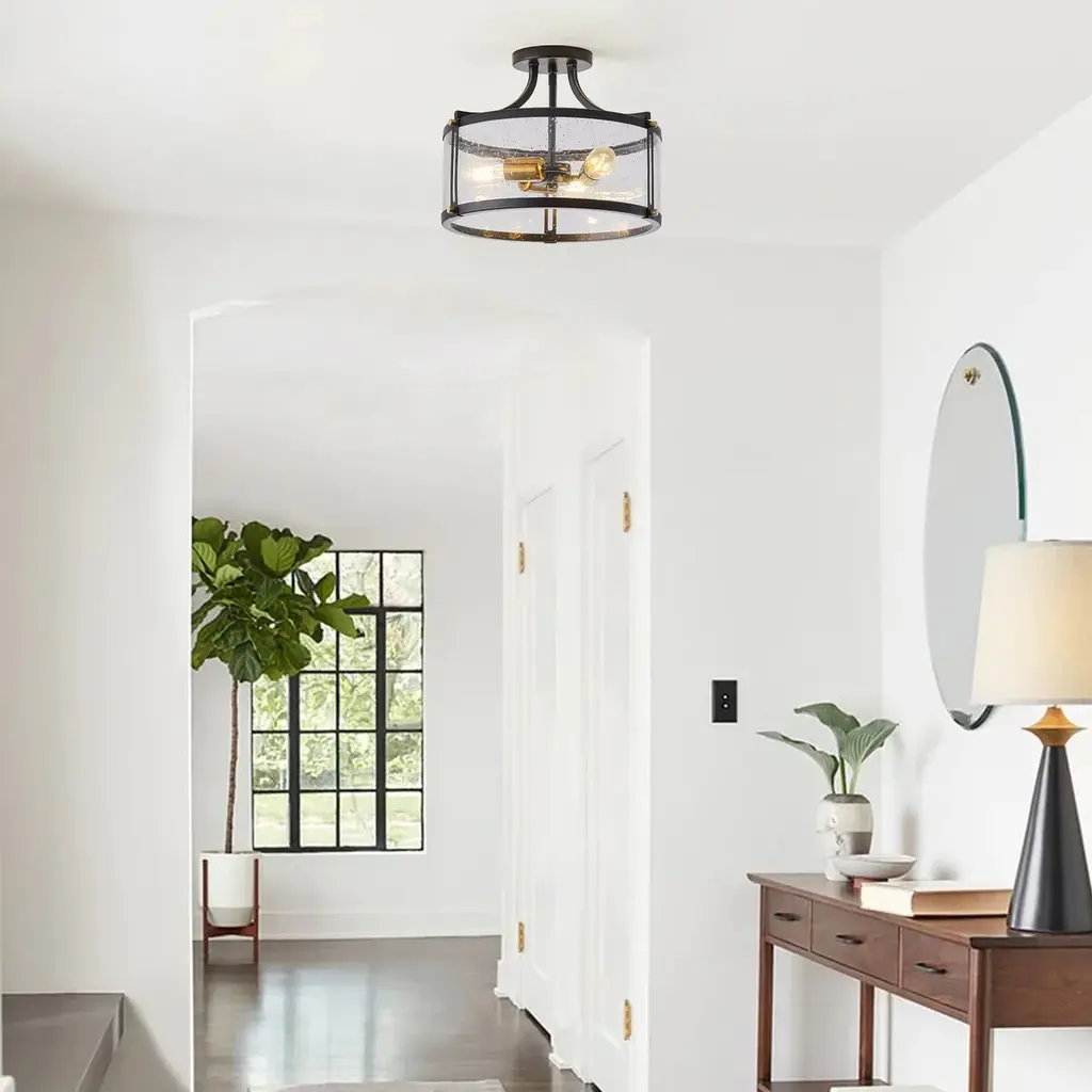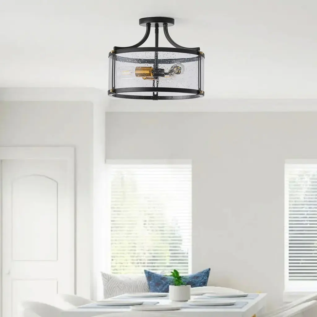 Farmhouse Style: The farmhouse semi flush mount ceiling light features a unique matte black finish with iron and clear seeded glass, gives out illumination lights up the whole room and add a vintage industrial chic touch to your house.Quality Assurance: High-quality iron and glass craft with painted finish. All products in factory have to undergo a rigorous safety monitoring, ensure the quality and safety, which is beautiful and durable for a long time.Easy to Install: All installation hardware and installation instructions are included in the package for you. We simplify all the complex steps to ensure an easy & quick installation process for you.ETL Listed & Bulb Requirement: ETL Listed for safety. The lamp socket is rated for light bulb with E26 base and a maximum wattage of 26W. This ceiling light is dimmable when applied dimmer and dimming bulb, you can use different style bulbs to change your lighting (bulb and dimmer switch are not included).Application: This farmhouse ceiling light is perfectly suitable for your bedroom, porch, entryway, kitchen, bathroom, dining room, balcony, closet and wherever you want a bright lighting. Take this good-taste ceiling light fixture home to surprise your guest now!