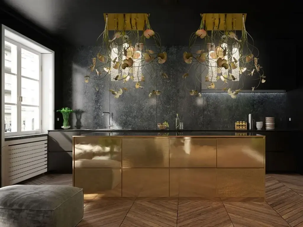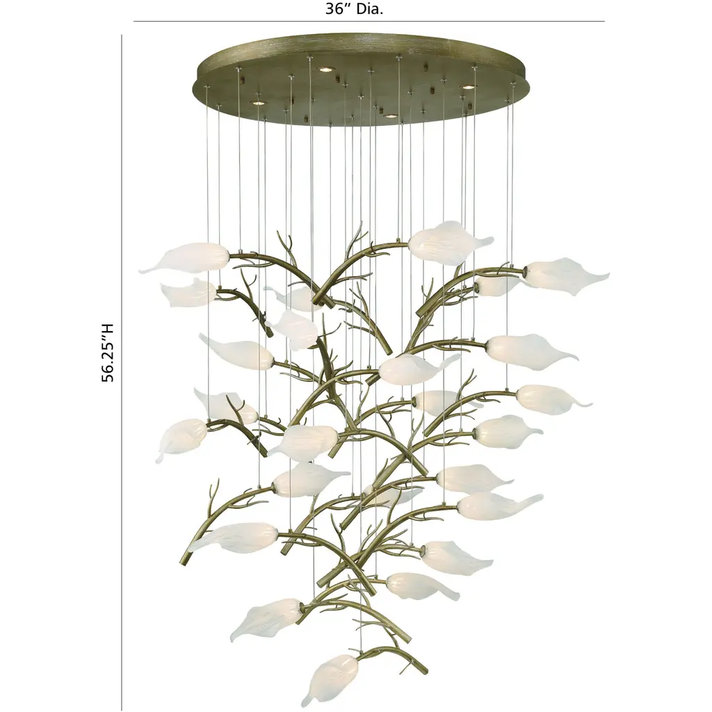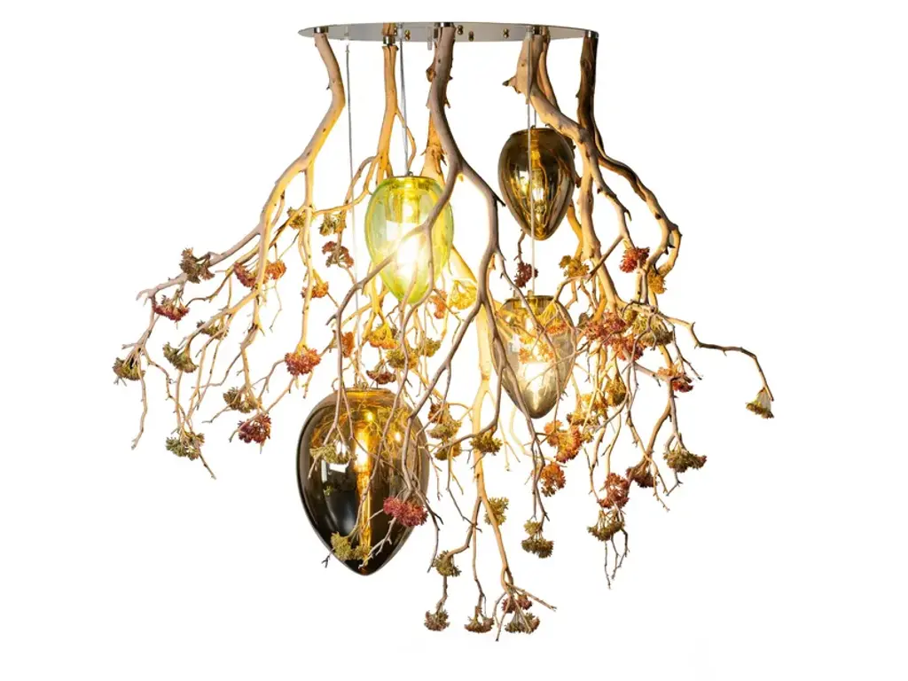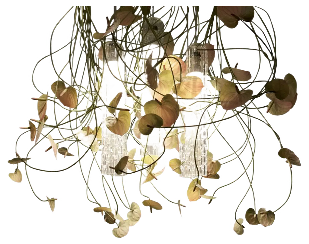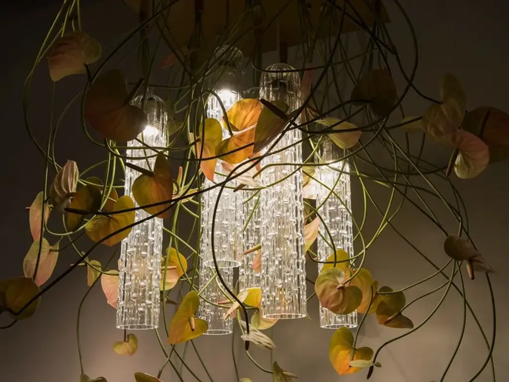 Chandelier consisting of VG artificial flowers and pipes in Muranese glass, LED bulbs fitted with fixing plate, to be suspended or built-in and painted according to colour of the ceiling. Plate size is 15 cm shorter in lenght and width than volume dimensions.Available as:FLOWER POWER CHANDELIER - ANTHURIUM/6 CLEAR PIPES - 65 x 65 x h 80 cm - LED GU10 6 x 7WCode: 8880021.00FLOWER POWER CHANDELIER - ANTHURIUM / 10 TRANSPARENT TUBES - 105 x 60 x h 80 cm - LED GU10 10 x 7WCode: 8880022. 00Flower Power is a ceiling light source designed for both residential and contract spaces. An excellent solution as an ornamental object, but also as an efficient chandelier and spotlight: the match between functionality and design with a natural feel. A balancing act, combining transparent materials, bright colours and fascinating compositions. Flower Power brings together modular lighting and natural inspiration, a concept that draws on VG’s specialisation in designing artificial flowers, and thrives on continuous customisation. A chandelier whose lymph is imagination, the same one that turned the assumption of verticality upside down, roots in the air and stems down, letting leaves and flowers gracefully fall, entwined with exquisite Murano glass. The first Flower Power is born as an ode to Spring, to the awakening of nature, with the decisive and at the same time delicate shades of Tulips. The charm of flora has thus travelled through the seasons, interpreting this lighting element with Lotus and Phalenopsis flowers, with Ivy and Poppies.