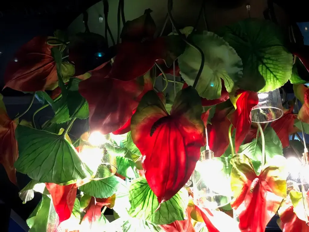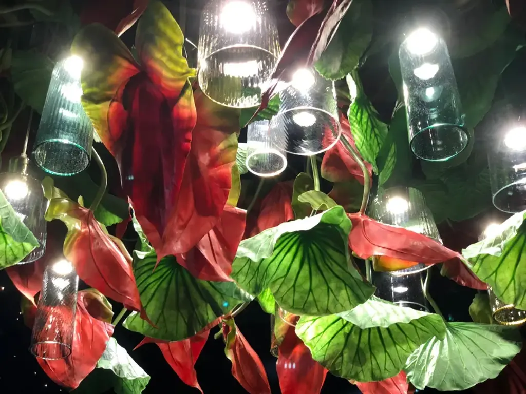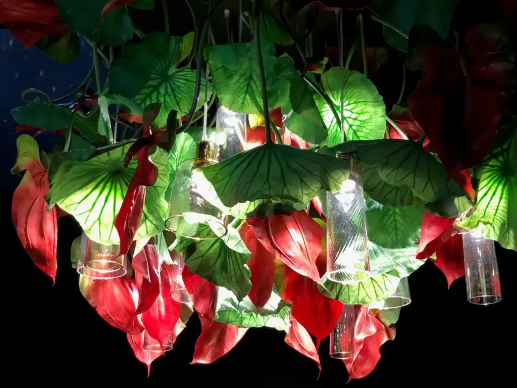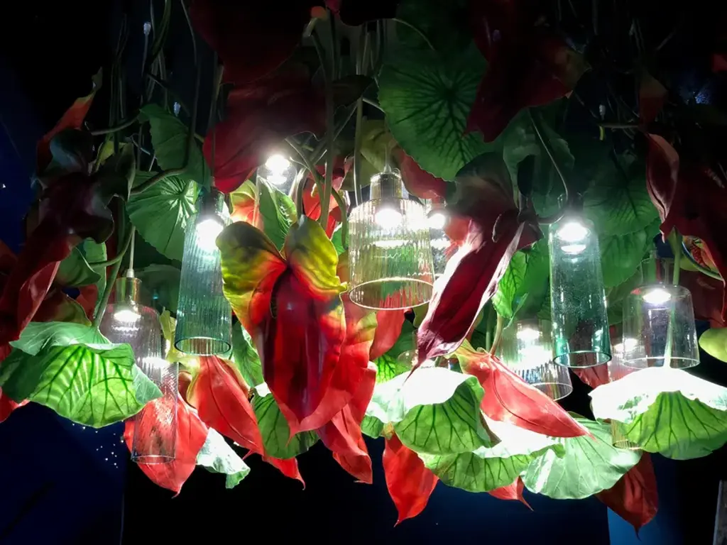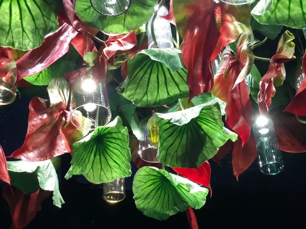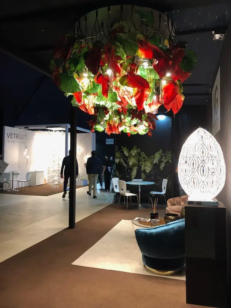 Flower Power Anthurium Round is a chandelier consisting of VG artificial flowers and Mun by VG Pendants in Muranese glass, LED bulbs fitted with fixing plate, to be suspended or built-in and painted according to colour of the ceiling.Plate size is 15 cm shorter in lenght and width than volume dimensions.Flower Power is a ceiling light source designed for both residential and contract spaces. An excellent solution as an ornamental object, but also as an efficient chandelier and spotlight: the match between functionality and design with a natural feel. A balancing act, combining transparent materials, bright colours and fascinating compositions. Flower Power brings together modular lighting and natural inspiration, a concept that draws on VG’s specialisation in designing artificial flowers, and thrives on continuous customisation. A chandelier whose lymph is imagination, the same one that turned the assumption of verticality upside down, roots in the air and stems down, letting leaves and flowers gracefully fall, entwined with exquisite Murano glass. The first Flower Power is born as an ode to Spring, to the awakening of nature, with the decisive and at the same time delicate shades of Tulips. The charm of flora has thus travelled through the seasons, interpreting this lighting element with Lotus and Phalenopsis flowers, with Ivy and Poppies.