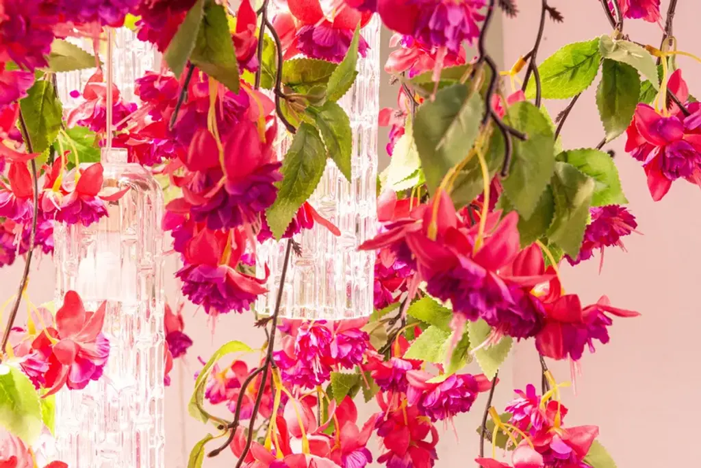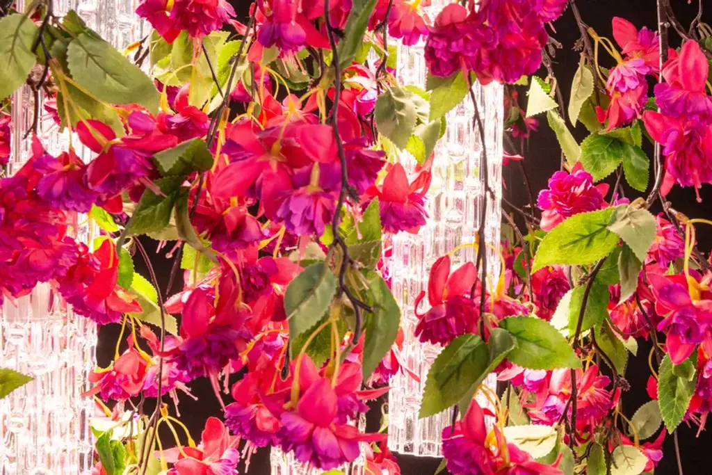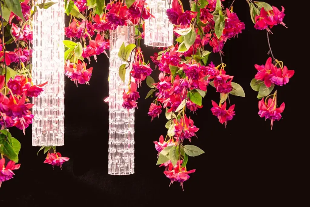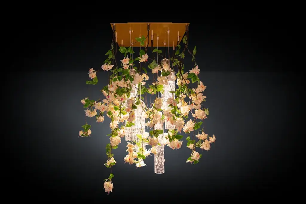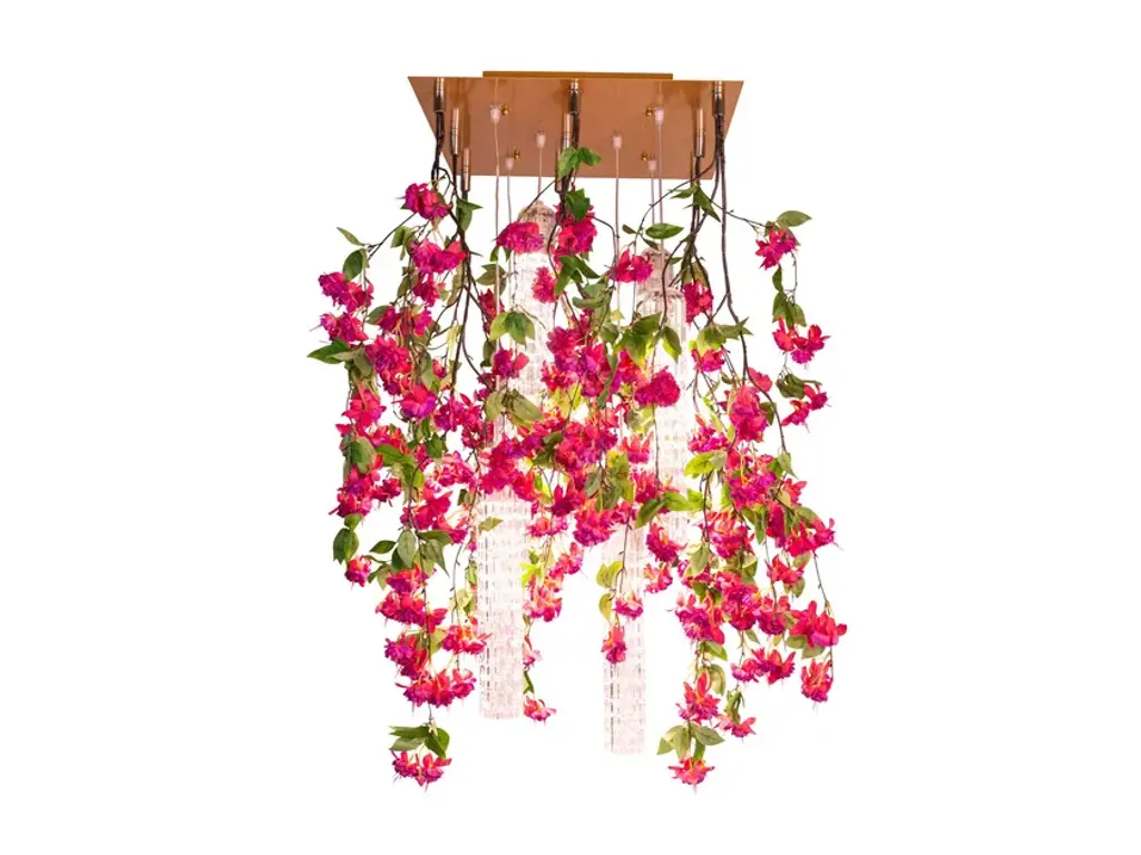 Flower Power Cascades Square is a chandelier consisting of VG artificial flowers and pipes in Muranese glass, LED bulbs (6 bulbs GU10 x 6W each) fitted with fixing plate, to be suspended or ceiling mounted and painted according to the ceiling color. It's possible to have in the version with fuchsia or cream flowers, with transparent or glossy gold Muranese glass. Plate size is approx 15 cm shorter in lenght and width than volume dimensions.Product codeCascades square cream: 8880440.99Cascades square fucsia: 8880441.99Flower Power is a ceiling light source designed for both residential and contract spaces. An excellent solution as an ornamental object, but also as an efficient chandelier and spotlight: the match between functionality and design with a natural feel. A balancing act, combining transparent materials, bright colours and fascinating compositions. Flower Power brings together modular lighting and natural inspiration, a concept that draws on VG’s specialisation in designing artificial flowers, and thrives on continuous customisation. A chandelier whose lymph is imagination, the same one that turned the assumption of verticality upside down, roots in the air and stems down, letting leaves and flowers gracefully fall, entwined with exquisite Murano glass. The first Flower Power is born as an ode to Spring, to the awakening of nature, with the decisive and at the same time delicate shades of Tulips. The charm of flora has thus travelled through the seasons, interpreting this lighting element with Lotus and Phalenopsis flowers, with Ivy and Poppies.