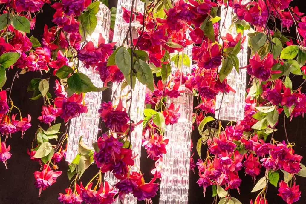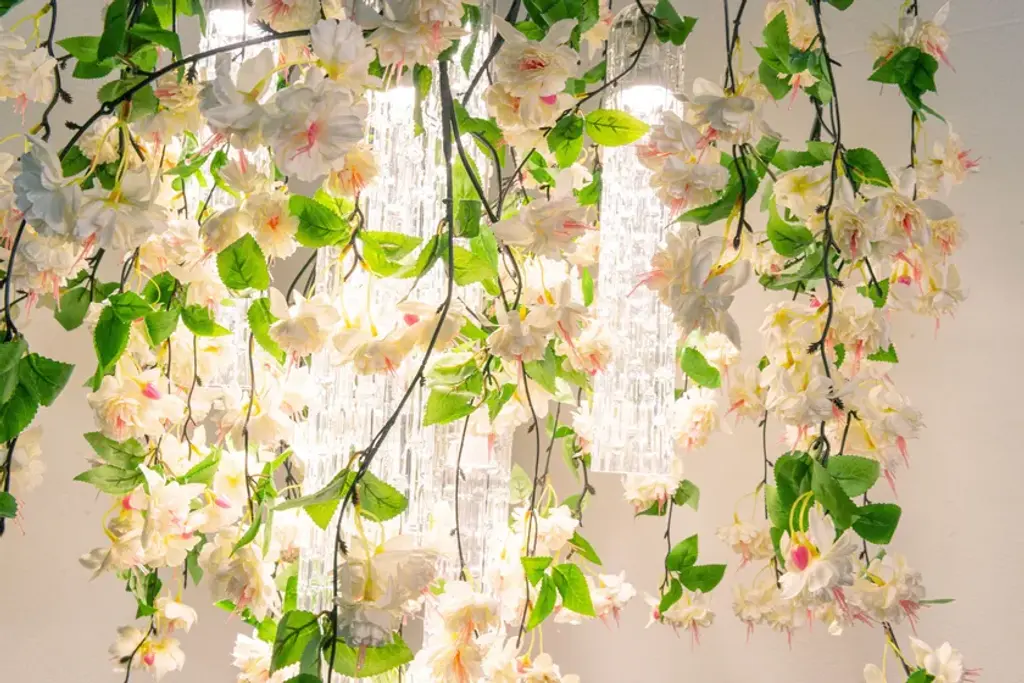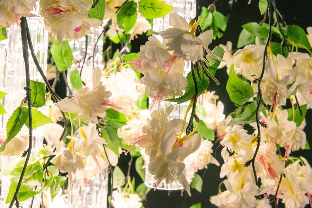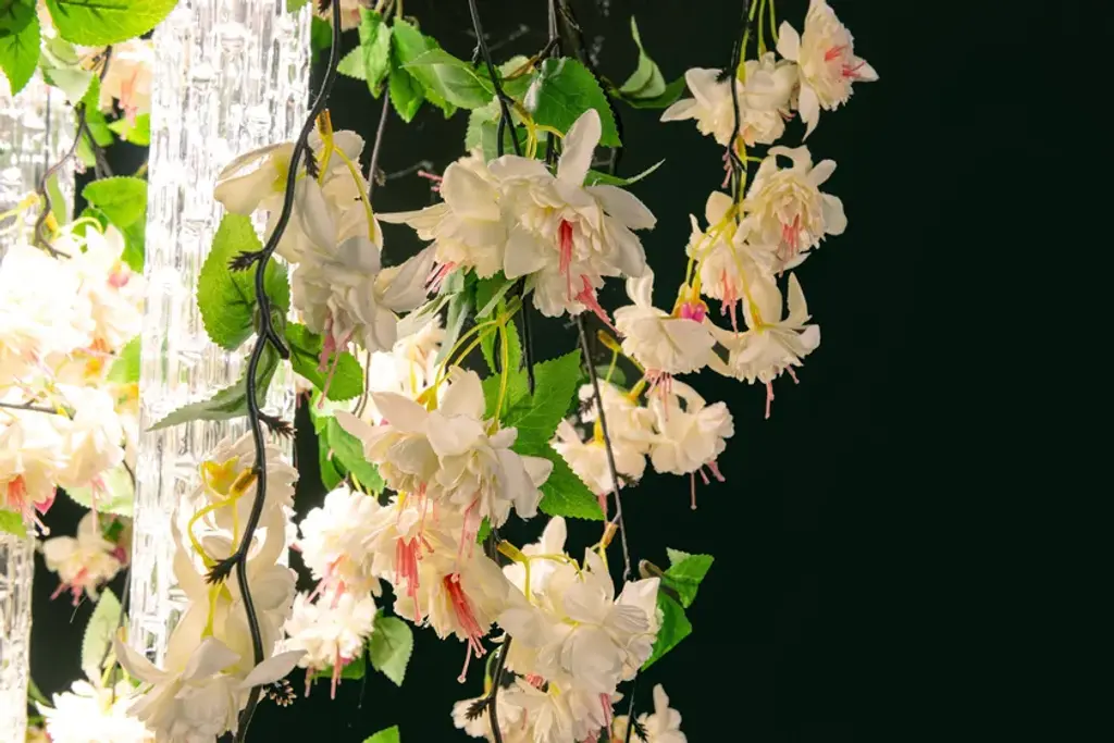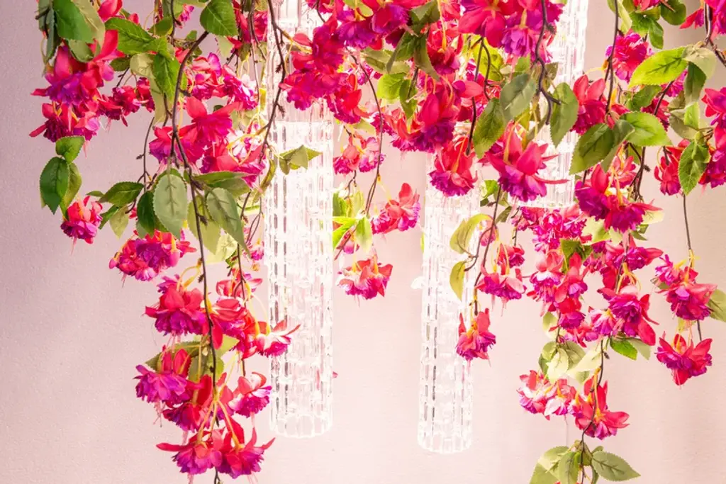 Flower Power Cascades Square is a chandelier consisting of VG artificial flowers and pipes in Muranese glass, LED bulbs (6 bulbs GU10 x 6W each) fitted with fixing plate, to be suspended or ceiling mounted and painted according to the ceiling color. It's possible to have in the version with fuchsia or cream flowers, with transparent or glossy gold Muranese glass. Plate size is approx 15 cm shorter in lenght and width than volume dimensions.Product codeCascades square cream: 8880440.99Cascades square fucsia: 8880441.99Flower Power is a ceiling light source designed for both residential and contract spaces. An excellent solution as an ornamental object, but also as an efficient chandelier and spotlight: the match between functionality and design with a natural feel. A balancing act, combining transparent materials, bright colours and fascinating compositions. Flower Power brings together modular lighting and natural inspiration, a concept that draws on VG’s specialisation in designing artificial flowers, and thrives on continuous customisation. A chandelier whose lymph is imagination, the same one that turned the assumption of verticality upside down, roots in the air and stems down, letting leaves and flowers gracefully fall, entwined with exquisite Murano glass. The first Flower Power is born as an ode to Spring, to the awakening of nature, with the decisive and at the same time delicate shades of Tulips. The charm of flora has thus travelled through the seasons, interpreting this lighting element with Lotus and Phalenopsis flowers, with Ivy and Poppies.