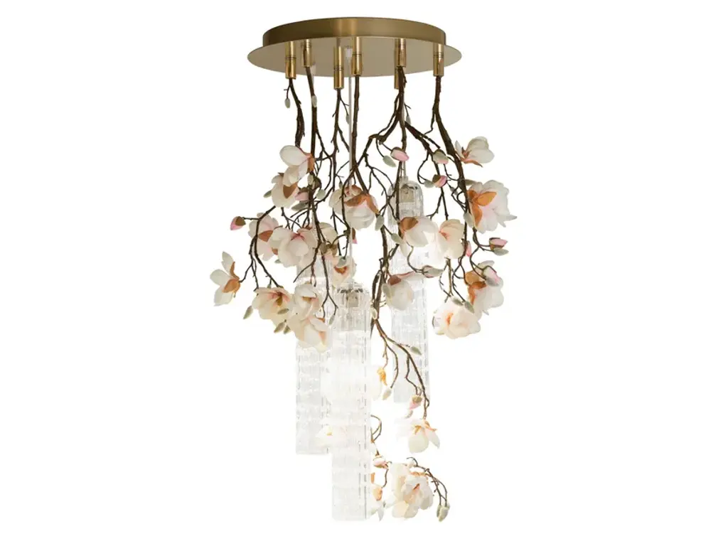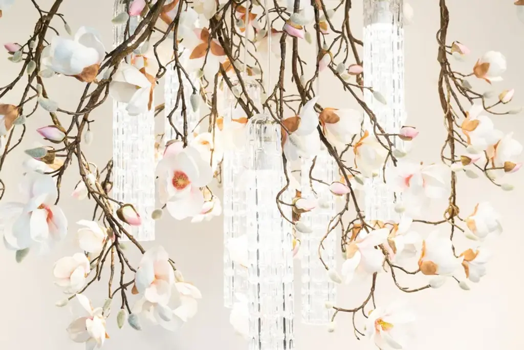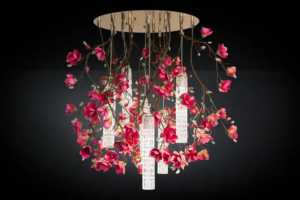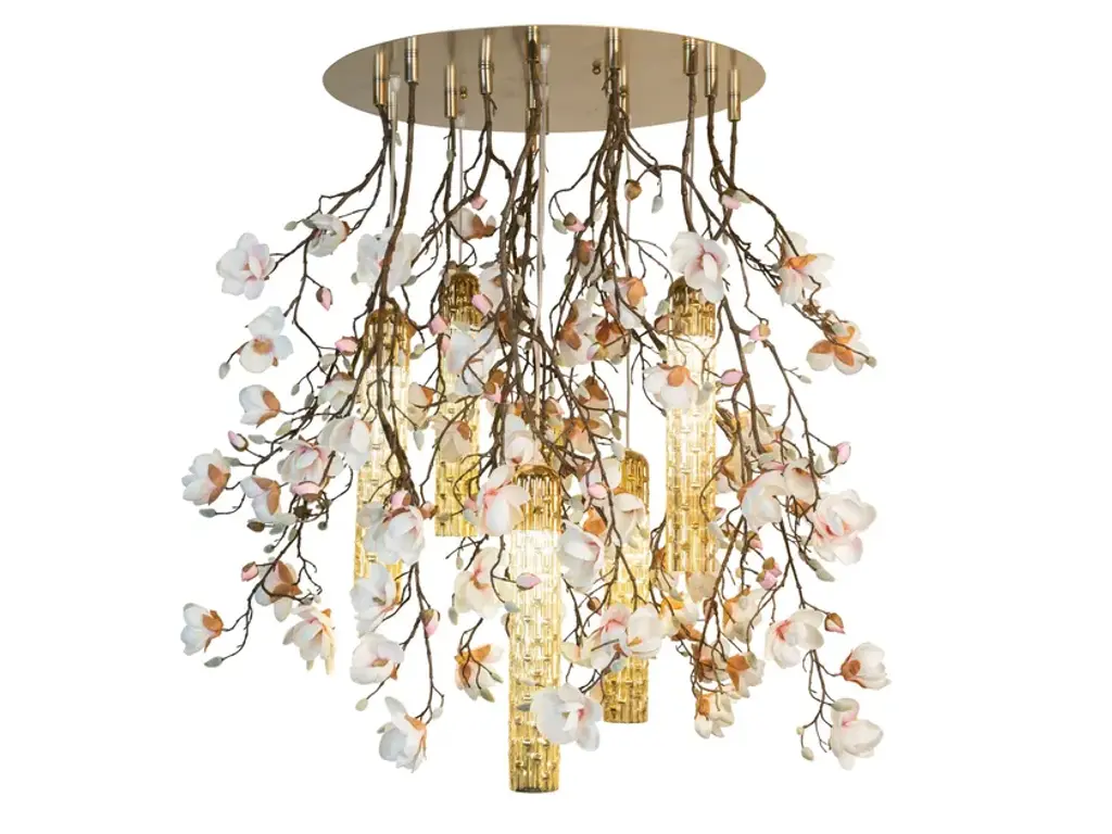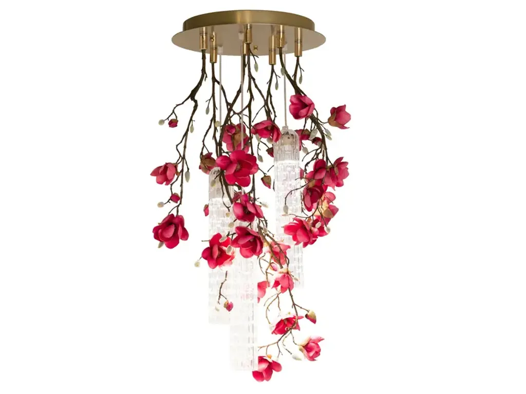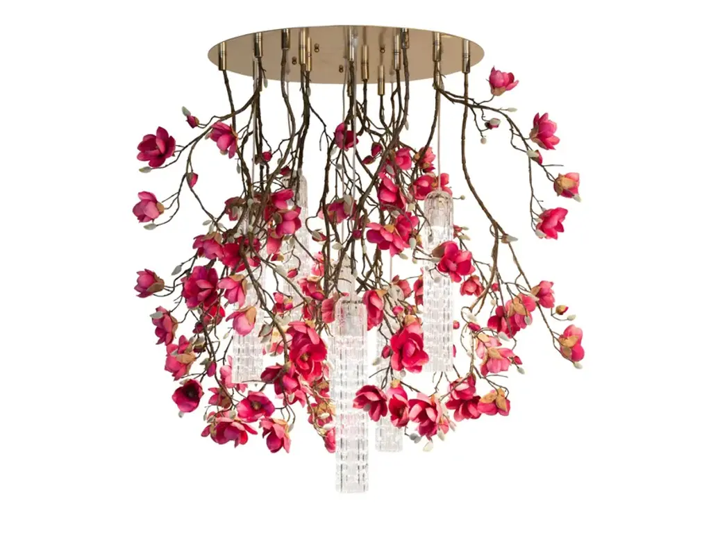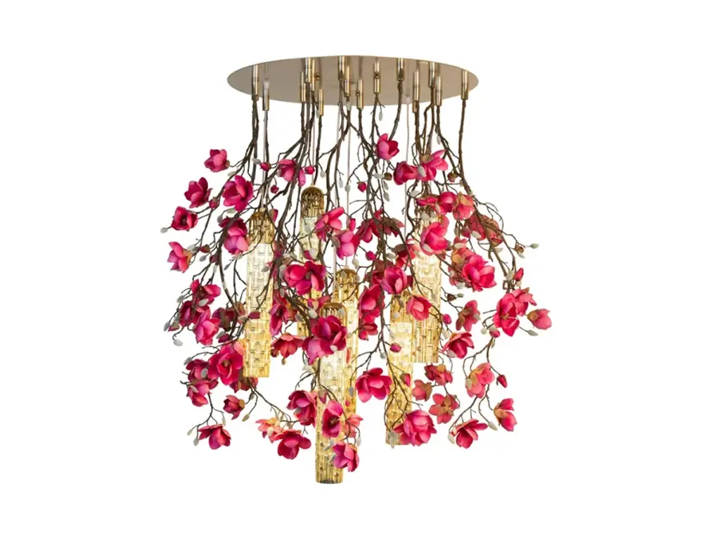 Flower Power Magnolia Round is a chandelier consisting of VG artificial flowers and pipes in Muranese glass, LED bulbs, fitted with fixing plate, to be suspended or ceiling mounted and painted according to the ceiling color. Available in version with VG fuchsia or pinkcream magnolias, with transparent or glossy gold Muranese glass. It's possible to have in two different siezes. Plate size is approx 15 cm shorter in lenght and width than volume dimensions.Product codeMagnolia round small (pink cream + transparent glass): 8880280.84Magnolia round small (fuchsia + transparent glass): 8880281.84Magnolia round big (pink cream + transparent glass): 8880290.84Magnolia round big (fuchsia + transparent glass): 8880291.84Magnolia round big (pink cream + glossy gold): 8880293.84Magnolia round big (fuchsia + glossy gold): 8880294.99Flower Power is a ceiling light source designed for both residential and contract spaces. An excellent solution as an ornamental object, but also as an efficient chandelier and spotlight: the match between functionality and design with a natural feel. A balancing act, combining transparent materials, bright colours and fascinating compositions. Flower Power brings together modular lighting and natural inspiration, a concept that draws on VG’s specialisation in designing artificial flowers, and thrives on continuous customisation. A chandelier whose lymph is imagination, the same one that turned the assumption of verticality upside down, roots in the air and stems down, letting leaves and flowers gracefully fall, entwined with exquisite Murano glass. The first Flower Power is born as an ode to Spring, to the awakening of nature, with the decisive and at the same time delicate shades of Tulips. The charm of flora has thus travelled through the seasons, interpreting this lighting element with Lotus and Phalenopsis flowers, with Ivy and Poppies.