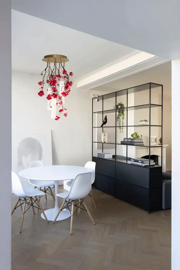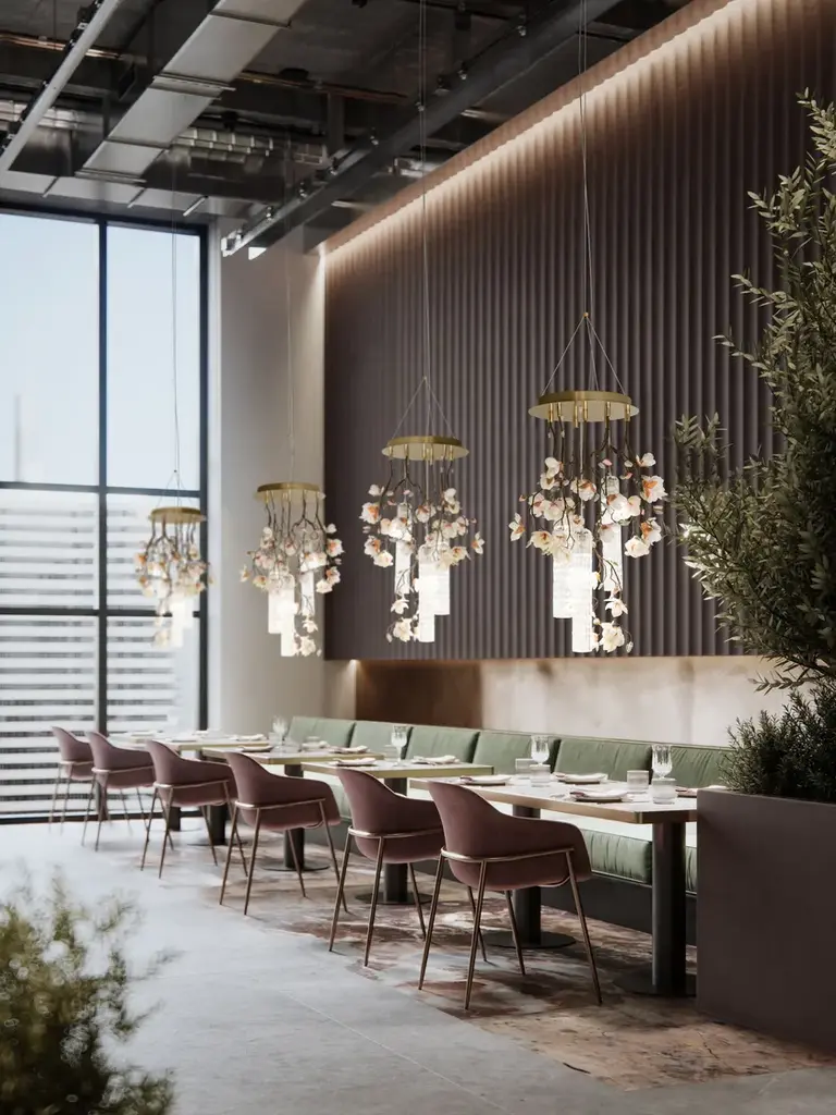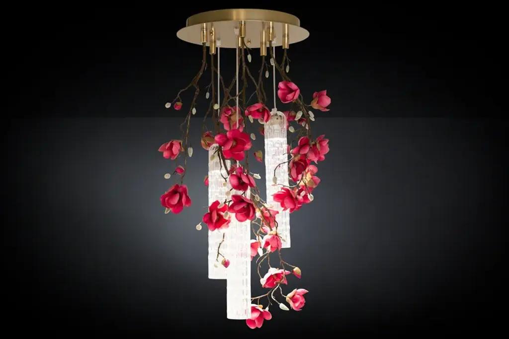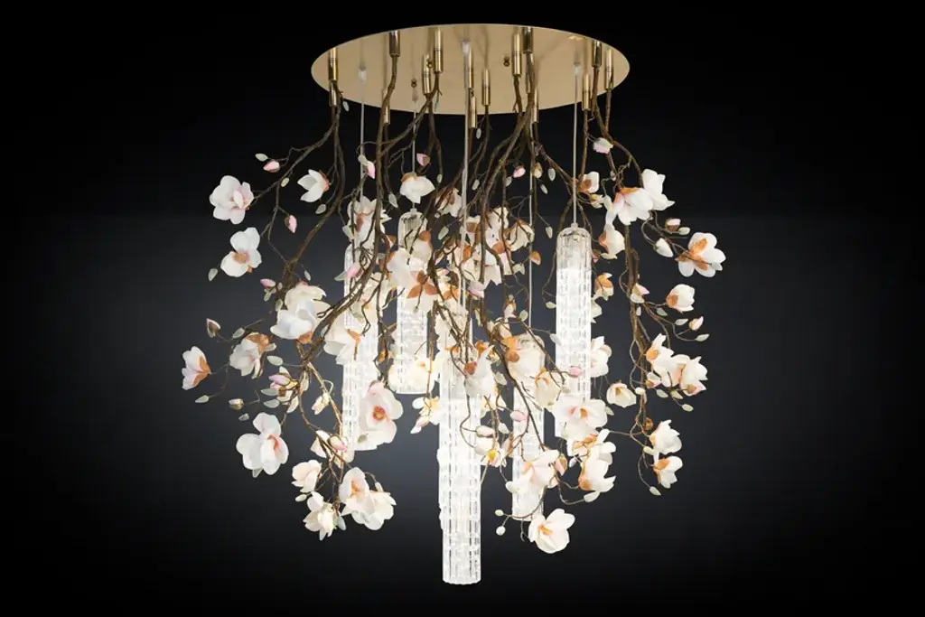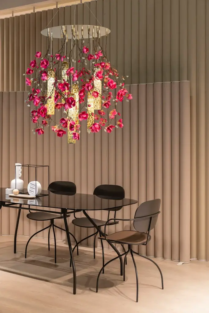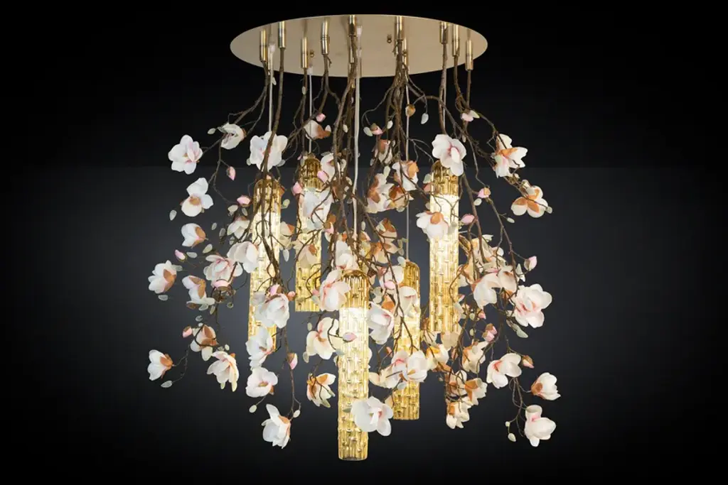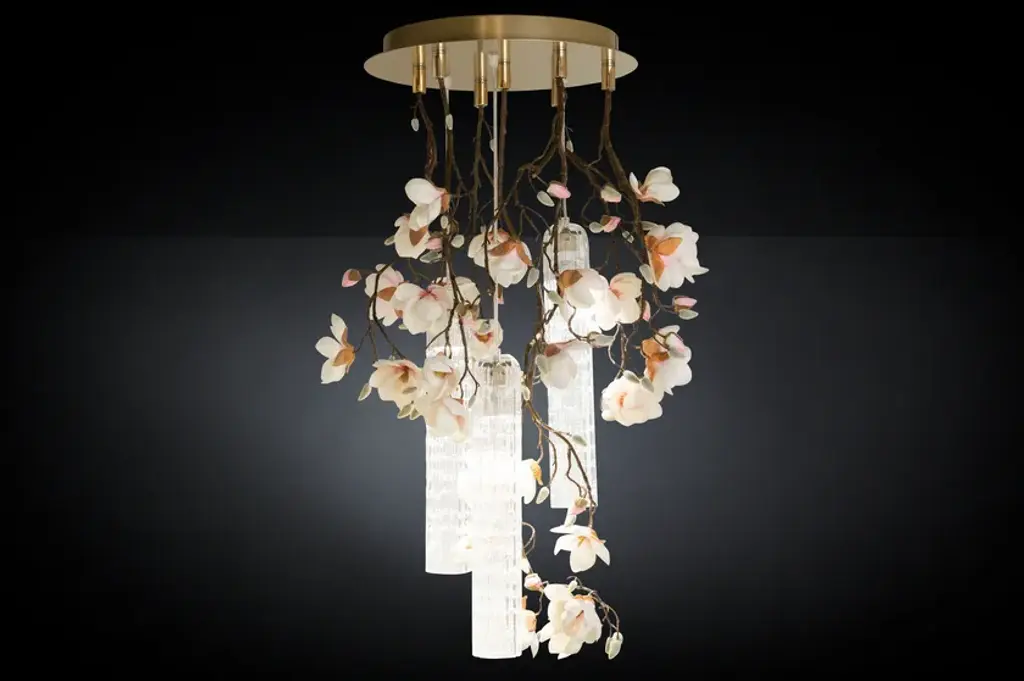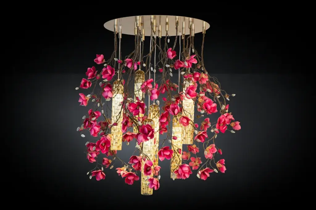 Flower Power Magnolia Round is a chandelier consisting of VG artificial flowers and pipes in Muranese glass, LED bulbs, fitted with fixing plate, to be suspended or ceiling mounted and painted according to the ceiling color. Available in version with VG fuchsia or pinkcream magnolias, with transparent or glossy gold Muranese glass. It's possible to have in two different siezes. Plate size is approx 15 cm shorter in lenght and width than volume dimensions.Product codeMagnolia round small (pink cream + transparent glass): 8880280.84Magnolia round small (fuchsia + transparent glass): 8880281.84Magnolia round big (pink cream + transparent glass): 8880290.84Magnolia round big (fuchsia + transparent glass): 8880291.84Magnolia round big (pink cream + glossy gold): 8880293.84Magnolia round big (fuchsia + glossy gold): 8880294.99Flower Power is a ceiling light source designed for both residential and contract spaces. An excellent solution as an ornamental object, but also as an efficient chandelier and spotlight: the match between functionality and design with a natural feel. A balancing act, combining transparent materials, bright colours and fascinating compositions. Flower Power brings together modular lighting and natural inspiration, a concept that draws on VG’s specialisation in designing artificial flowers, and thrives on continuous customisation. A chandelier whose lymph is imagination, the same one that turned the assumption of verticality upside down, roots in the air and stems down, letting leaves and flowers gracefully fall, entwined with exquisite Murano glass. The first Flower Power is born as an ode to Spring, to the awakening of nature, with the decisive and at the same time delicate shades of Tulips. The charm of flora has thus travelled through the seasons, interpreting this lighting element with Lotus and Phalenopsis flowers, with Ivy and Poppies.