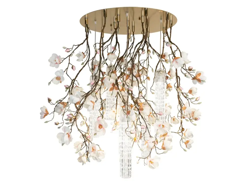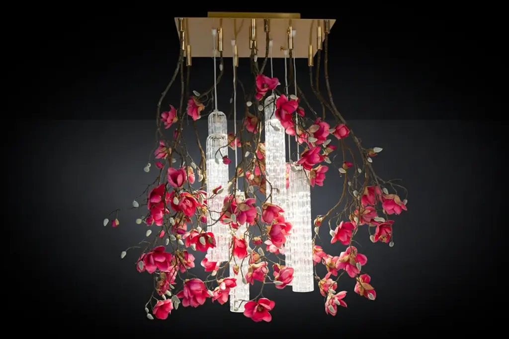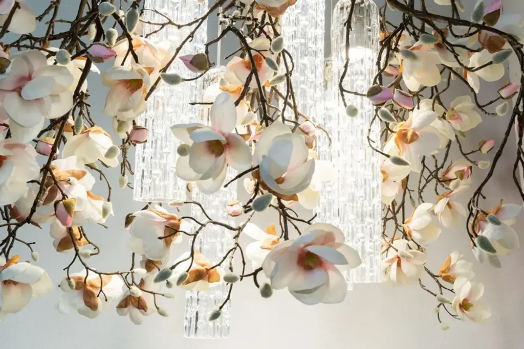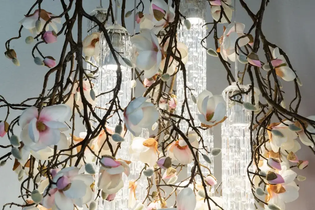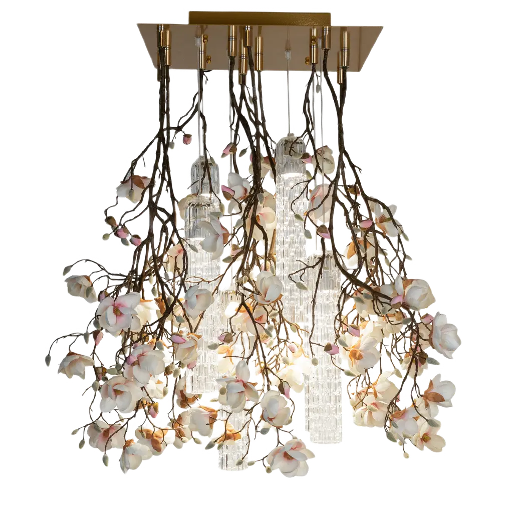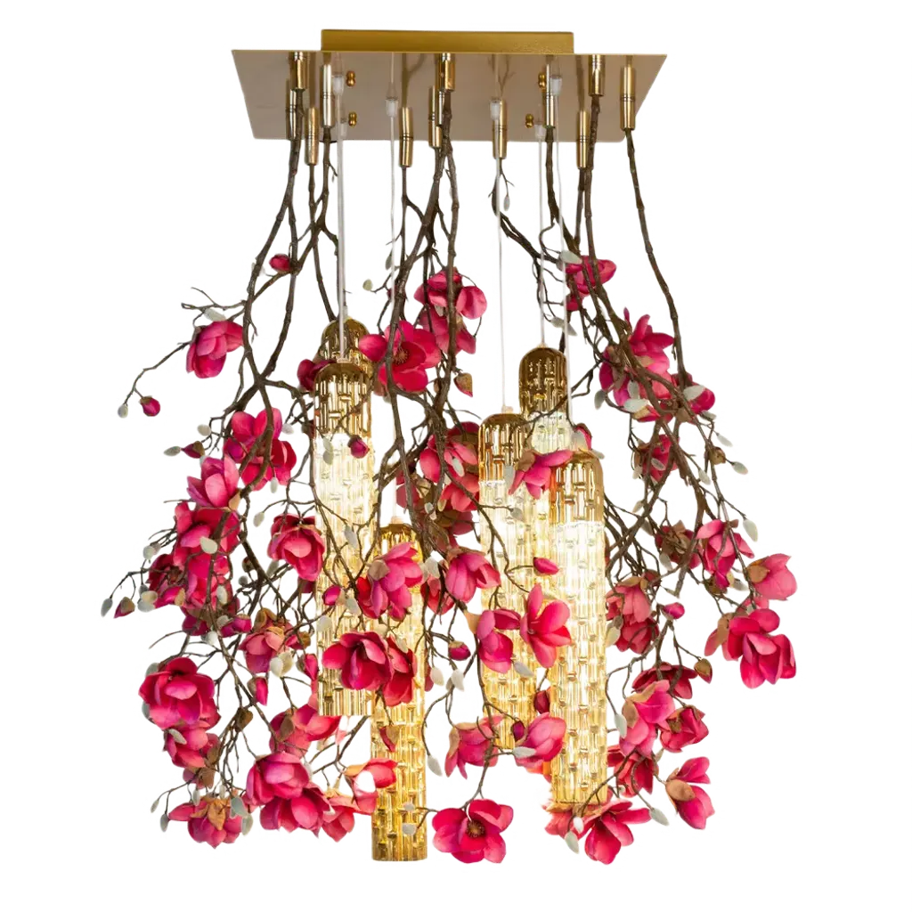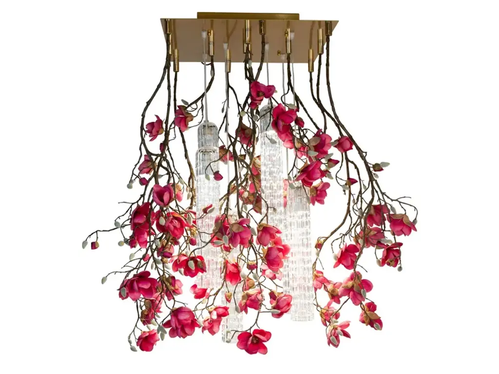 Flower Power Magnolia Square is a chandelier consisting of VG artificial flowers and pipes in Muranese glass, LED bulbs (6 bulbs GU10 x 6W each) fitted with fixing plate, to be suspended or ceiling mounted and painted according to the ceiling color. Available in the version with VG fuchsia or pinkcream magnolias and with transparent or glossy gold Muranese glass. Plate size is approx 15 cm shorter in lenght and width than volume dimensions.Product codeMagnolia square (pink cream + transparent glass): 8880270.99 Magnolia square (fuchsia + transparent glass): 8880271.99 Magnolia square (pink cream + glossy gold): 8880273.99 Magnolia square (fuchsia + glossy gold): 8880274.99Flower Power is a ceiling light source designed for both residential and contract spaces. An excellent solution as an ornamental object, but also as an efficient chandelier and spotlight: the match between functionality and design with a natural feel. A balancing act, combining transparent materials, bright colours and fascinating compositions. Flower Power brings together modular lighting and natural inspiration, a concept that draws on VG’s specialisation in designing artificial flowers, and thrives on continuous customisation. A chandelier whose lymph is imagination, the same one that turned the assumption of verticality upside down, roots in the air and stems down, letting leaves and flowers gracefully fall, entwined with exquisite Murano glass. The first Flower Power is born as an ode to Spring, to the awakening of nature, with the decisive and at the same time delicate shades of Tulips. The charm of flora has thus travelled through the seasons, interpreting this lighting element with Lotus and Phalenopsis flowers, with Ivy and Poppies.