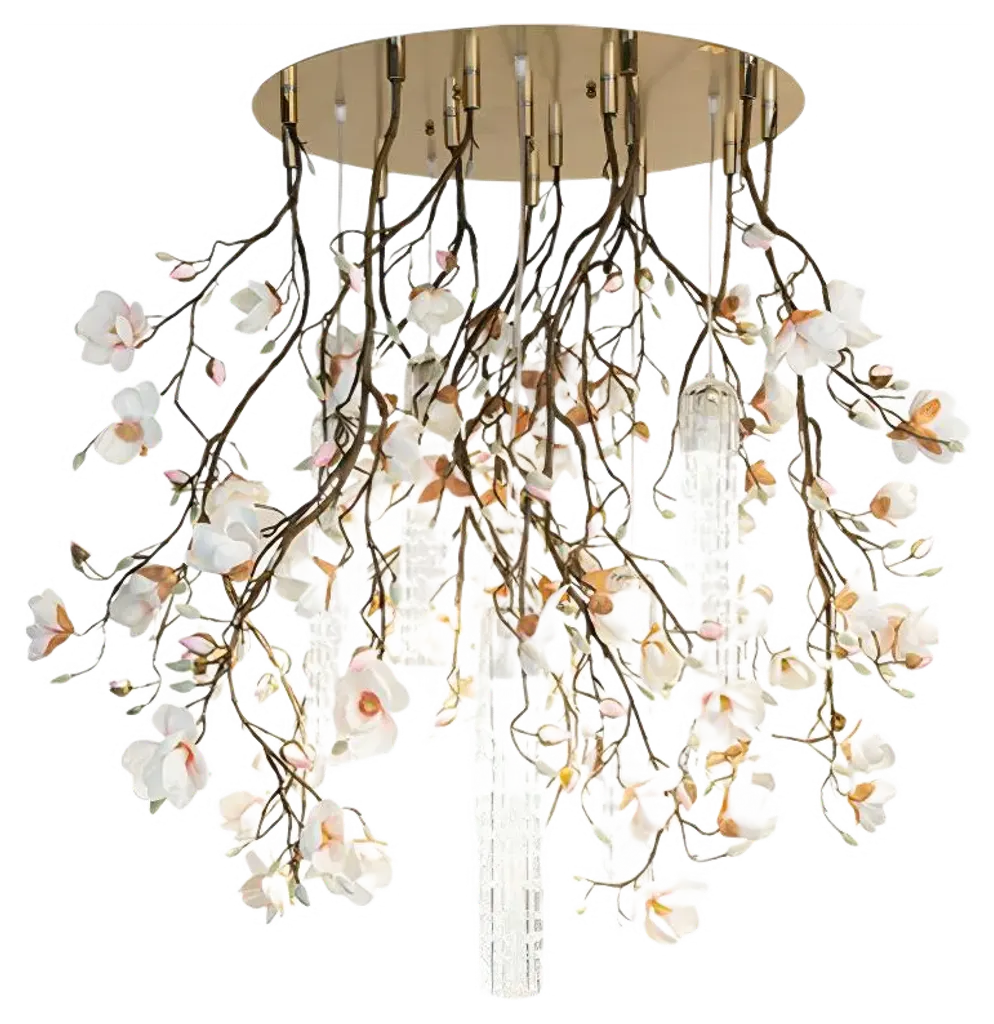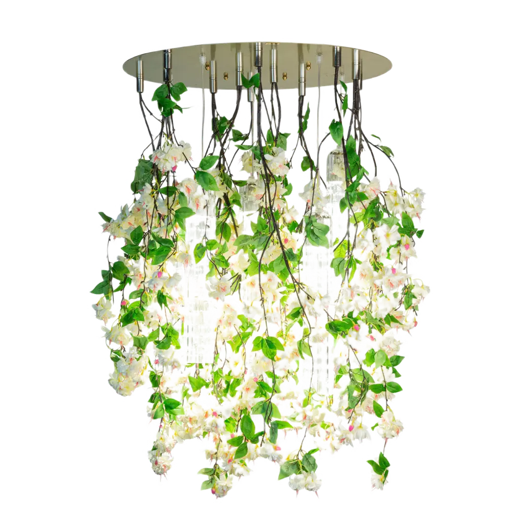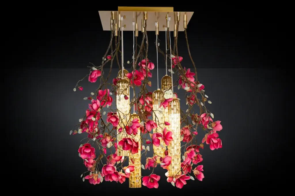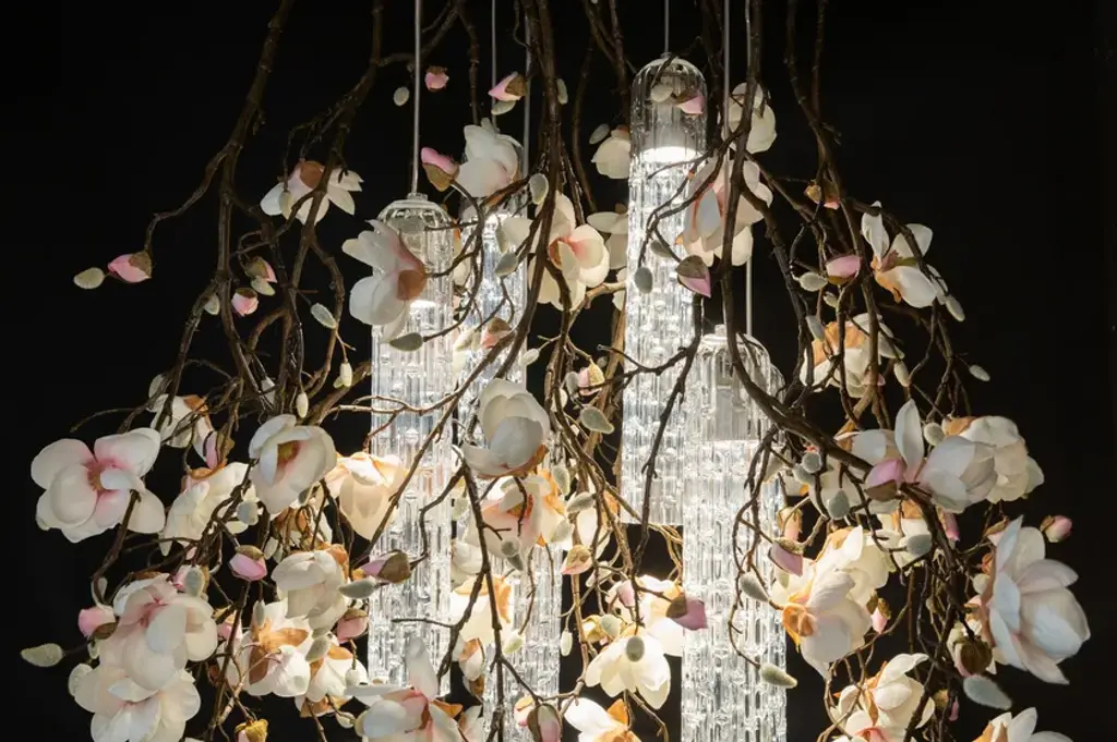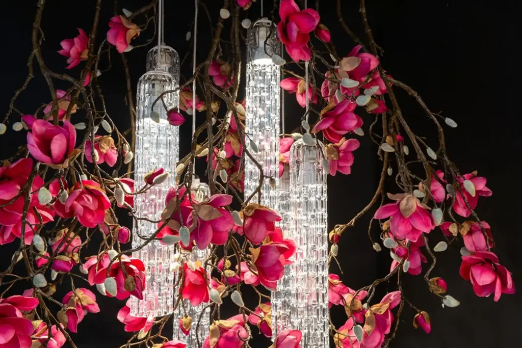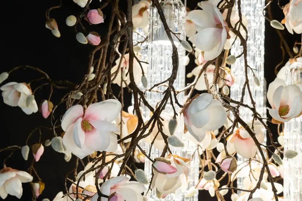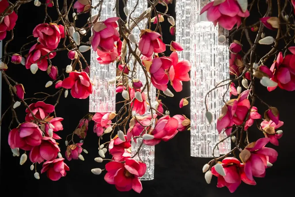 Flower Power Magnolia Square is a chandelier consisting of VG artificial flowers and pipes in Muranese glass, LED bulbs (6 bulbs GU10 x 6W each) fitted with fixing plate, to be suspended or ceiling mounted and painted according to the ceiling color. Available in the version with VG fuchsia or pinkcream magnolias and with transparent or glossy gold Muranese glass. Plate size is approx 15 cm shorter in lenght and width than volume dimensions.Product codeMagnolia square (pink cream + transparent glass): 8880270.99 Magnolia square (fuchsia + transparent glass): 8880271.99 Magnolia square (pink cream + glossy gold): 8880273.99 Magnolia square (fuchsia + glossy gold): 8880274.99Flower Power is a ceiling light source designed for both residential and contract spaces. An excellent solution as an ornamental object, but also as an efficient chandelier and spotlight: the match between functionality and design with a natural feel. A balancing act, combining transparent materials, bright colours and fascinating compositions. Flower Power brings together modular lighting and natural inspiration, a concept that draws on VG’s specialisation in designing artificial flowers, and thrives on continuous customisation. A chandelier whose lymph is imagination, the same one that turned the assumption of verticality upside down, roots in the air and stems down, letting leaves and flowers gracefully fall, entwined with exquisite Murano glass. The first Flower Power is born as an ode to Spring, to the awakening of nature, with the decisive and at the same time delicate shades of Tulips. The charm of flora has thus travelled through the seasons, interpreting this lighting element with Lotus and Phalenopsis flowers, with Ivy and Poppies.