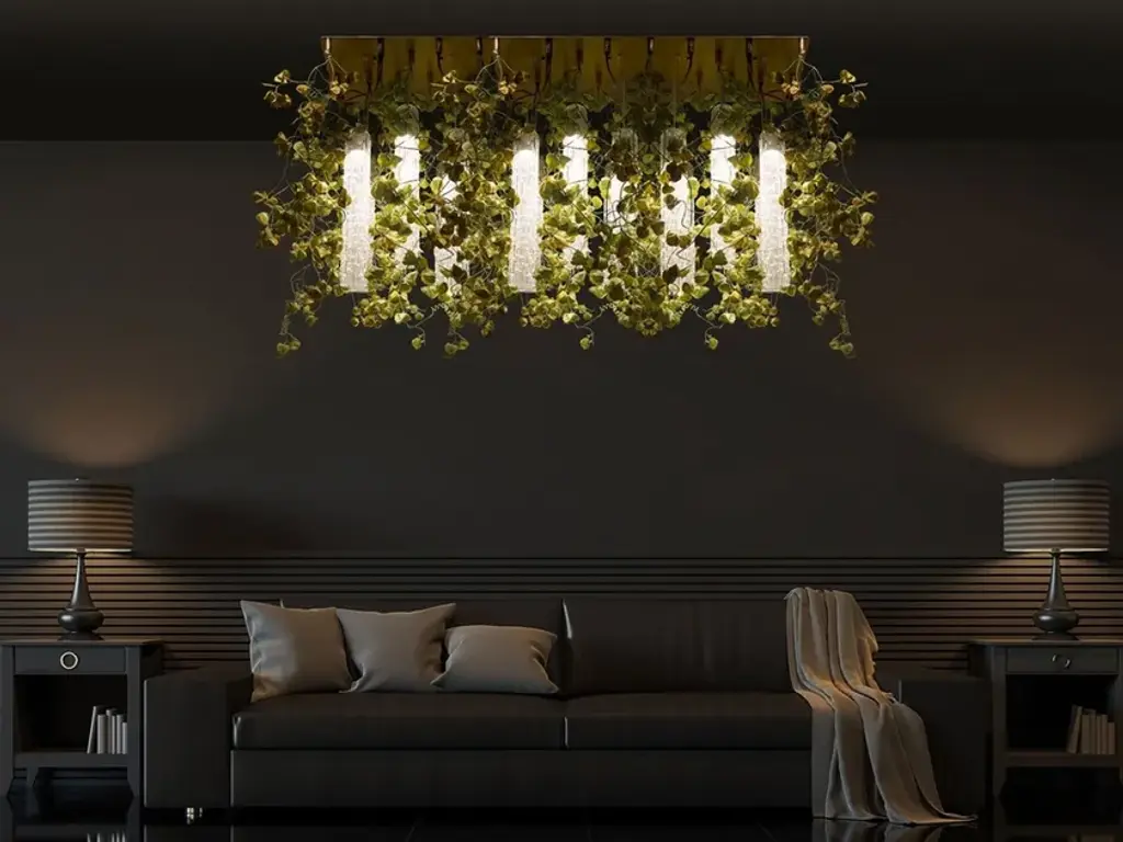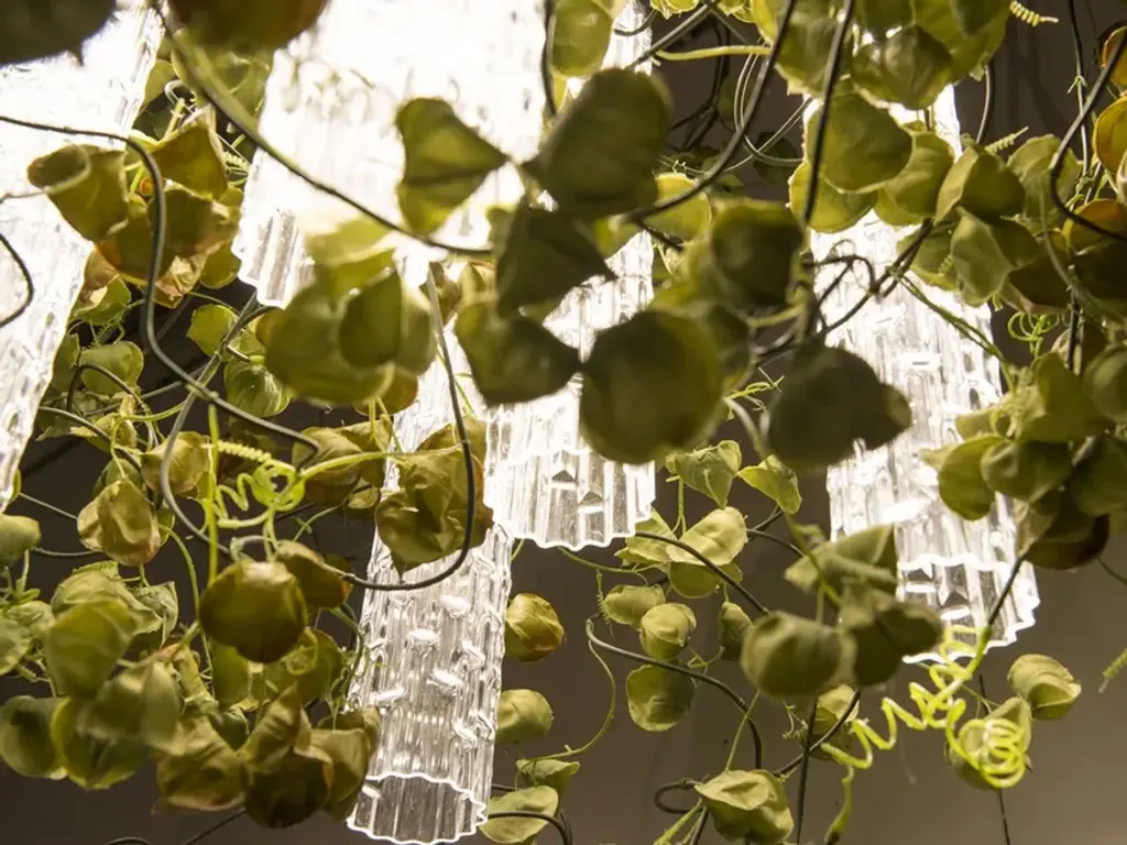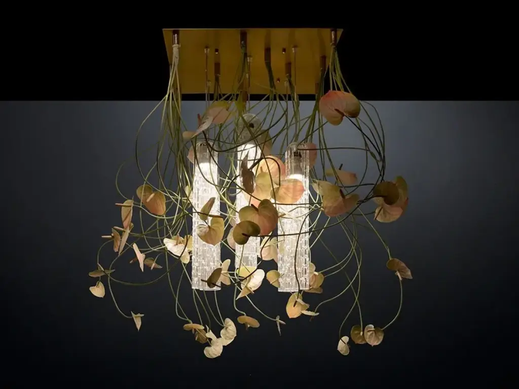 Chandelier consisting of VG artificial flowers and pipes in Muranese glass, LED bulbs fitted with fixing plate, to be suspended or built-in and painted according to colour of the ceiling. Plate size is 15 cm shorter in lenght and width than volume dimensions.Available as:FLOWER POWER CHANDELIER - PHYSALIS/6 CLEAR PIPES - 65 x 65 x h 80 cm - LED GU10 6 x 7WCode: 8880041.00FLOWER POWER CHANDELIER - PHYSALIS / 10 TRANSPARENT TUBES - 105 x 60 x h 80 cm - LED GU10 10 x 7WCode: 8880042. 00Flower Power is a ceiling light source designed for both residential and contract spaces. An excellent solution as an ornamental object, but also as an efficient chandelier and spotlight: the match between functionality and design with a natural feel. A balancing act, combining transparent materials, bright colours and fascinating compositions. Flower Power brings together modular lighting and natural inspiration, a concept that draws on VG’s specialisation in designing artificial flowers, and thrives on continuous customisation. A chandelier whose lymph is imagination, the same one that turned the assumption of verticality upside down, roots in the air and stems down, letting leaves and flowers gracefully fall, entwined with exquisite Murano glass. The first Flower Power is born as an ode to Spring, to the awakening of nature, with the decisive and at the same time delicate shades of Tulips. The charm of flora has thus travelled through the seasons, interpreting this lighting element with Lotus and Phalenopsis flowers, with Ivy and Poppies.