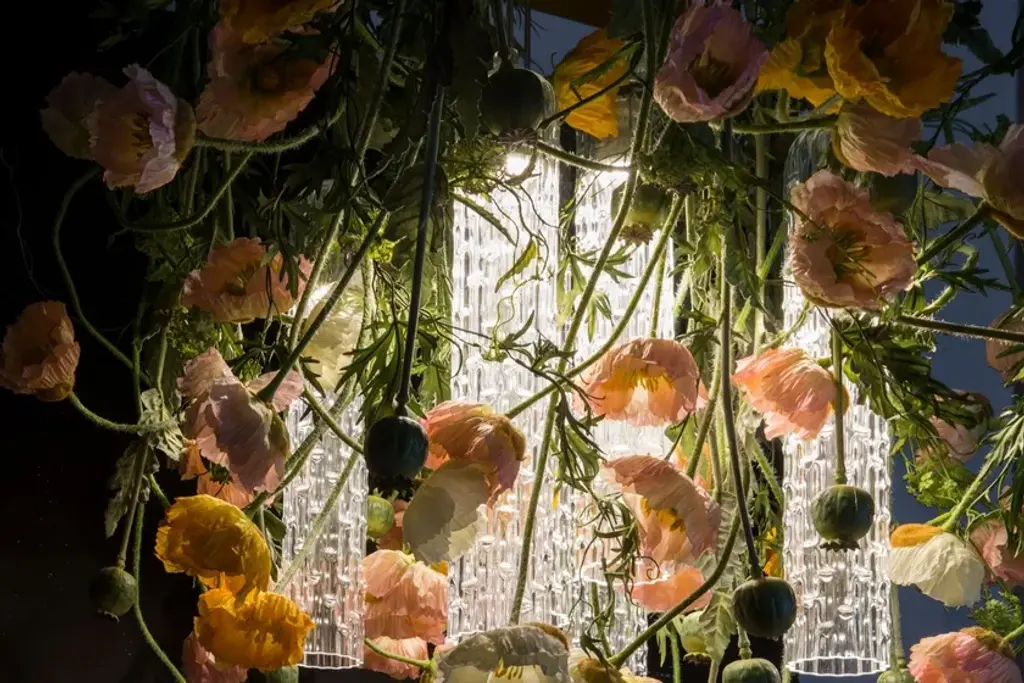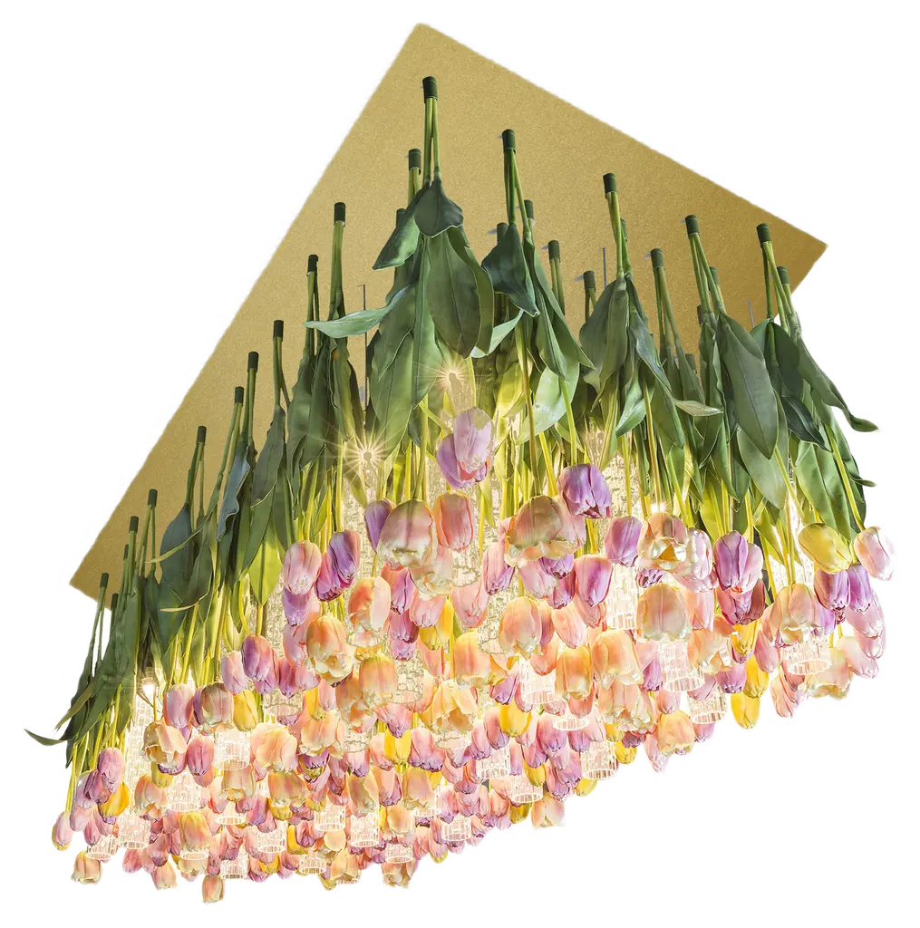Flower Power Poppy Square is a chandelier consisting of VG artificial flowers and pipes in Muranese glass, LED bulbs fitted with fixing plate, to be suspended or built-in and painted according to colour of the ceiling.Plate size is 15 cm shorter in lenght and width than volume dimensions.Flower Power is a ceiling light source designed for both residential and contract spaces. An excellent solution as an ornamental object, but also as an efficient chandelier and spotlight: the match between functionality and design with a natural feel. A balancing act, combining transparent materials, bright colours and fascinating compositions. Flower Power brings together modular lighting and natural inspiration, a concept that draws on VG’s specialisation in designing artificial flowers, and thrives on continuous customisation. A chandelier whose lymph is imagination, the same one that turned the assumption of verticality upside down, roots in the air and stems down, letting leaves and flowers gracefully fall, entwined with exquisite Murano glass. The first Flower Power is born as an ode to Spring, to the awakening of nature, with the decisive and at the same time delicate shades of Tulips. The charm of flora has thus travelled through the seasons, interpreting this lighting element with Lotus and Phalenopsis flowers, with Ivy and Poppies.