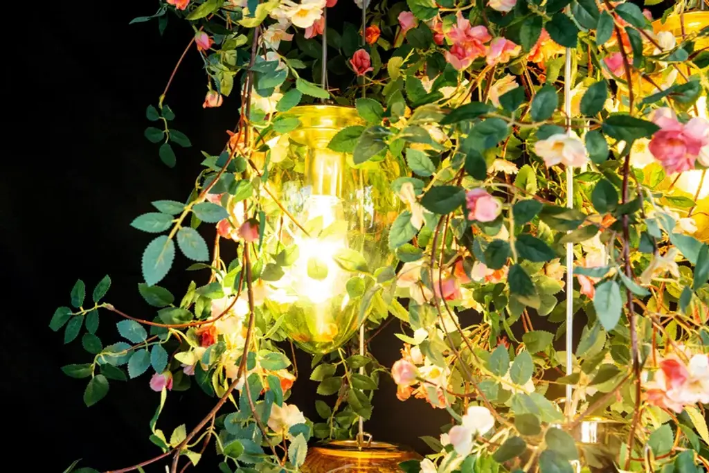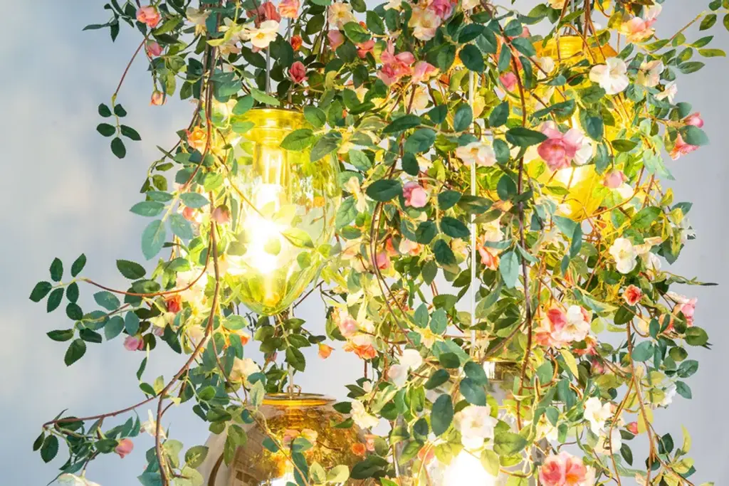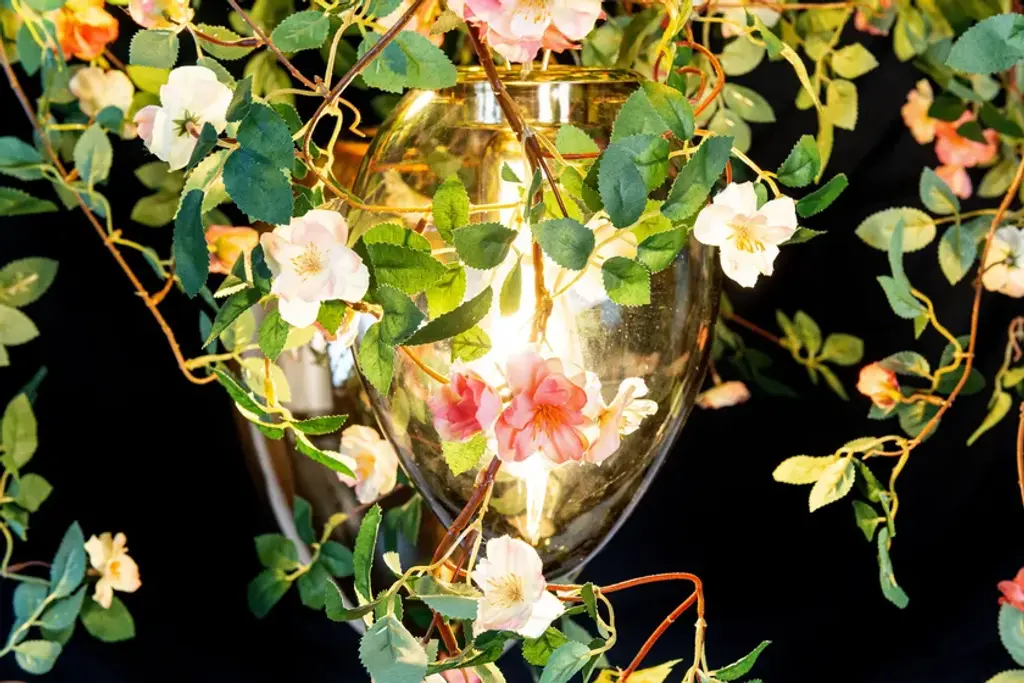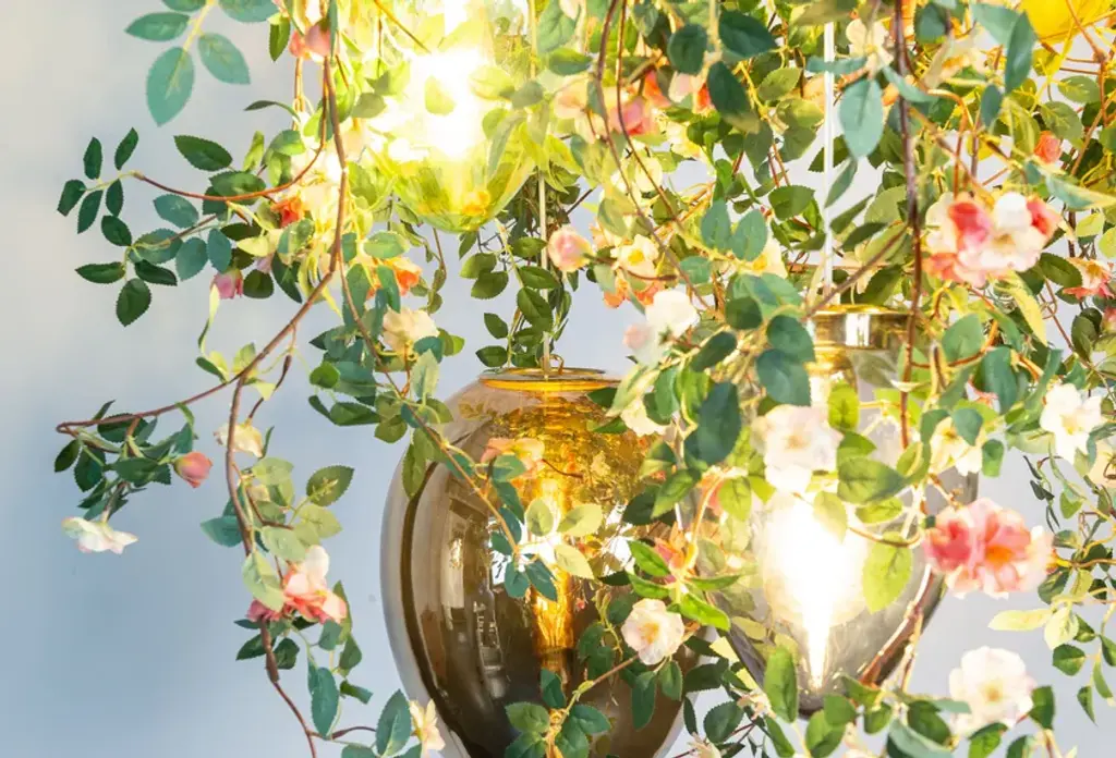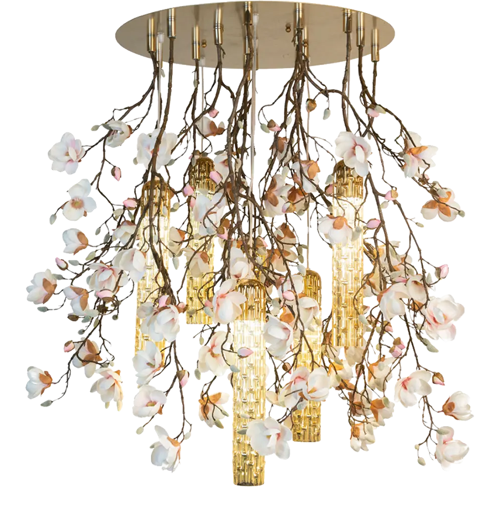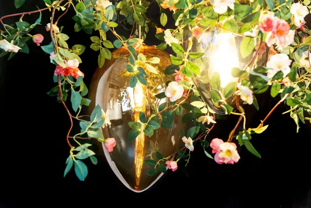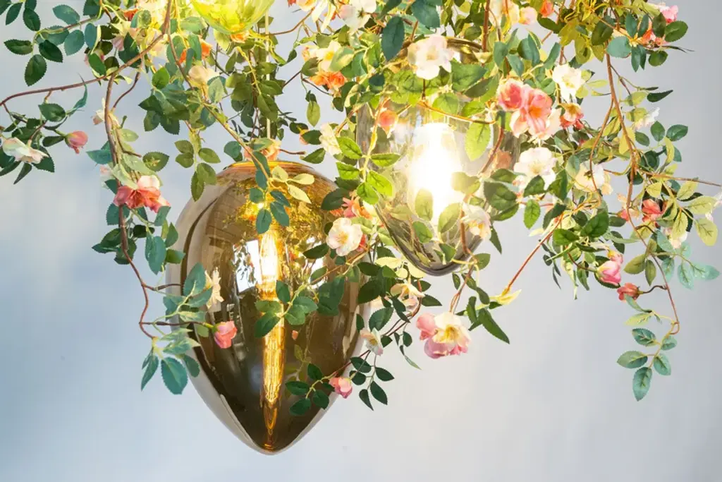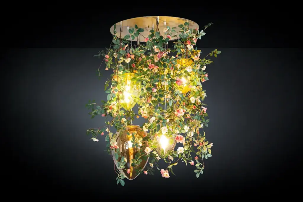 Flower Power Romantic Roses is a chandelier consisting of VG artificial flowers and Crystal Egg pendant, LED bulbs (4 bulbs E27 x 8W each) fitted with fixing plate, to be suspended or ceiling mounted. Plate size is approx 15 cm shorter in lenght and width than volume dimensions.Flower Power is a ceiling light source designed for both residential and contract spaces. An excellent solution as an ornamental object, but also as an efficient chandelier and spotlight: the match between functionality and design with a natural feel. A balancing act, combining transparent materials, bright colours and fascinating compositions. Flower Power brings together modular lighting and natural inspiration, a concept that draws on VG’s specialisation in designing artificial flowers, and thrives on continuous customisation. A chandelier whose lymph is imagination, the same one that turned the assumption of verticality upside down, roots in the air and stems down, letting leaves and flowers gracefully fall, entwined with exquisite Murano glass. The first Flower Power is born as an ode to Spring, to the awakening of nature, with the decisive and at the same time delicate shades of Tulips. The charm of flora has thus travelled through the seasons, interpreting this lighting element with Lotus and Phalenopsis flowers, with Ivy and Poppies.