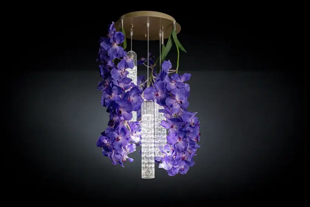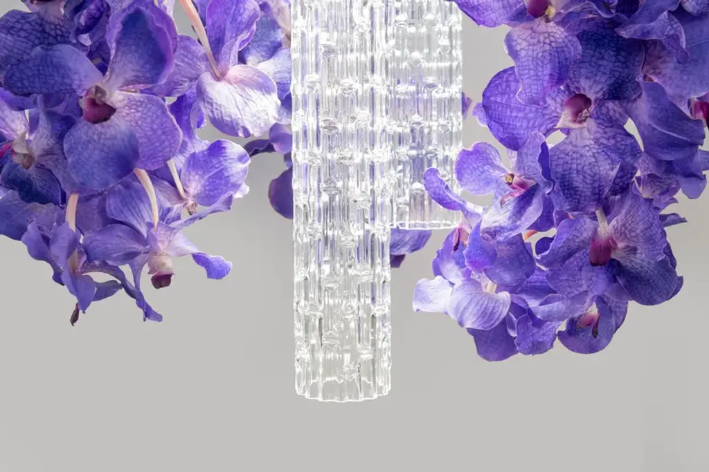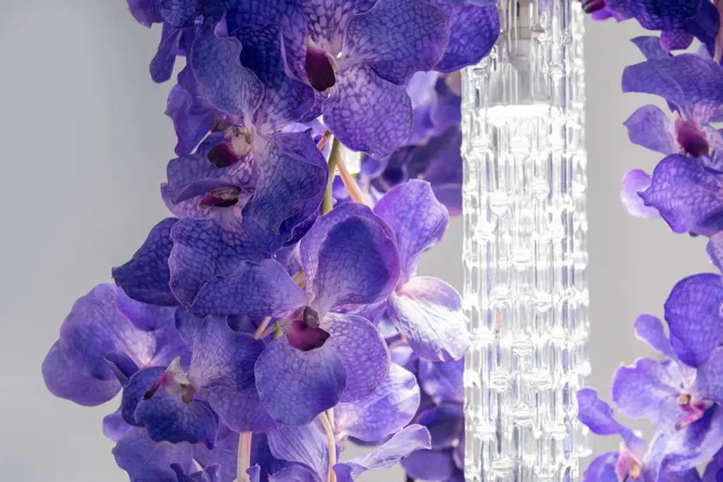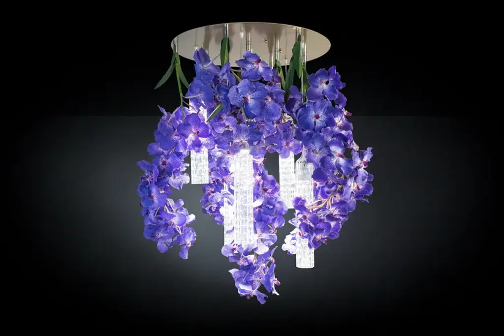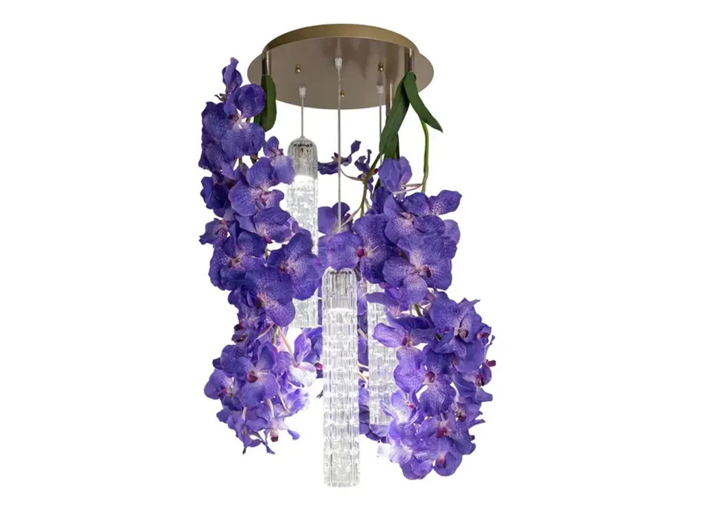 Flower Power Vanda Round is a chandelier consisting of VG artificial flowers and pipes in Muranese glass, LED bulbs, fitted with fixing plate, to be suspended or ceiling mounted and painted according to the ceiling color. Plate size is approx 15 cm shorter in lenght and width than volume dimensions.Available in two sizes.Product codeSmall size: 8880370.84Large size: 8880360.84Flower Power is a ceiling light source designed for both residential and contract spaces. An excellent solution as an ornamental object, but also as an efficient chandelier and spotlight: the match between functionality and design with a natural feel. A balancing act, combining transparent materials, bright colours and fascinating compositions. Flower Power brings together modular lighting and natural inspiration, a concept that draws on VG’s specialisation in designing artificial flowers, and thrives on continuous customisation. A chandelier whose lymph is imagination, the same one that turned the assumption of verticality upside down, roots in the air and stems down, letting leaves and flowers gracefully fall, entwined with exquisite Murano glass. The first Flower Power is born as an ode to Spring, to the awakening of nature, with the decisive and at the same time delicate shades of Tulips. The charm of flora has thus travelled through the seasons, interpreting this lighting element with Lotus and Phalenopsis flowers, with Ivy and Poppies.