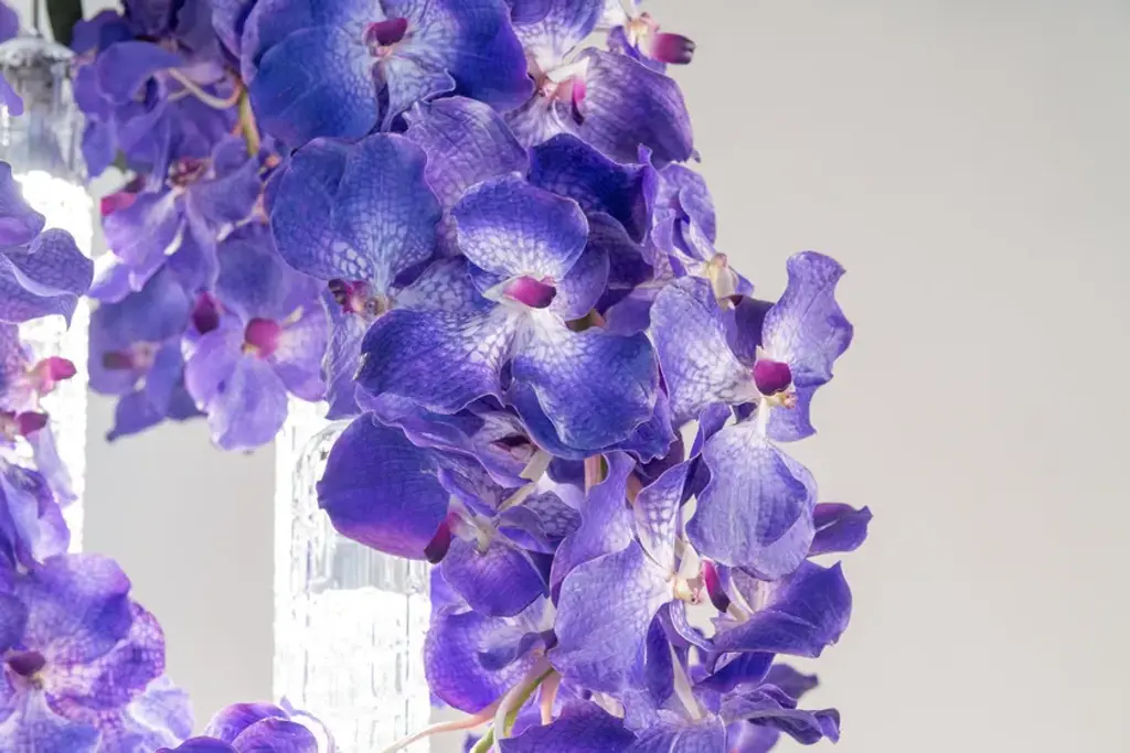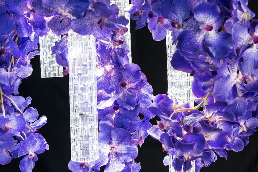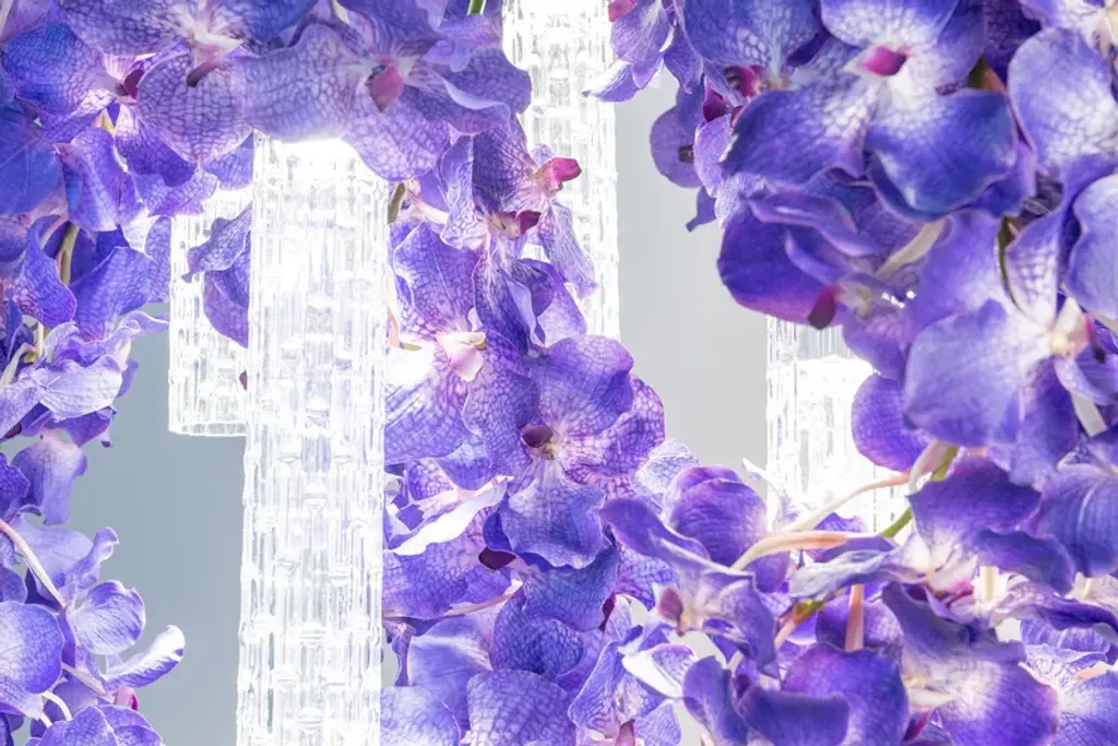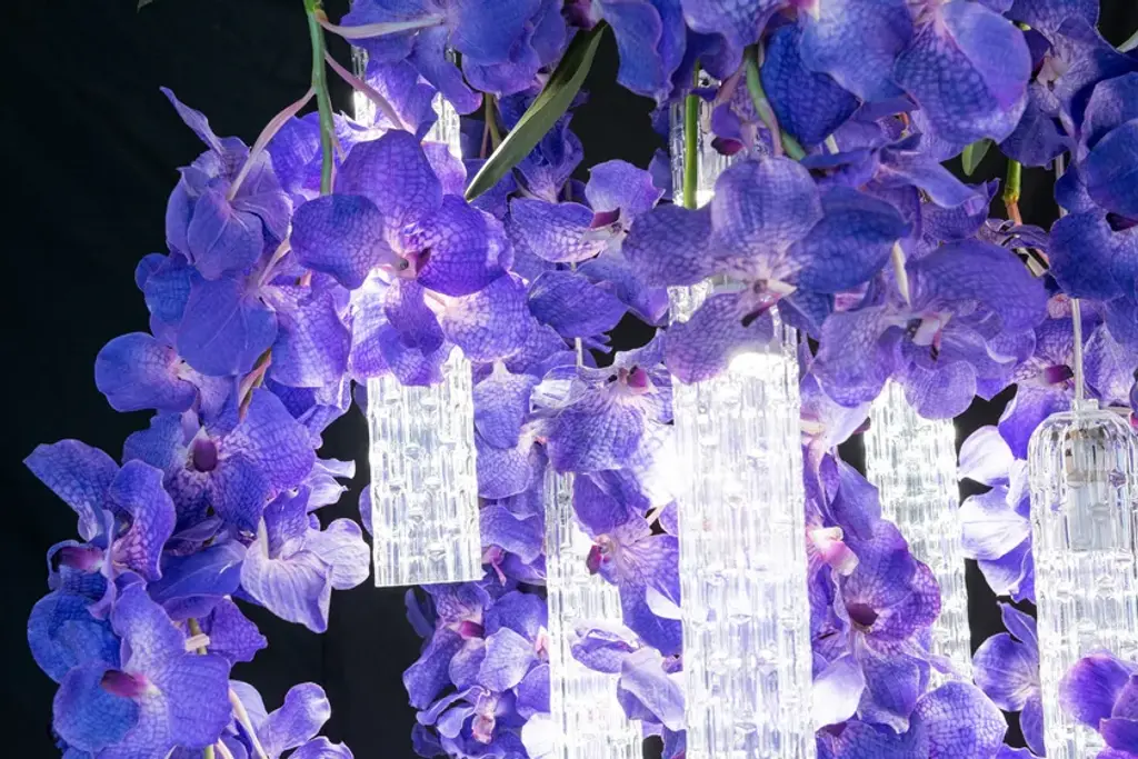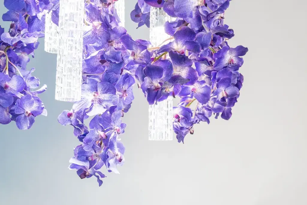 Flower Power Vanda Round is a chandelier consisting of VG artificial flowers and pipes in Muranese glass, LED bulbs, fitted with fixing plate, to be suspended or ceiling mounted and painted according to the ceiling color. Plate size is approx 15 cm shorter in lenght and width than volume dimensions.Available in two sizes.Product codeSmall size: 8880370.84Large size: 8880360.84Flower Power is a ceiling light source designed for both residential and contract spaces. An excellent solution as an ornamental object, but also as an efficient chandelier and spotlight: the match between functionality and design with a natural feel. A balancing act, combining transparent materials, bright colours and fascinating compositions. Flower Power brings together modular lighting and natural inspiration, a concept that draws on VG’s specialisation in designing artificial flowers, and thrives on continuous customisation. A chandelier whose lymph is imagination, the same one that turned the assumption of verticality upside down, roots in the air and stems down, letting leaves and flowers gracefully fall, entwined with exquisite Murano glass. The first Flower Power is born as an ode to Spring, to the awakening of nature, with the decisive and at the same time delicate shades of Tulips. The charm of flora has thus travelled through the seasons, interpreting this lighting element with Lotus and Phalenopsis flowers, with Ivy and Poppies.