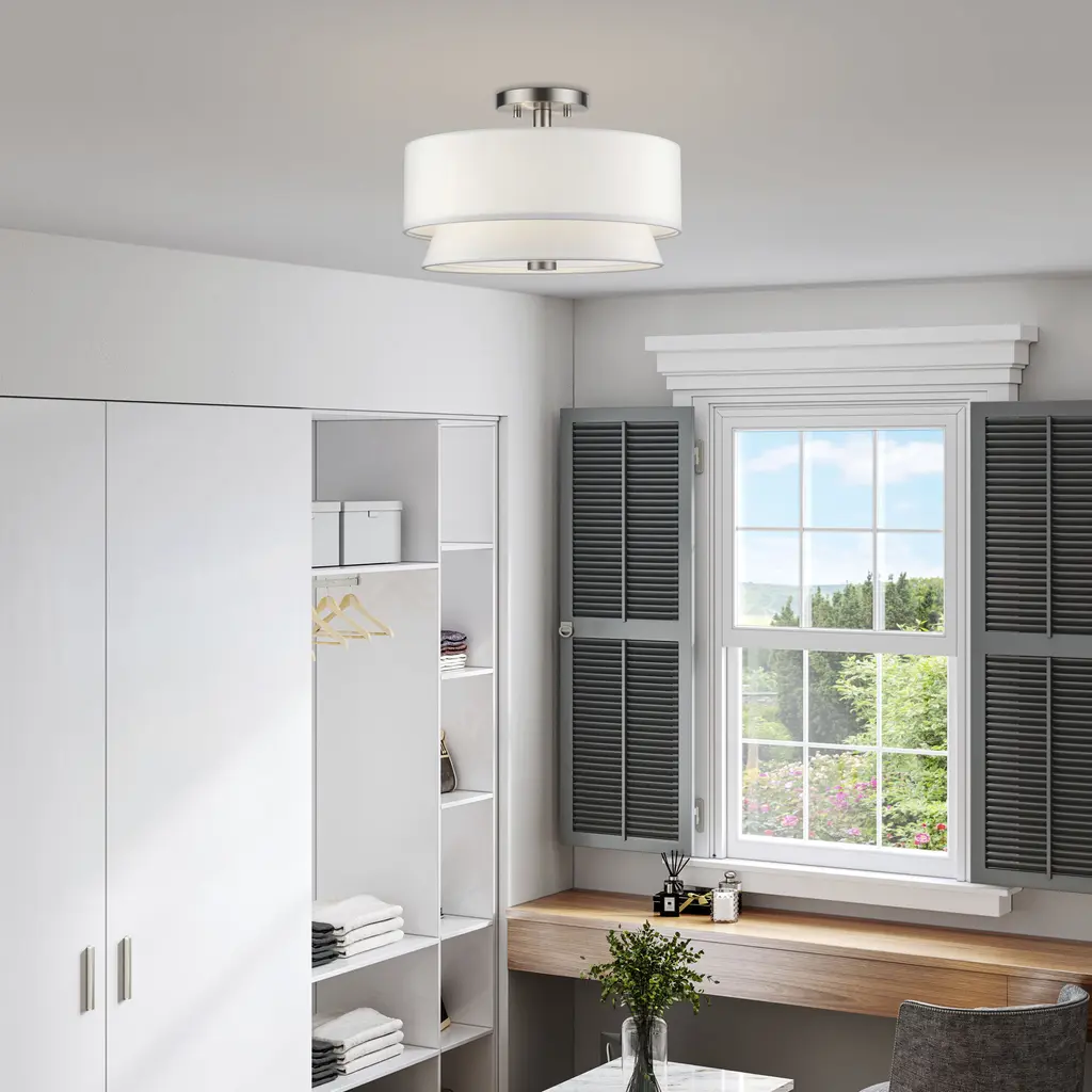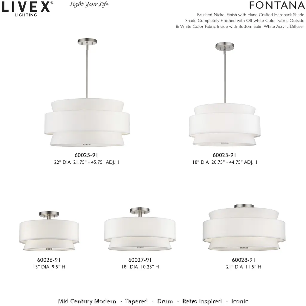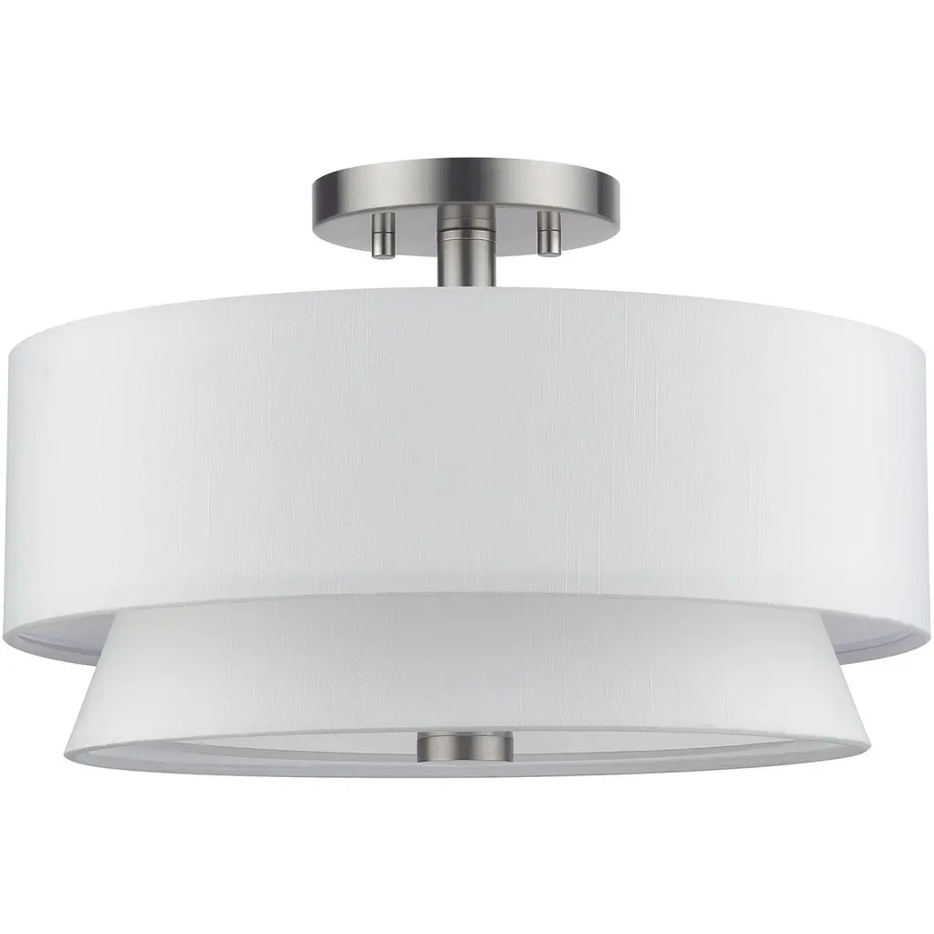 Update your decor with the clean styling of this contemporary three light large semi-flush light from the Fontana collection. A double drum shade adds character to this handsomely styled brushed nickel finish light. It features a lovely hand crafted off