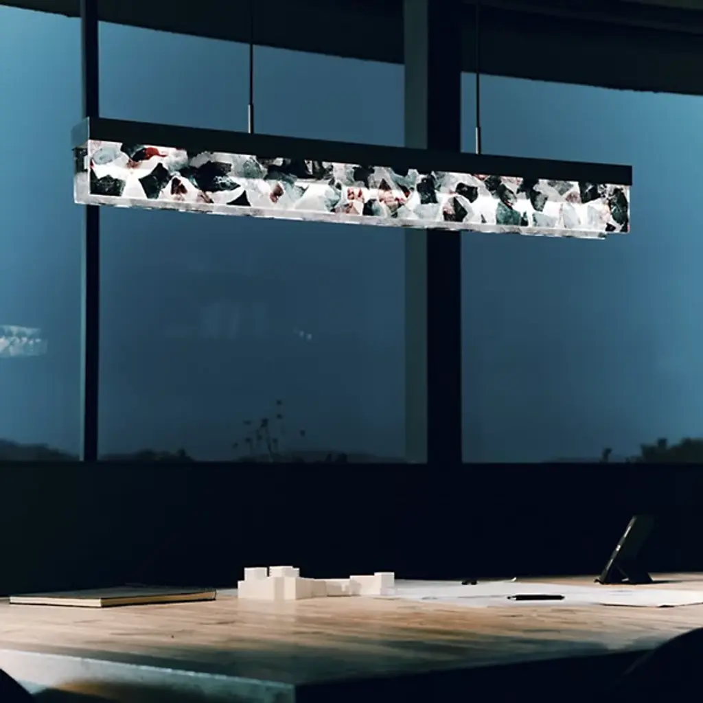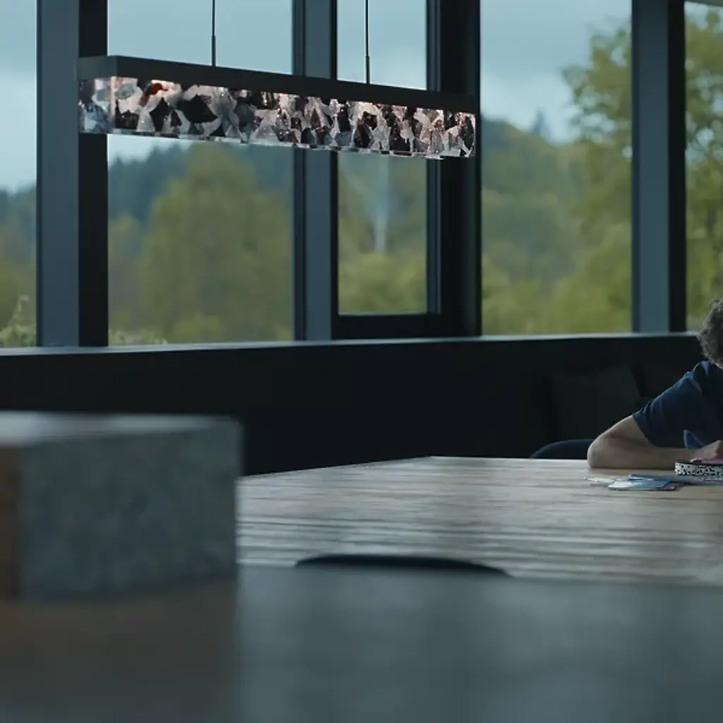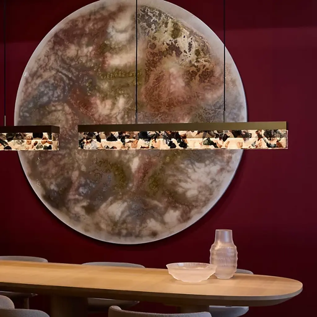 The Fragment LED Linear Suspension from Bomma arranges upcycled Fragmentglass pieces along a horizontal axis. Designed by Studio DECHEM, a steel suspension system supports multiple faceted glass elements that catch and refract light along the fixture's length. This horizontal orientation transforms the repurposed crystal into a composition that reads as a continuous line rather than individual points. Light interacts with the textured, irregular surfaces of the reclaimed glass as it travels through the linear arrangement.