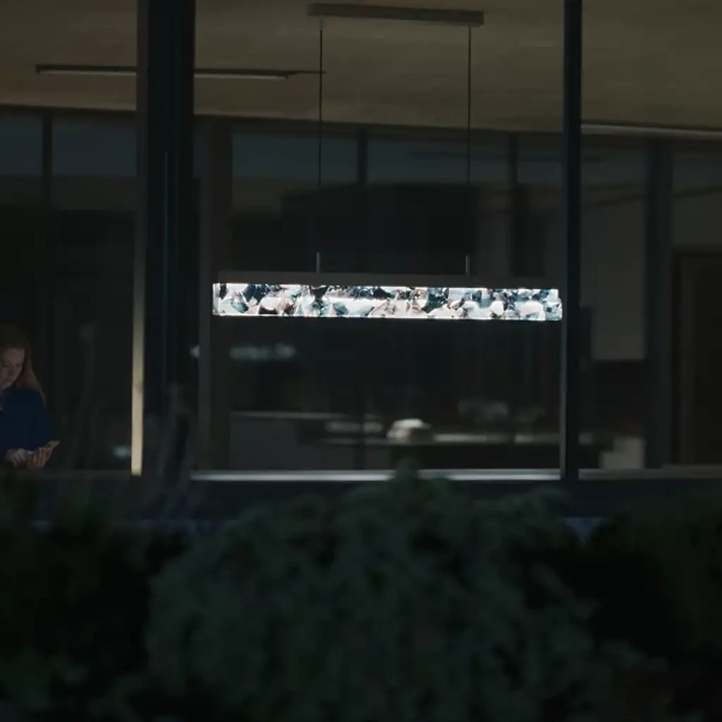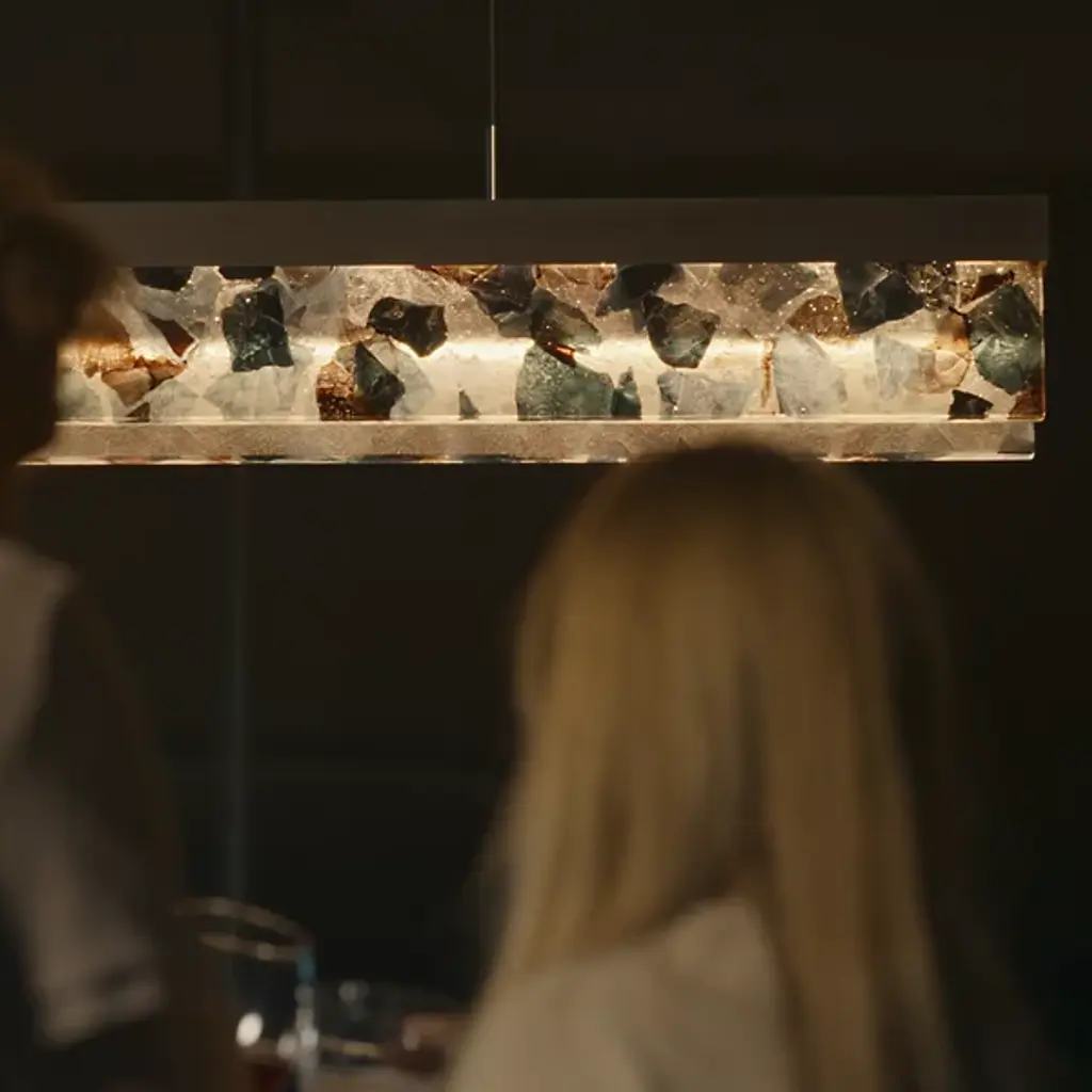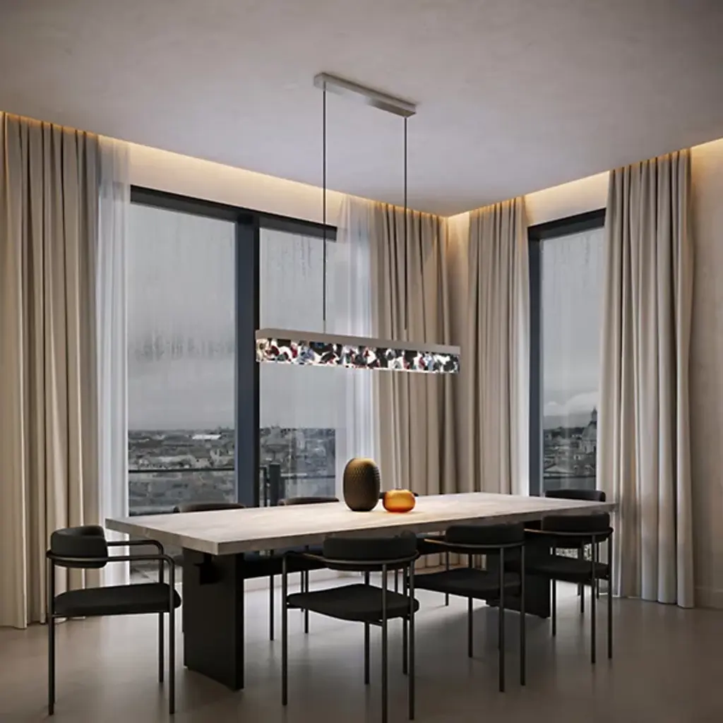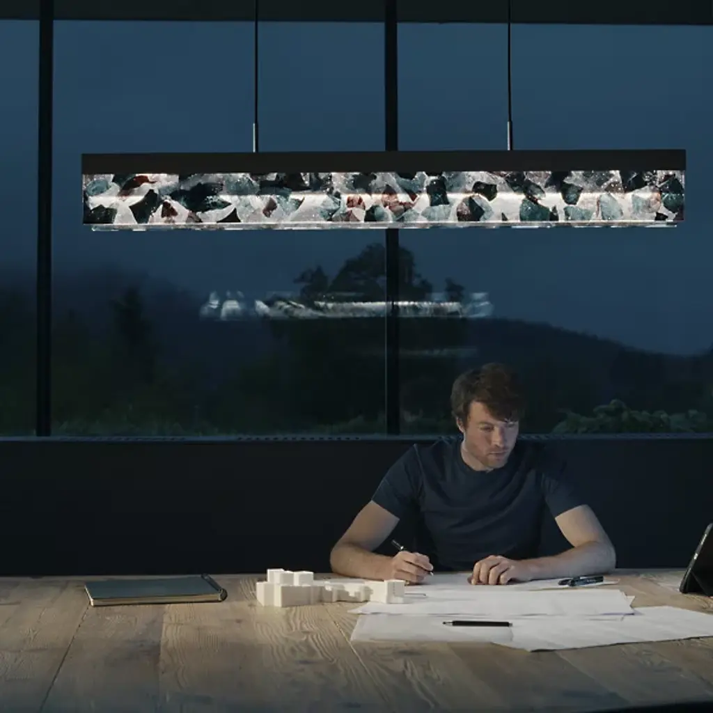 The Fragment LED Linear Suspension from Bomma arranges upcycled Fragmentglass pieces along a horizontal axis. Designed by Studio DECHEM, a steel suspension system supports multiple faceted glass elements that catch and refract light along the fixture's length. This horizontal orientation transforms the repurposed crystal into a composition that reads as a continuous line rather than individual points. Light interacts with the textured, irregular surfaces of the reclaimed glass as it travels through the linear arrangement.