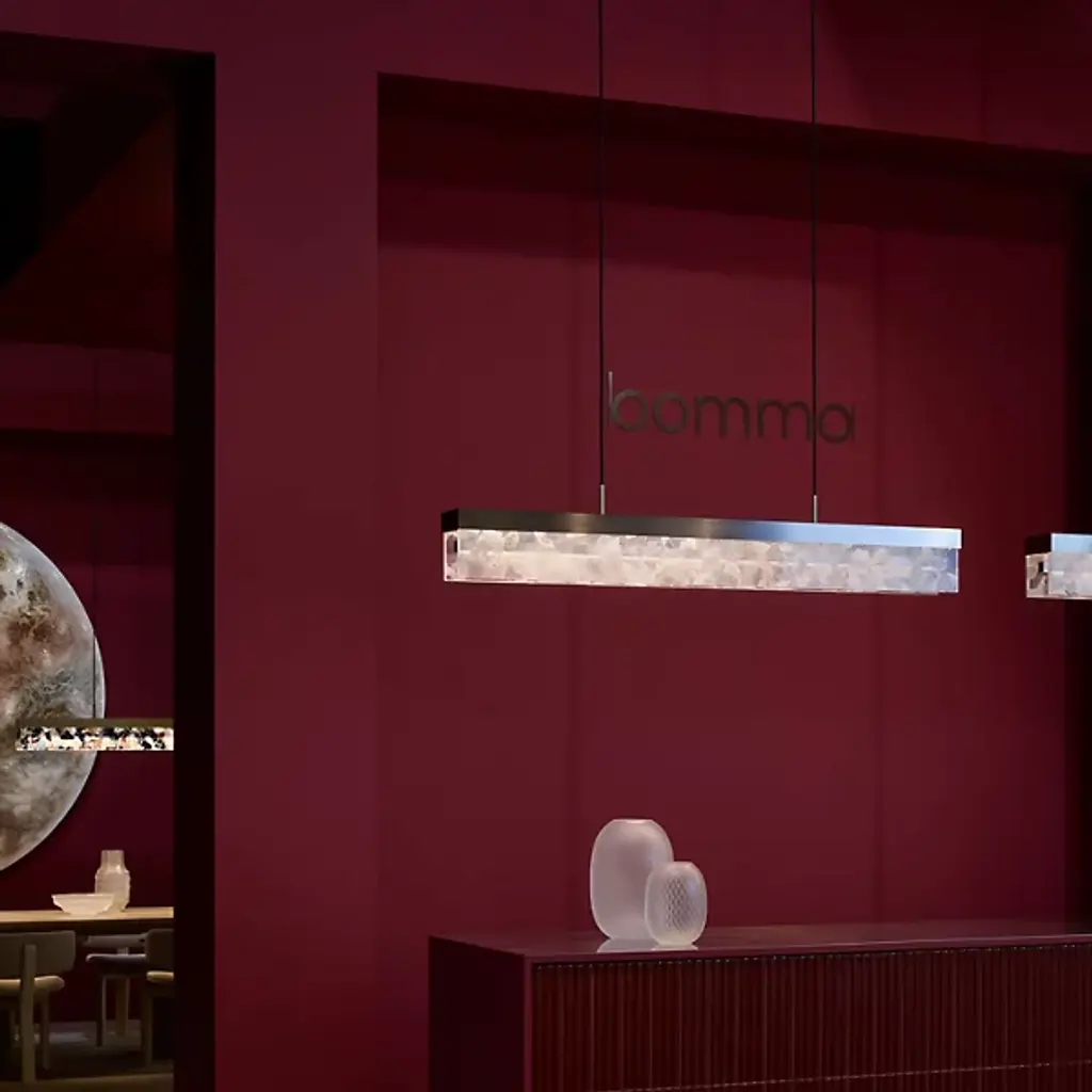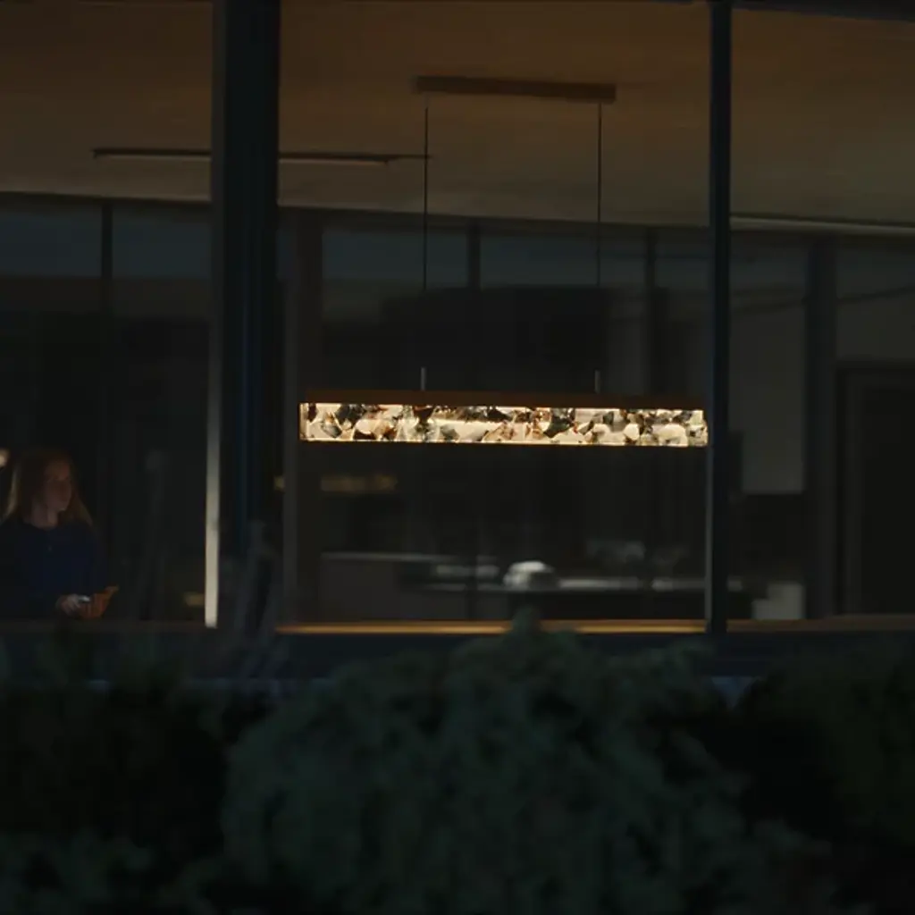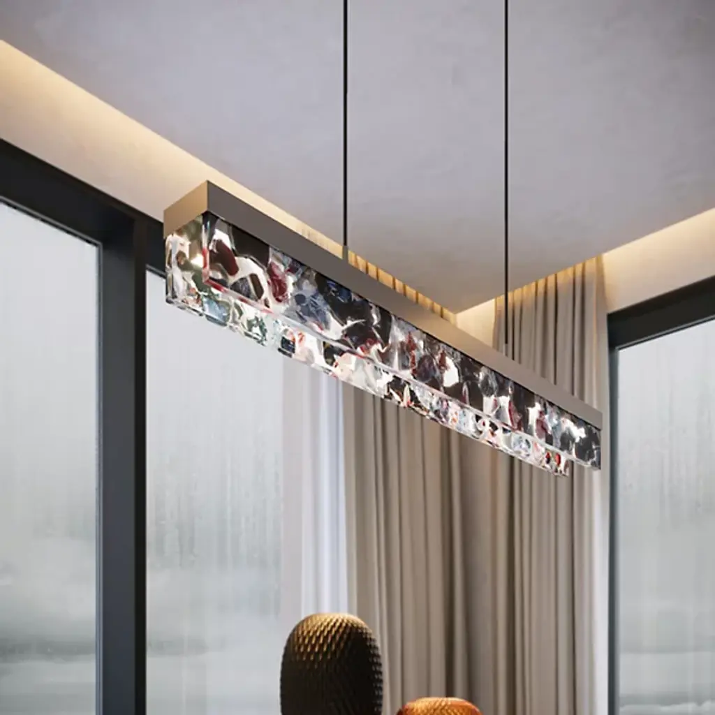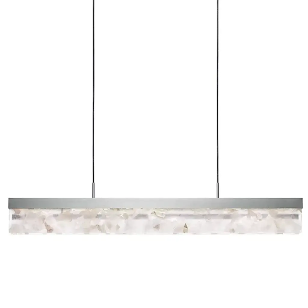The Fragment LED Linear Suspension from Bomma arranges upcycled Fragmentglass pieces along a horizontal axis. Designed by Studio DECHEM, a steel suspension system supports multiple faceted glass elements that catch and refract light along the fixture's length. This horizontal orientation transforms the repurposed crystal into a composition that reads as a continuous line rather than individual points. Light interacts with the textured, irregular surfaces of the reclaimed glass as it travels through the linear arrangement.