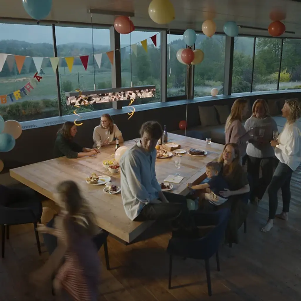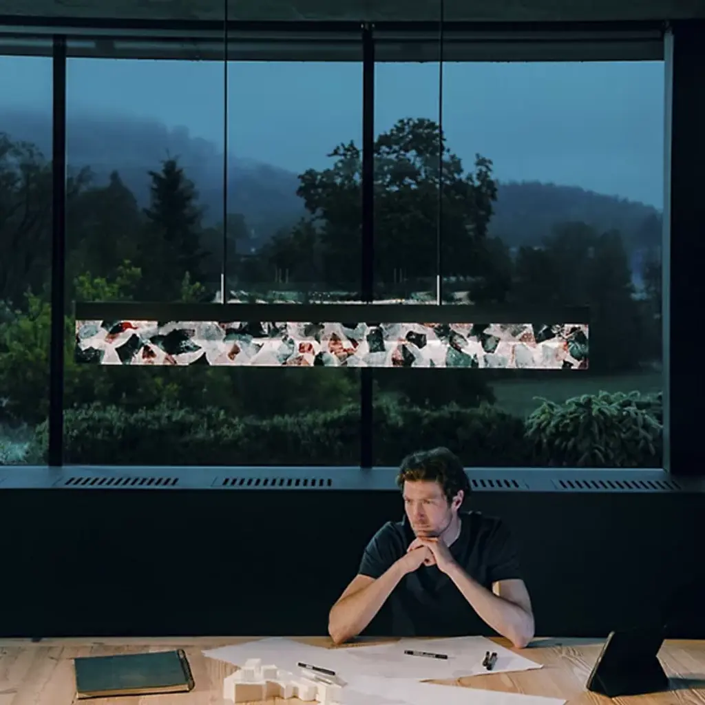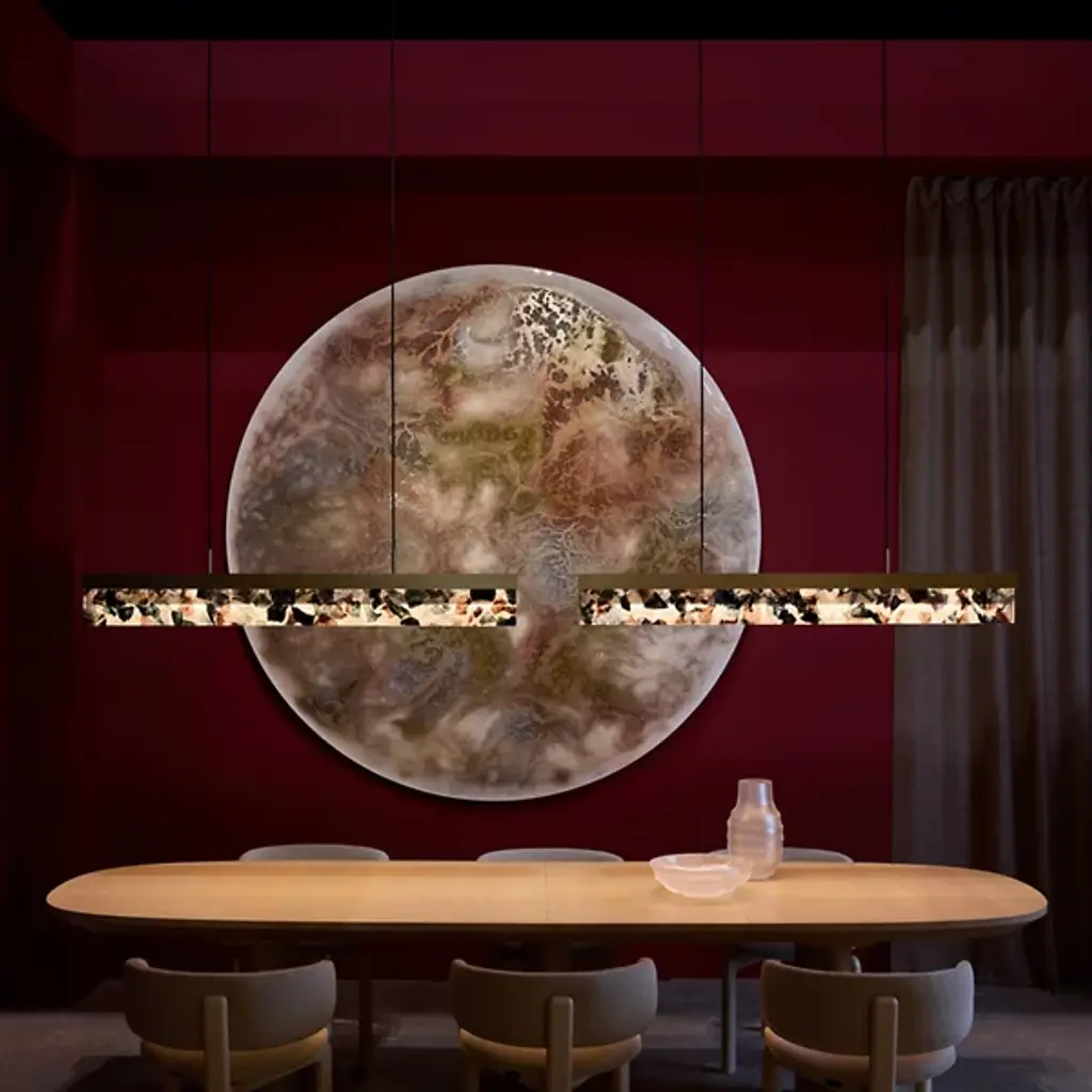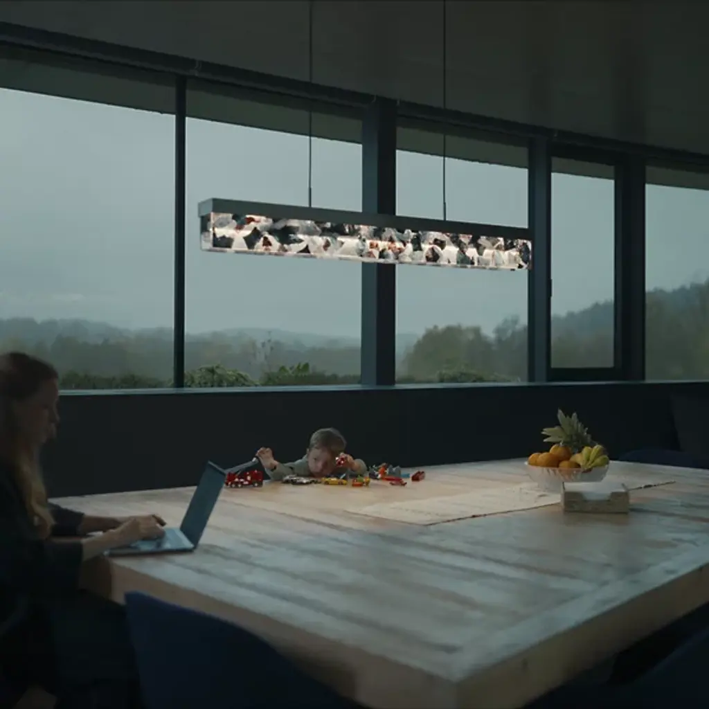 The Fragment LED Linear Suspension from Bomma arranges upcycled Fragmentglass pieces along a horizontal axis. Designed by Studio DECHEM, a steel suspension system supports multiple faceted glass elements that catch and refract light along the fixture's length. This horizontal orientation transforms the repurposed crystal into a composition that reads as a continuous line rather than individual points. Light interacts with the textured, irregular surfaces of the reclaimed glass as it travels through the linear arrangement.