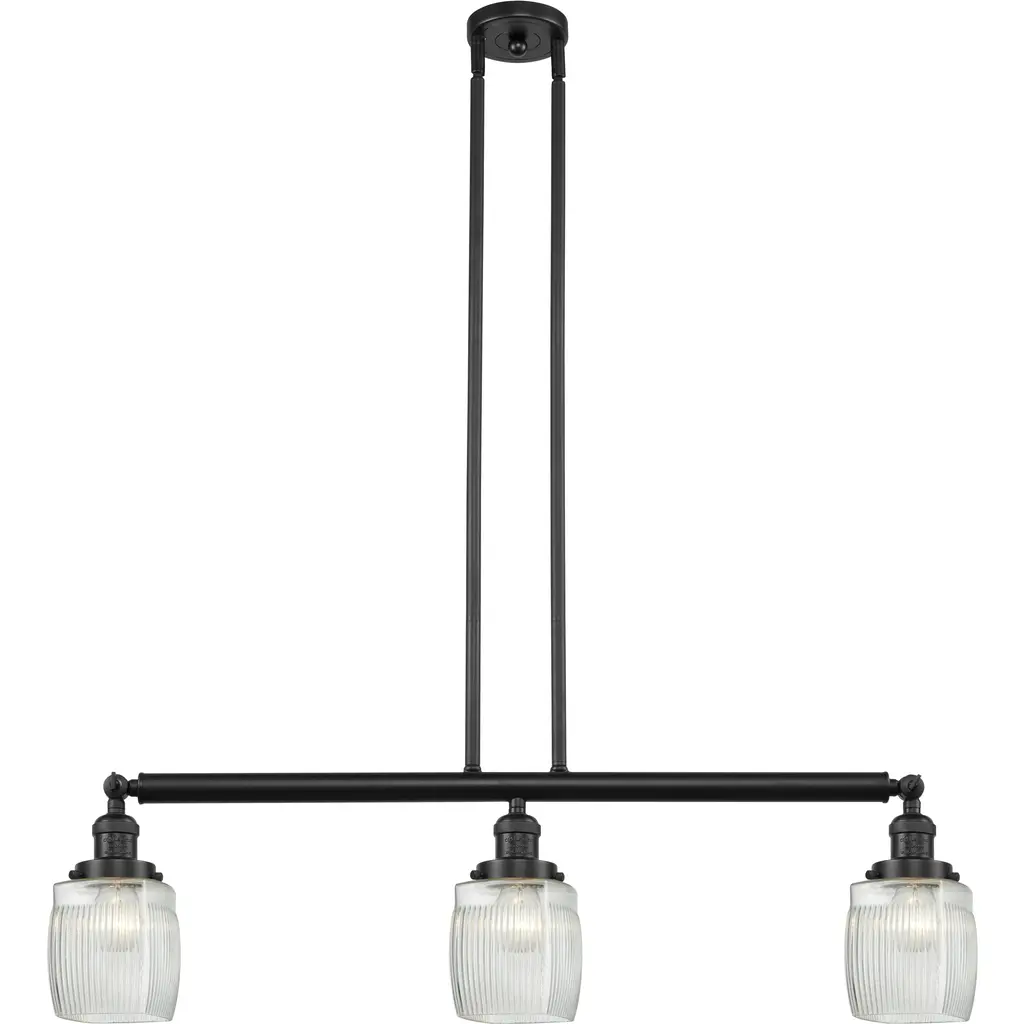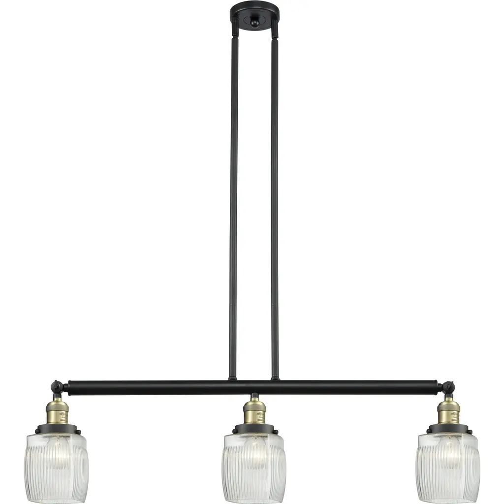 The Colton 3 Light Island Light is part of the Franklin Restoration Collection. Includes 2-6 and 4-12 inch Stems With Solid Brass 90 Degree Hang Straight Swivel for Sloped Ceilings. Solid Brass 180 Degree Adjustable Swivels with internal teeth that lock in at 5 degree intervals With Engraved Cast Cup. Solid Brass 90 Degree Hang Straight Swivel for Sloped Ceilings Included