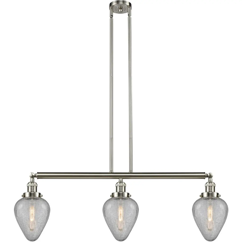 The Geneseo 3 Light Island Light is part of the Franklin Restoration Collection. Includes 2-6 and 4-12 inch Stems. Additional Stems sold separately.. Solid Brass 180 Degree Adjustable Swivels with internal teeth that lock in at 5 degree intervals With Engraved Cast Cup. Solid Brass 90 Degree Hang Straight Swivel for Sloped Ceilings Included