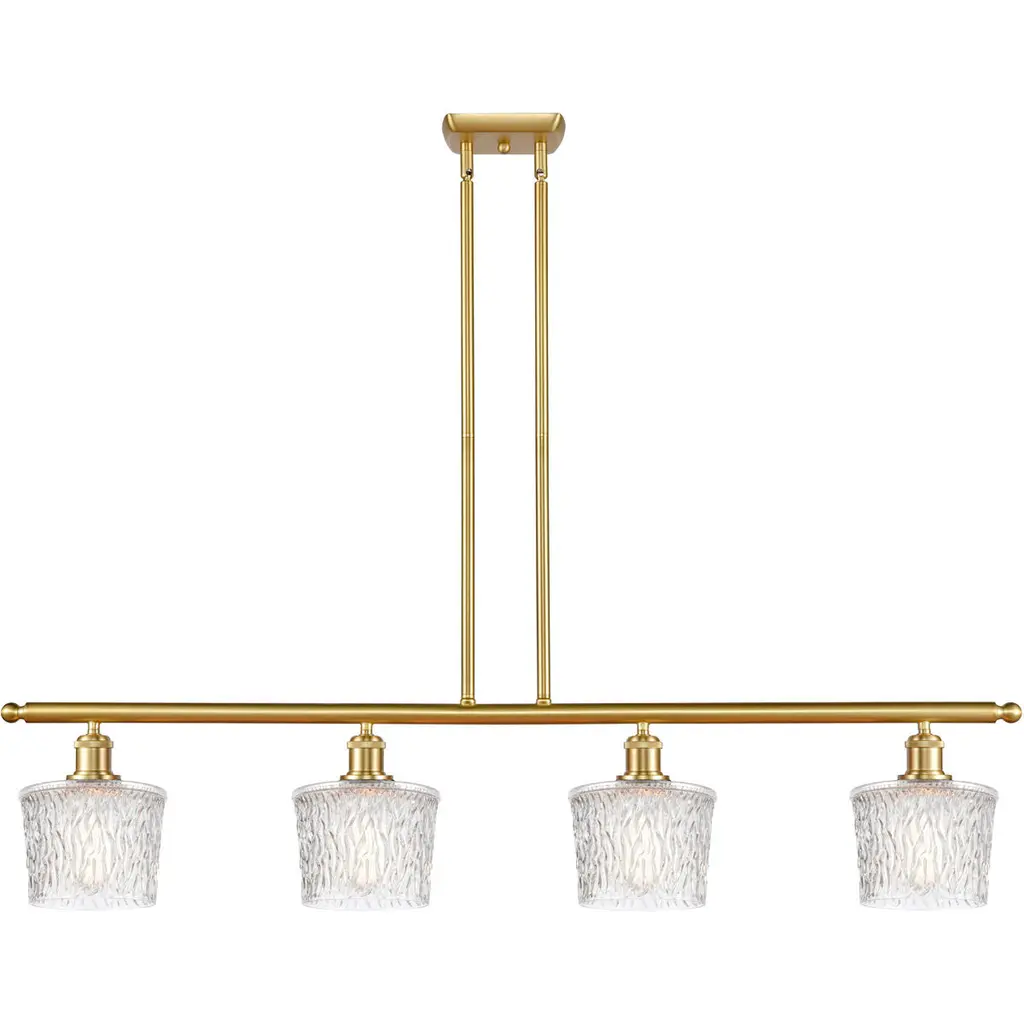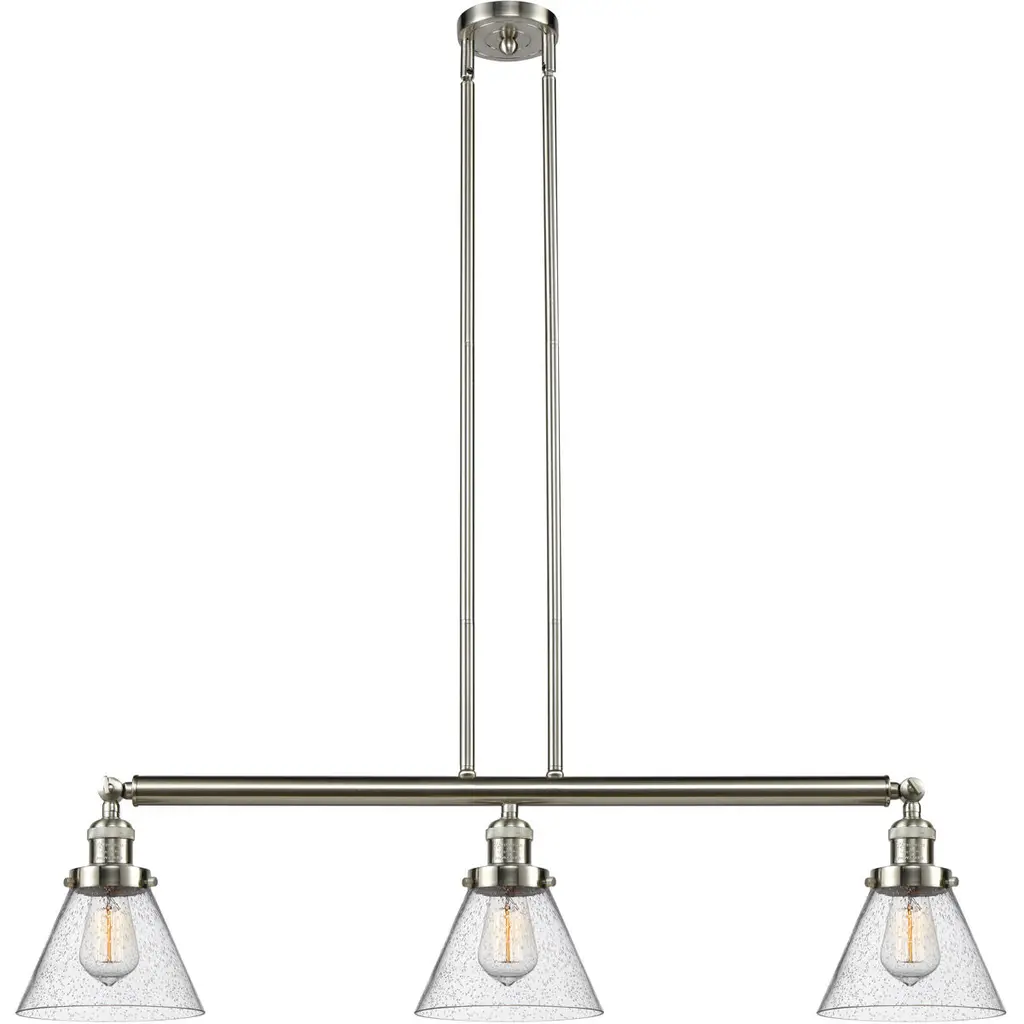 Franklin Restoration Large Cone 3 Light 40 Inch Satin Gold Island Light Ceiling Light In Seedy Glass, Franklin Restoration