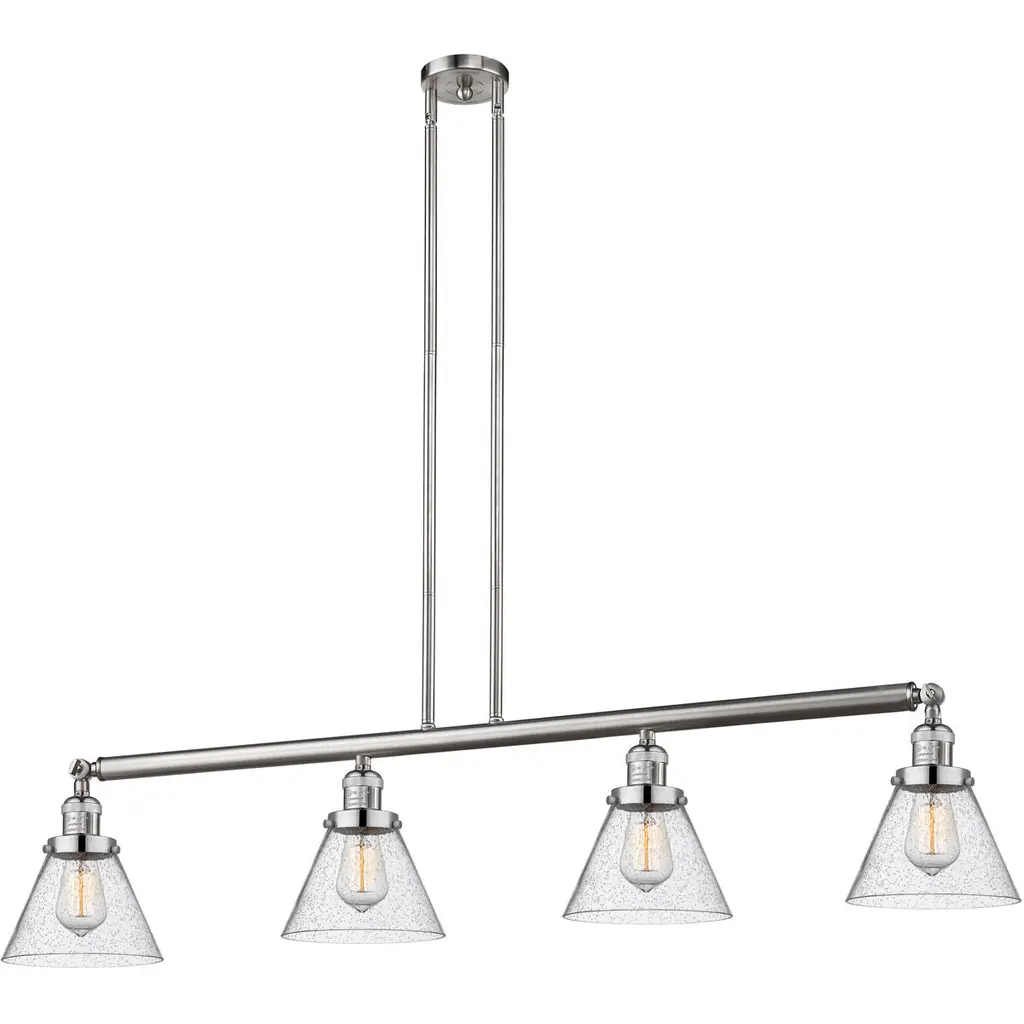 The Large Cone 4 Light Island Light is part of the Franklin Restoration Collection. Includes 2-6 and 4-12 inch Stems With Solid Brass 90 Degree Hang Straight Swivel for Sloped Ceilings. Solid Brass 180 Degree Adjustable Swivels with internal teeth that lock in at 5 degree intervals With Engraved Cast Cup. Solid Brass 90 Degree Hang Straight Swivel for Sloped Ceilings Included