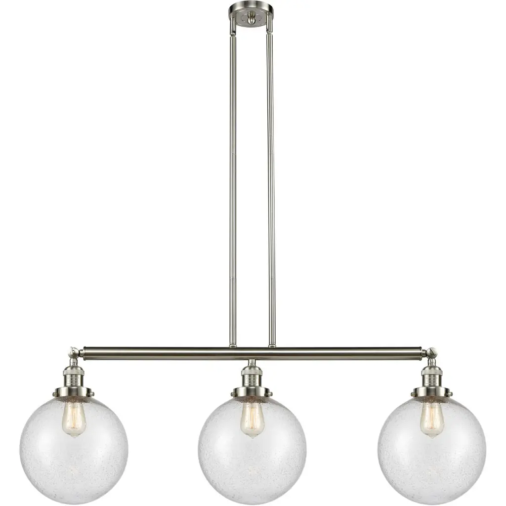 The X-Large Beacon 3 Light Island Light is part of the Franklin Restoration Collection. Includes 2-6 and 4-12 inch Stems With Solid Brass 90 Degree Hang Straight Swivel for Sloped Ceilings. Solid Brass 180 Degree Adjustable Swivels with internal teeth that lock in at 5 degree intervals With Engraved Cast Cup. Solid Brass 90 Degree Hang Straight Swivel for Sloped Ceilings Included