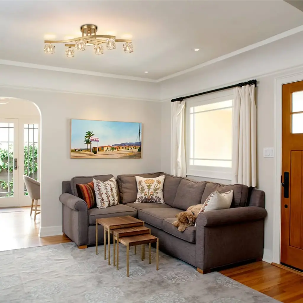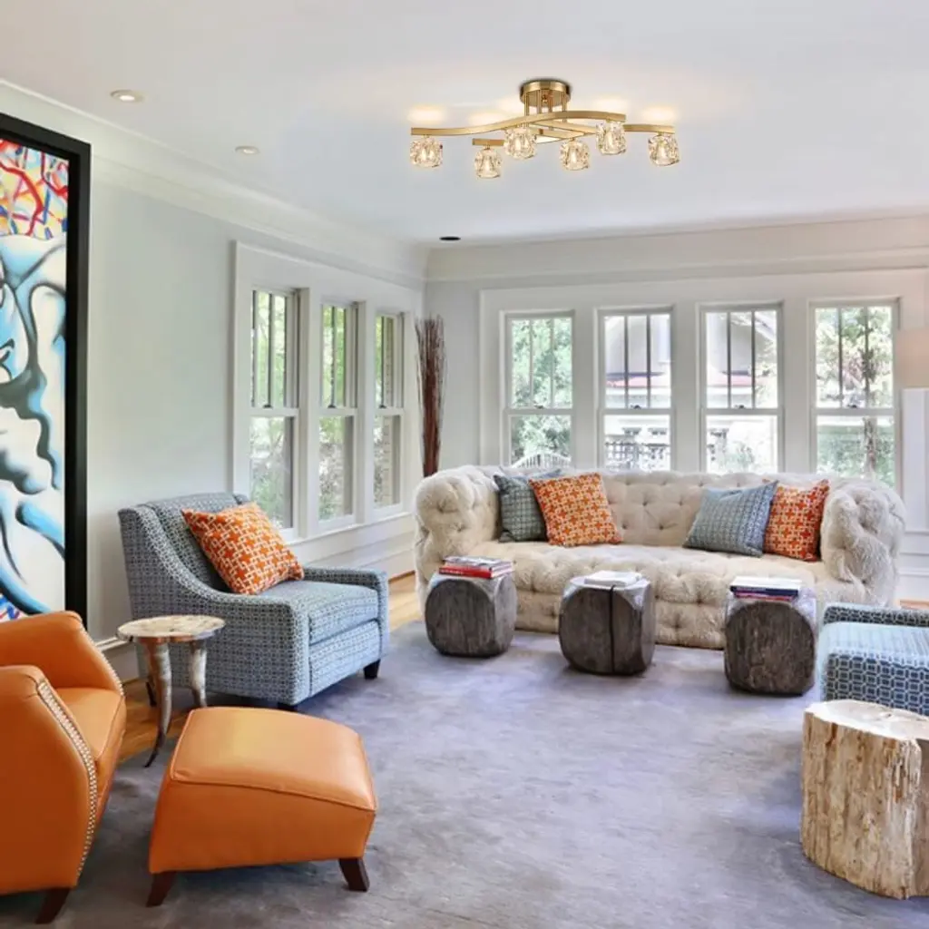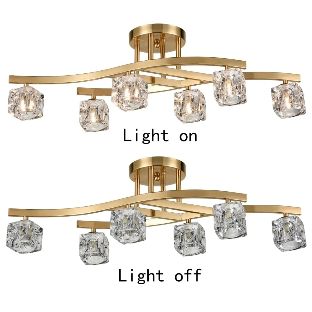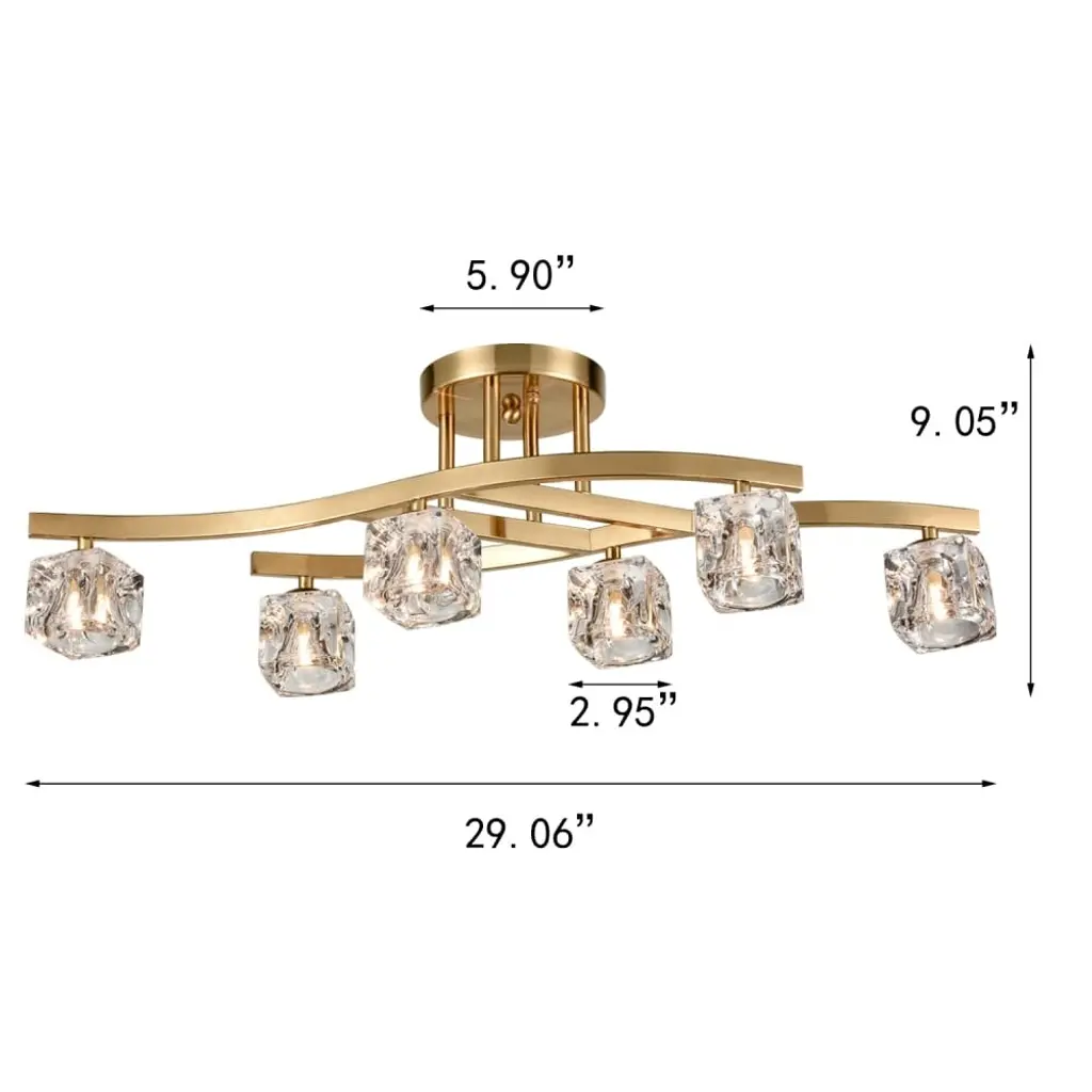 The crystal ceiling lights' frame and canopy feature shimmery brushed nickel or Brass finishes, highlighting your living space with a modern vibe. Flaunting six clear crystal glass shades, this semi flush mount ceiling light brings a boost of sparkle to your space.The crystal glass shades are attached to two wavy bars and largely resemble the glittering ice cubes. With exquisite workmanship, six shades are evenly aligned in linear formation when viewed from different angles.It is a lovely addition to your aesthetic with its glint of glamour. It serves as a dramatic piece for gracing living room, kitchen and dining room.Compatible with six 40-watt G9-based bulbs (NOT included). Fully dimmable with compatible dimmer switch and dimmable bulbs. Dim the ceiling light down from ambient lighting to a soft gleam to create a romantic atmosphere. It disperses warm pool of light throughout your space, creating a calming ambiance in your home.ETL listed for dry locations. A hardwired connection is applicable to the crystal ceiling lights.Dimension: 9.05 inches high * 29.06 inches wide; canopy: 5.90 inches.