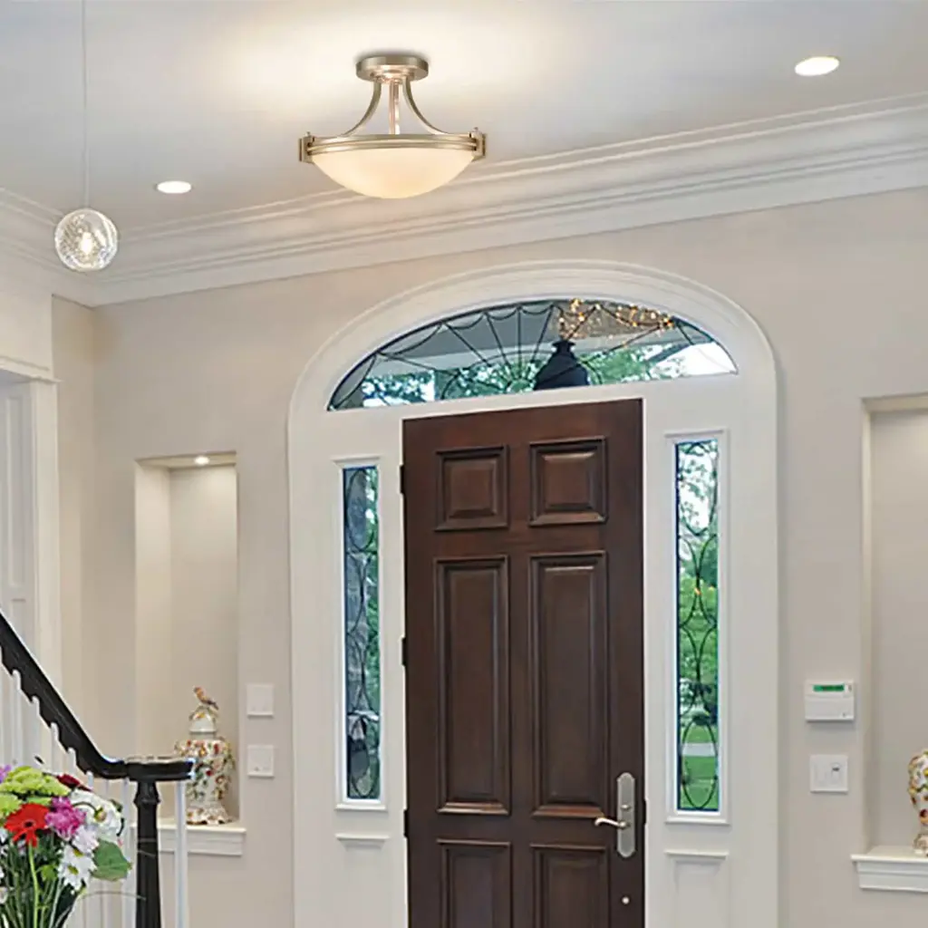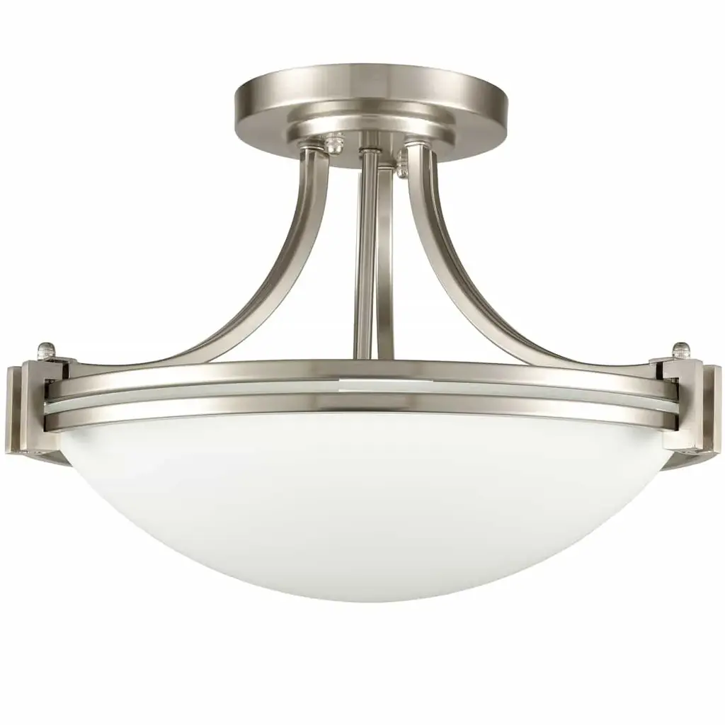 The semi flush mount ceiling light delivers a dose of contemporary sparkle to your living space with a glittering brushed nickel finish. It flaunts a rounded metal frame that is held in place by three softly curved arms, providing a ton of texture to the interior. The milk glass dome shade elevates your interior with a graceful touch. Its brushed nickel finish contrasts the milk glass shade and adds alluring visual interest to the space.