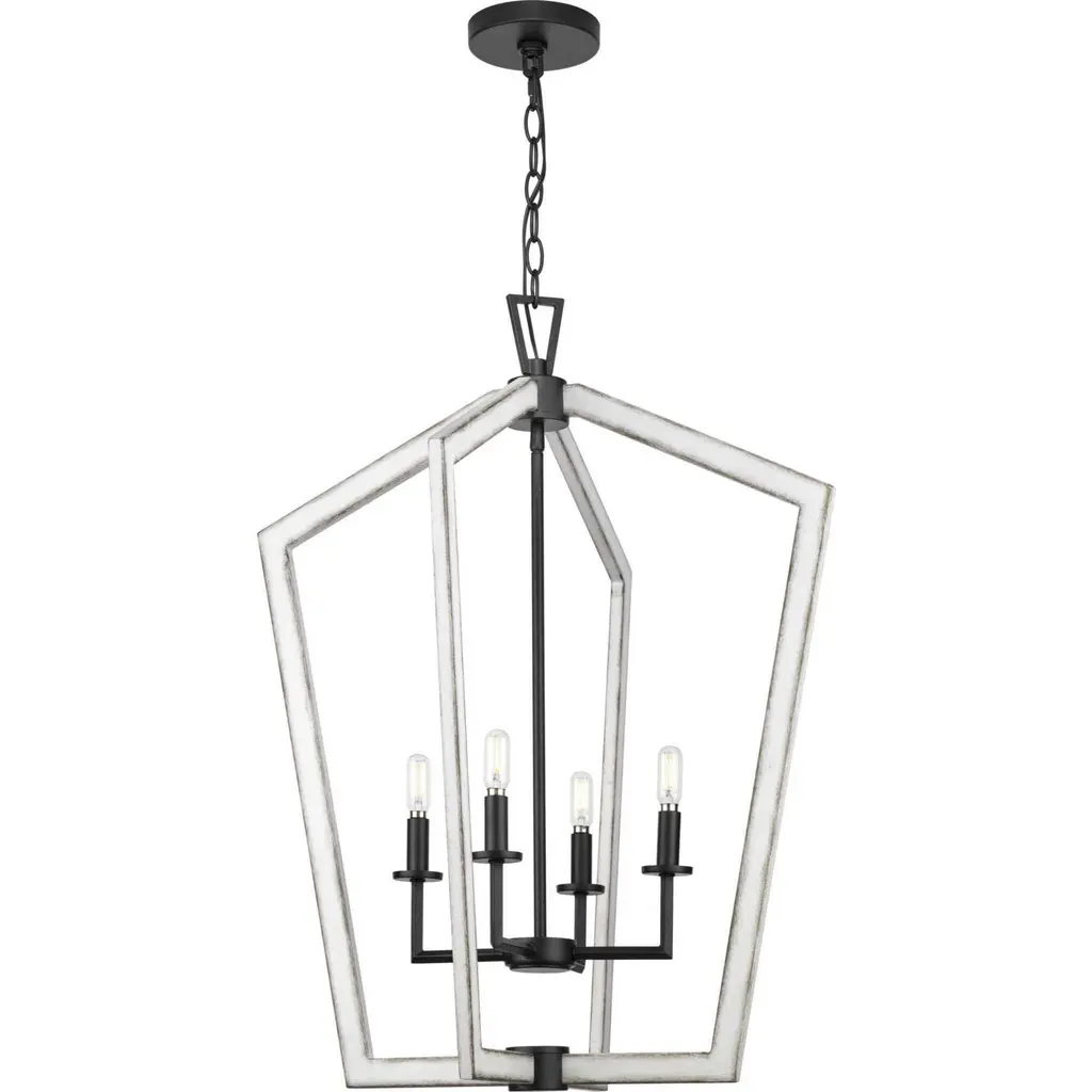 Clean, modern lines combine with rustic elements in the Galloway Collection. A lightly distressed white finish highlights an open, angular frame suspended from a triangular loop detail attached to an adjustable chain and simple round canopy, all finished in crisp matte black. Matte black columns hold candelabra lights that glow brightly within the stately form to illuminate spaces in a casually elegant style. The larger scale and airy design of this foyer light makes it the perfect accompaniment for great rooms, bedrooms and dining rooms.