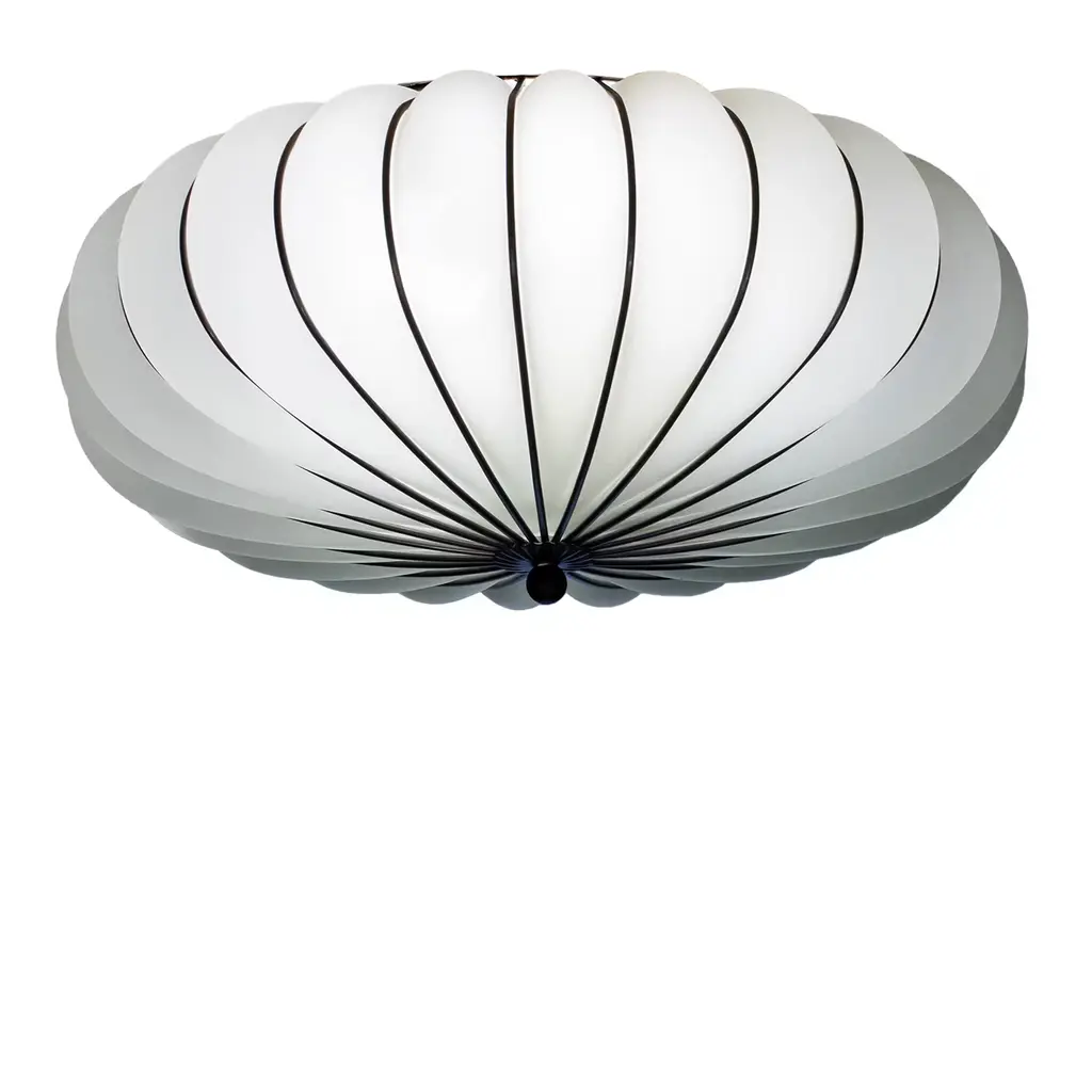 Murano master glassblowers crafted this stunning ceiling lamp by minutely blowing the white glass shade into a stainless steel cage, whose spokes embrace it and trace equidistant grooves stressing the malleable nature of glass when still hot. A fine addition to a bathroom or refined walk-in closet displayed together with a larger variant for increased luminosity, the design is a harmonious synthesis between tradition and innovation. Due to handcrafting, slight changes in metal's finish may occur.
