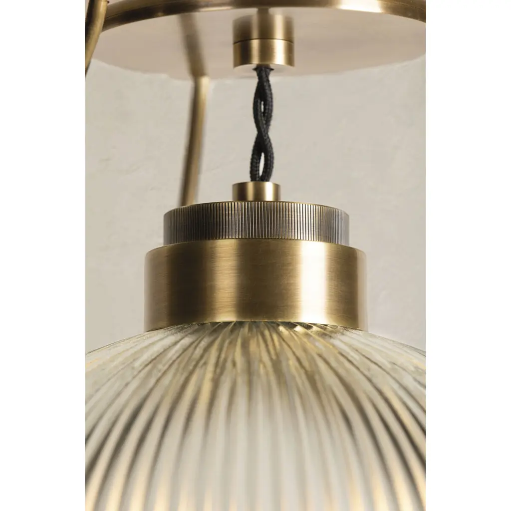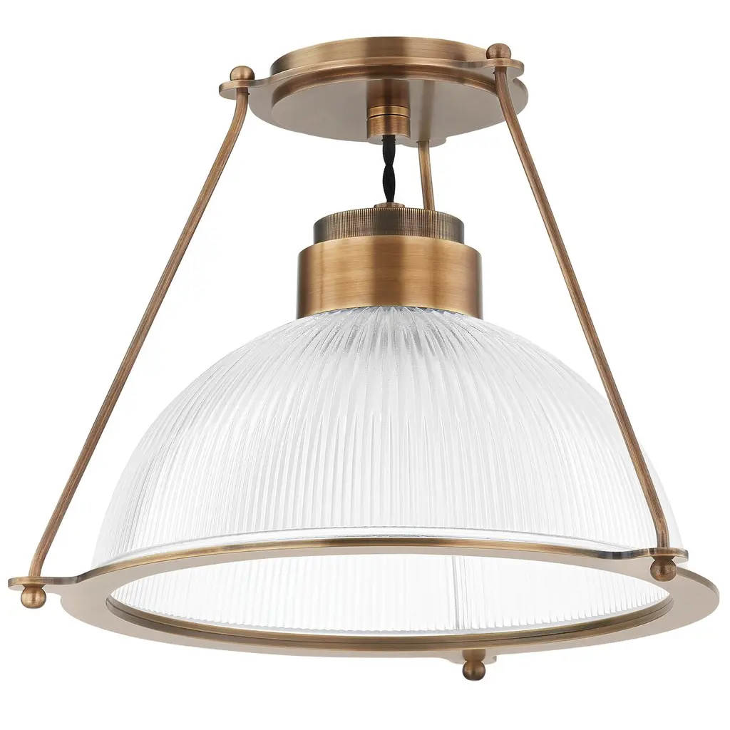 Industrial design with a modern edge, Glint features a dome shade of ribbed Holophane glass suspended from the ceiling within a unique Patina Brass framework. The twisted black fabric cord near the canopy adds a subtle vintage feel. This striking semi-flush mount makes a gorgeous statement close to the ceiling. Part of our Lauren Liess collection.