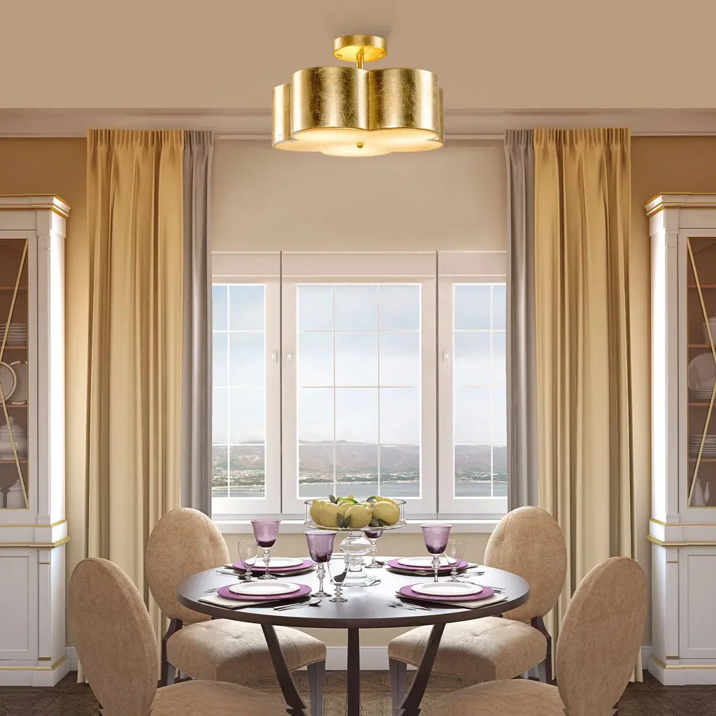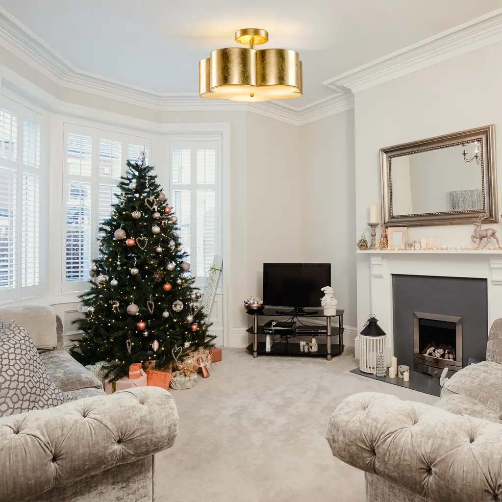 This sophisticated, flower-shaped semi-flush 3-light ceiling Light brings a modern elegance to your space with its polished gold finish. Utilizing three E12 bulbs (not included), this stylish fixture casts a warm, gentle illumination, creating a mesmerizing interplay of light and shadows. Ideal for living rooms, dining rooms, and beyond, it comes with comprehensive installation instructions for effortless set-up.