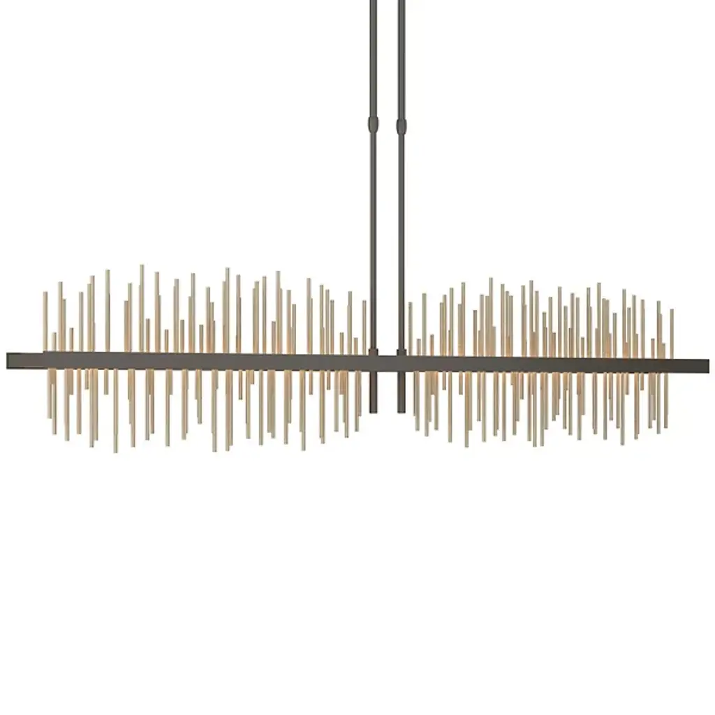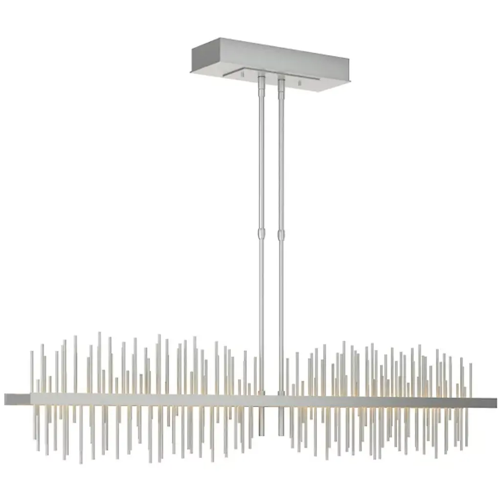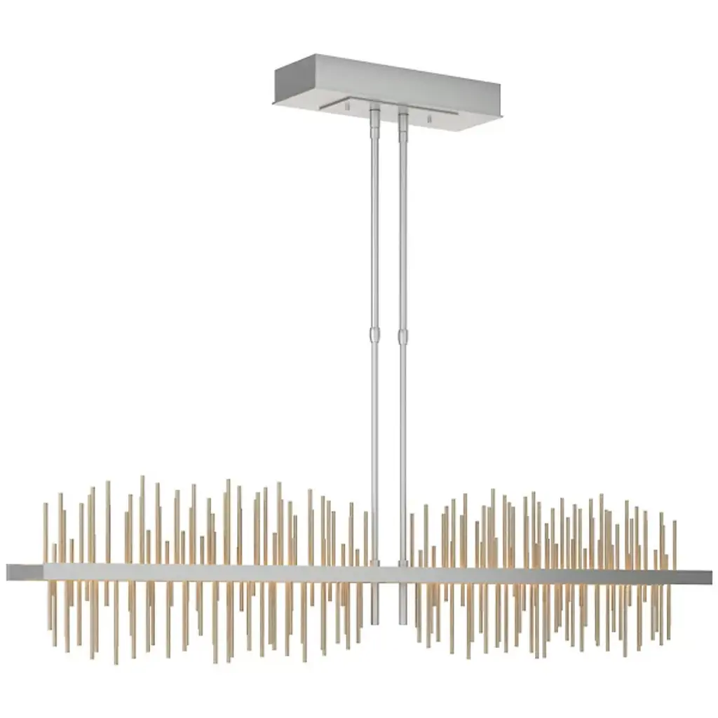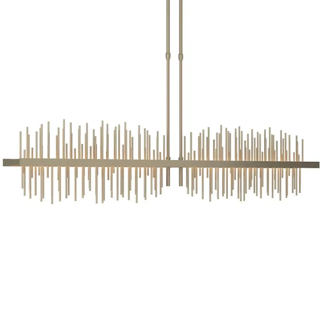 The Gossamer Large LED Linear Suspension by Hubbardton Forge is a dynamic piece with a minimalistic feel. Two central down rods support a bold frame encasing energy-efficient light panels that an array of slender, handcrafted, metal rods pierce. Set at varying heights, these rods create a wave-like sense of movement along this linear fixture as it casts both an upward and downward layer of light onto surroundings, lending a decorative and bright touch to rooms.