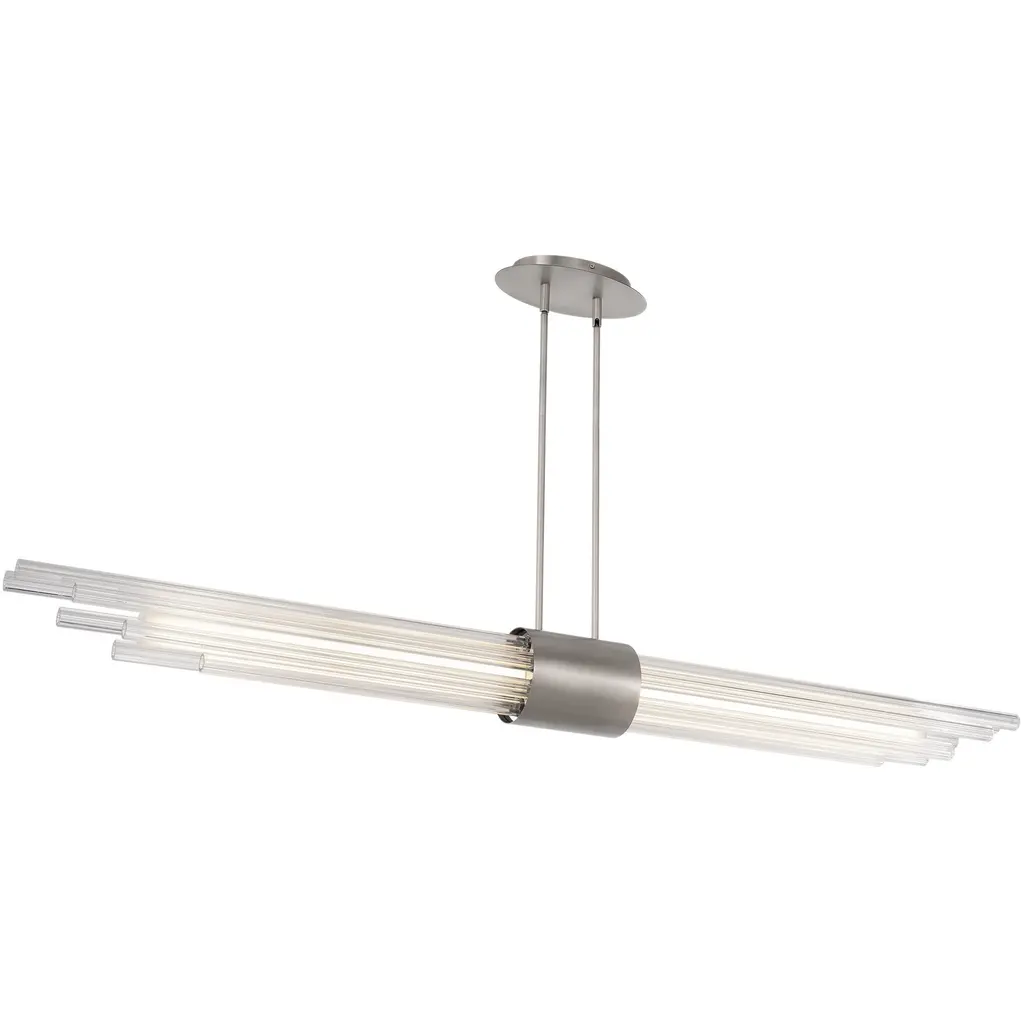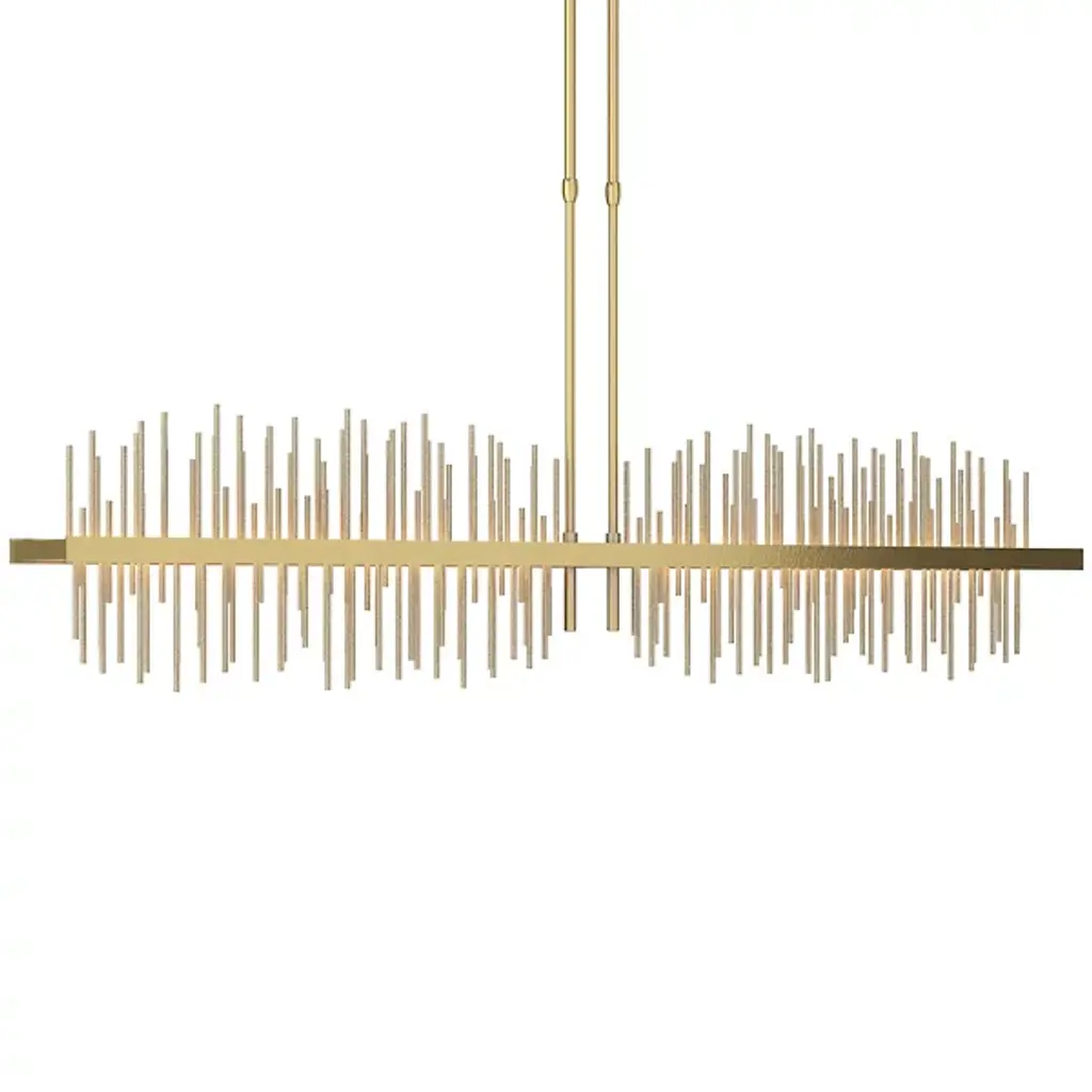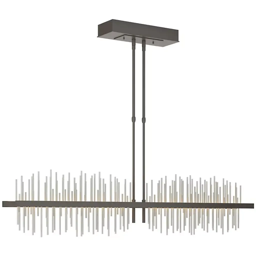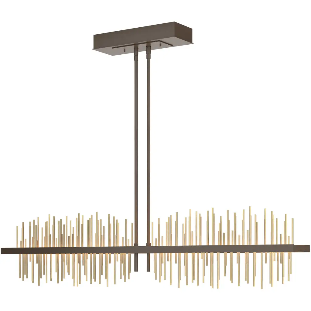 The Gossamer Large LED Linear Suspension by Hubbardton Forge is a dynamic piece with a minimalistic feel. Two central down rods support a bold frame encasing energy-efficient light panels that an array of slender, handcrafted, metal rods pierce. Set at varying heights, these rods create a wave-like sense of movement along this linear fixture as it casts both an upward and downward layer of light onto surroundings, lending a decorative and bright touch to rooms.