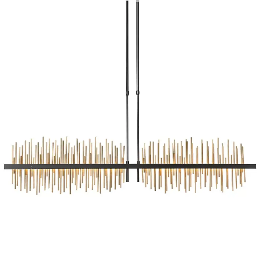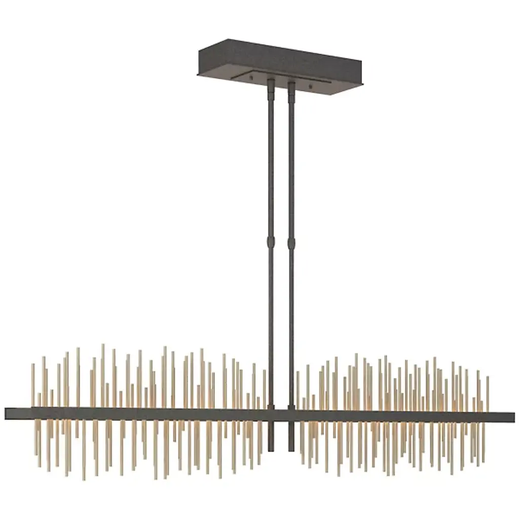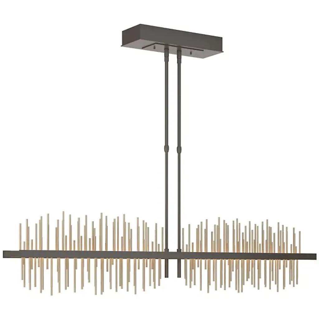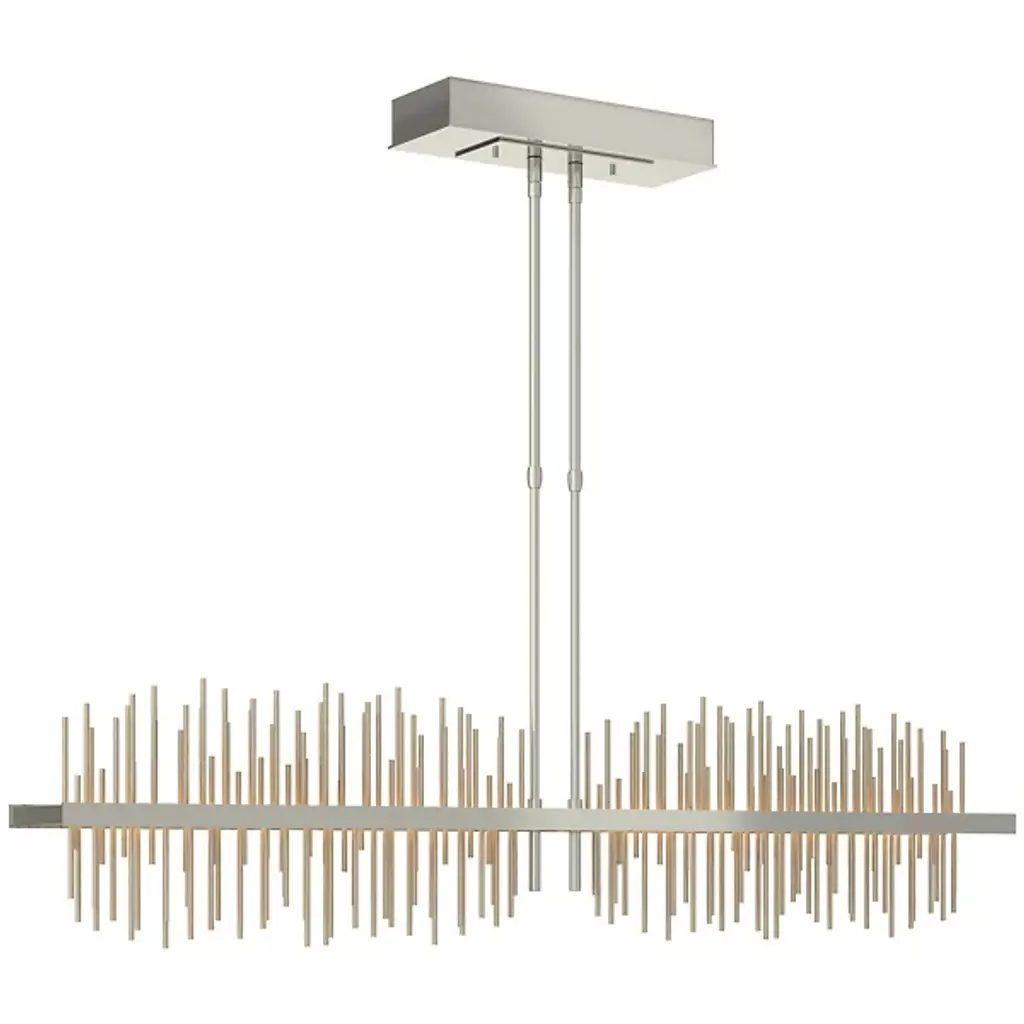 The Gossamer Large LED Linear Suspension by Hubbardton Forge is a dynamic piece with a minimalistic feel. Two central down rods support a bold frame encasing energy-efficient light panels that an array of slender, handcrafted, metal rods pierce. Set at varying heights, these rods create a wave-like sense of movement along this linear fixture as it casts both an upward and downward layer of light onto surroundings, lending a decorative and bright touch to rooms.