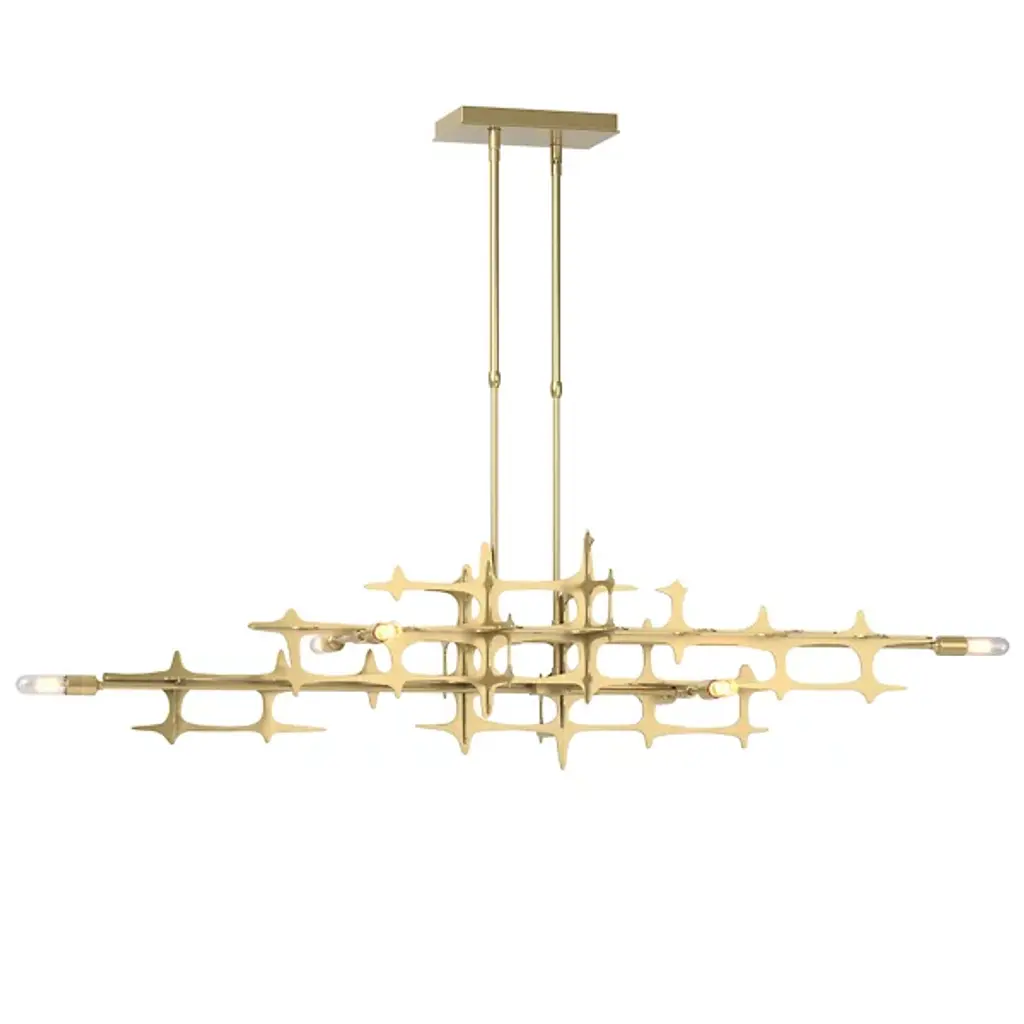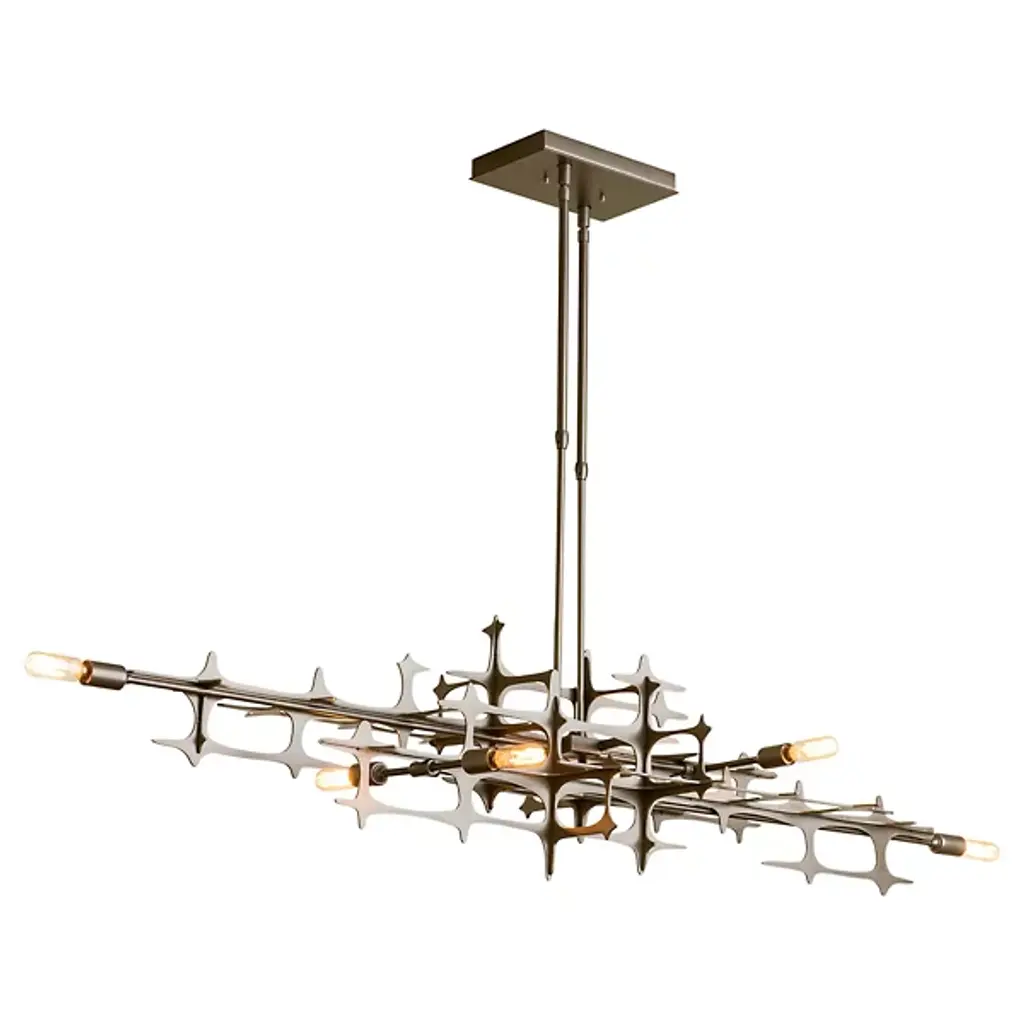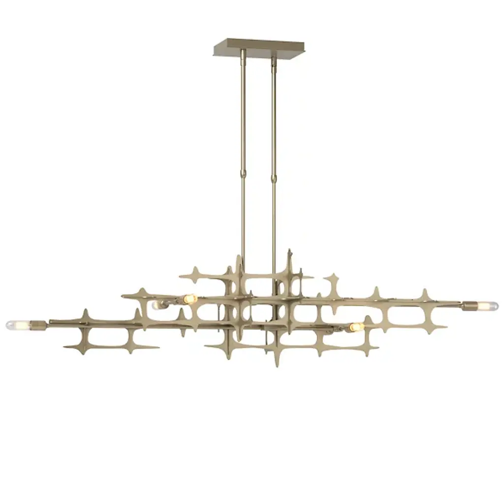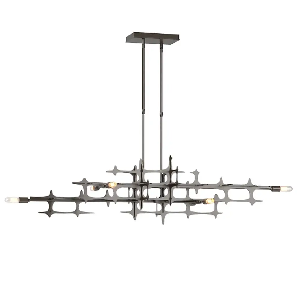 The Grid Linear Suspension from Hubbardton Forge exists as an unexplainable beauty in the way its construction feels natural and organic while also precise and mechanical. Every angle of the piece is easy to marvel at, as layers of lines are created by segments of interconnected metal, which at the center produce a uniform grid design. Incandescent bulbs add an ambient warmth to the structure, turning it into a beaming construction of light and shadow.