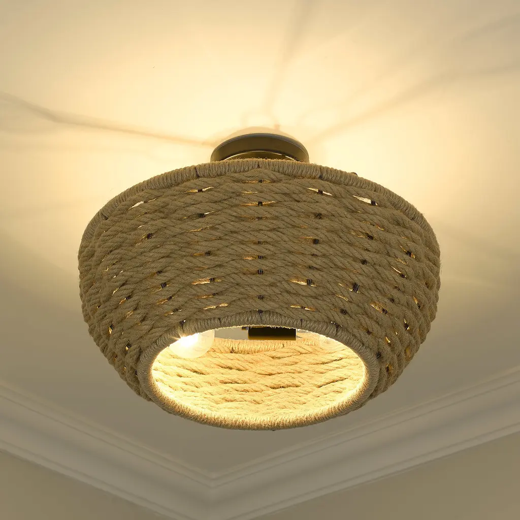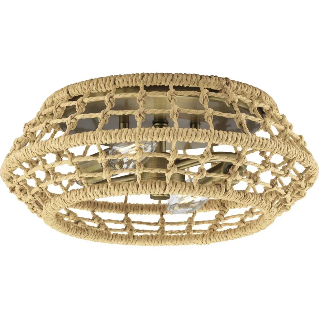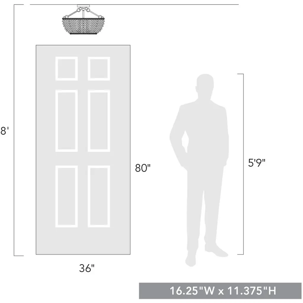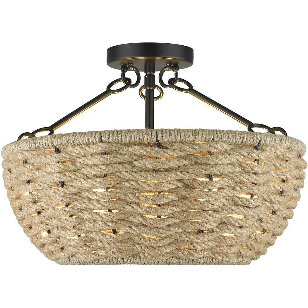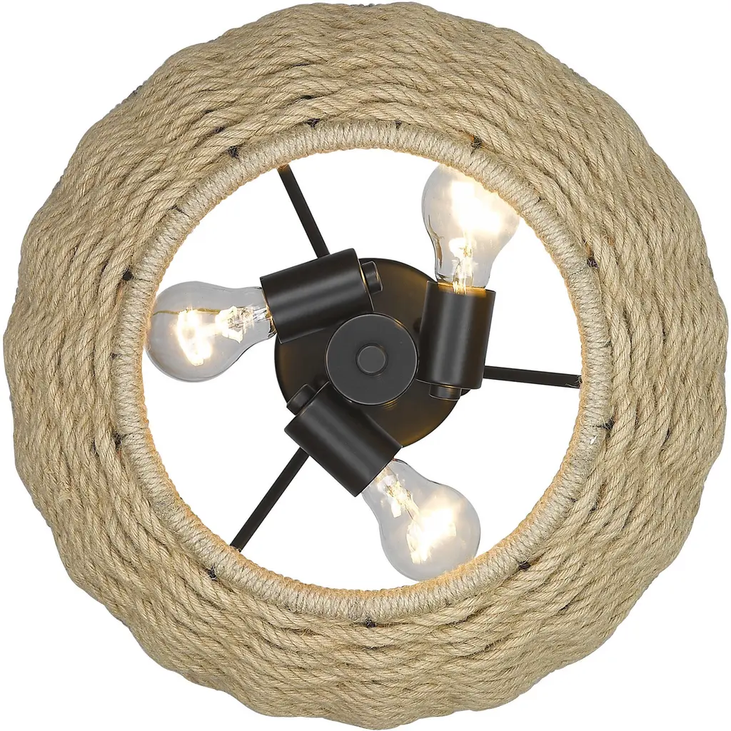 Introduce timeless coastal charm into your decor with the Golden Lighting Hathaway 3-light Semi-Flush Mount in Matte Black. Featuring a rope shade and a matte black frame, it creates an inviting atmosphere.The woven hemp rope shade not only enhances the design with its textural appeal but also gently diffuses light, creating a warm glow that adds character to your space.The matte black finish is versatile and sophisticated, featuring a smooth, non-reflective surface that suits a variety of decor styles.This semi-flush mount is perfect for entryways, bedrooms, kitchens, and living areas with mid-height ceilings. Damp location rated, it is ideal for spaces with occasional moisture.Overall dimensions are 16.25"W x 11.38"H x 16.25"D, requiring three E26 medium base bulbs (not included) with a maximum wattage of 60 per bulb.Enhance your home with this quality fixture that beautifully combines style and practical illumination.
