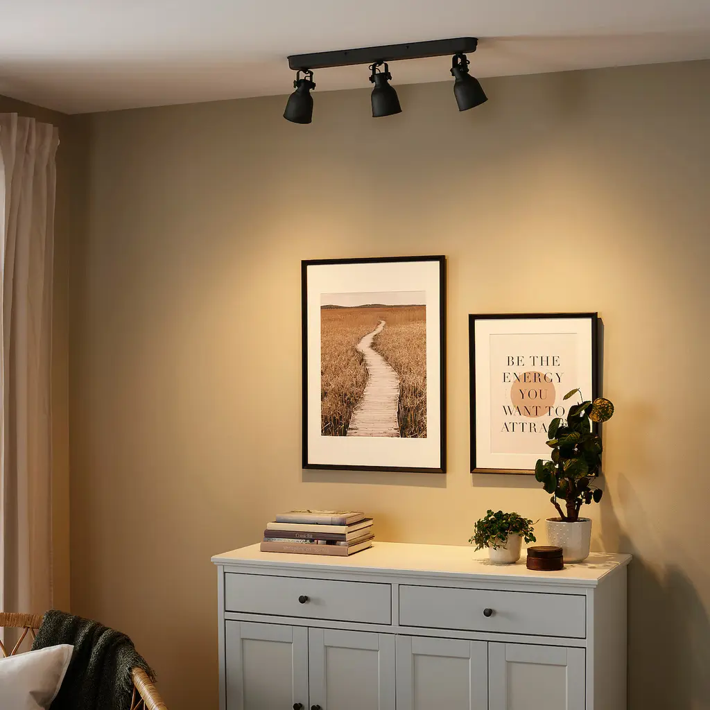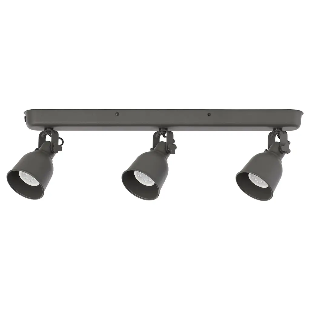HEKTAR Ceiling track, 3 spotlights - dark gray. You can easily direct the light to different places since each spotlight can be adjusted individually. Light bulbs sold separately. IKEA recommends LED bulb GU10 (3 pcs). Hardwired installation. May be completed with other lamps in the same series.