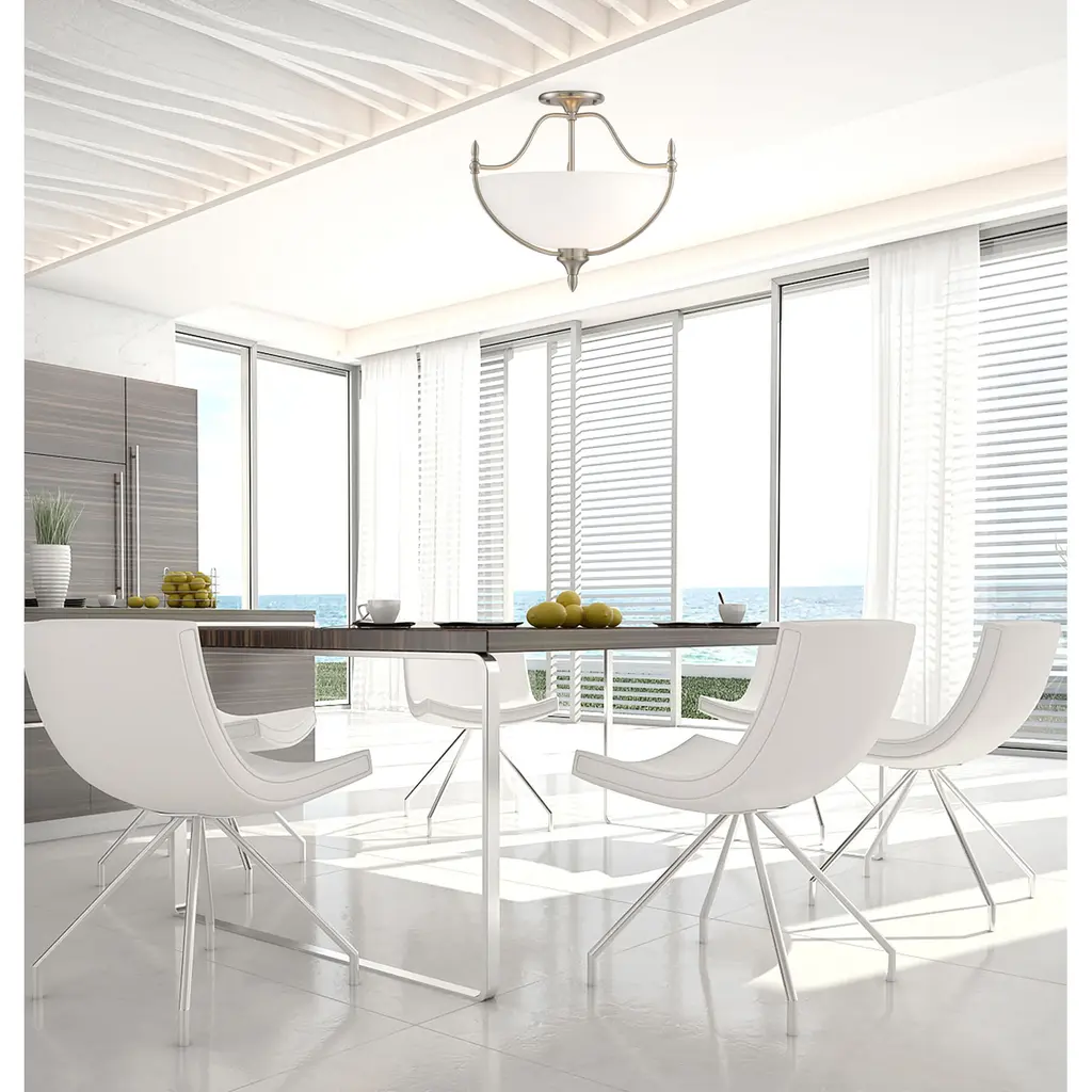 Great lighting, like the Savoy House Herndon 3-light ceiling light, is a key piece of home design Finished in timeless satin nickel, its streamlined, finely crafted details create a clean, classic design that looks terrific. The style is familiar and pleasant, which sets a serene and relaxed mood. Graceful arched bars hold a white frosted glass shade and three 60W standard size bulbs provide soft, flattering light to ensure you and your guests are comfortable. This ceiling light is 18" wide and 15.5" high, creating a stylish fixture with casual elegance youll enjoy for years to come.