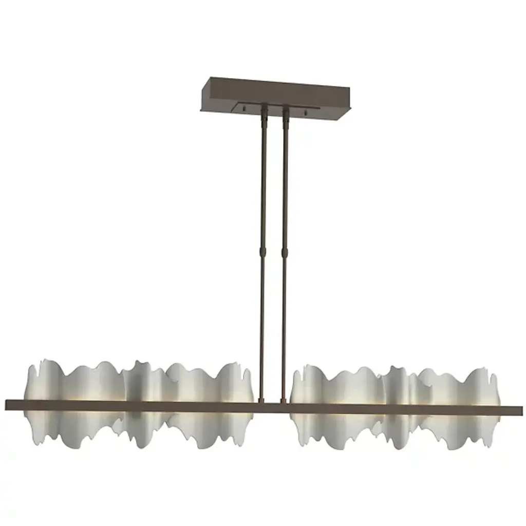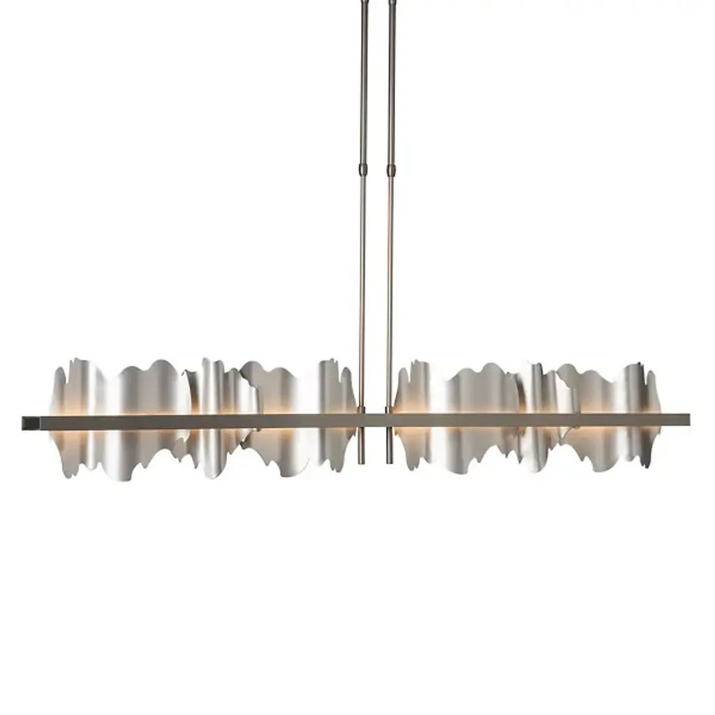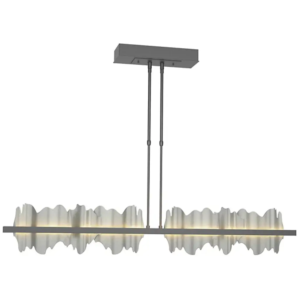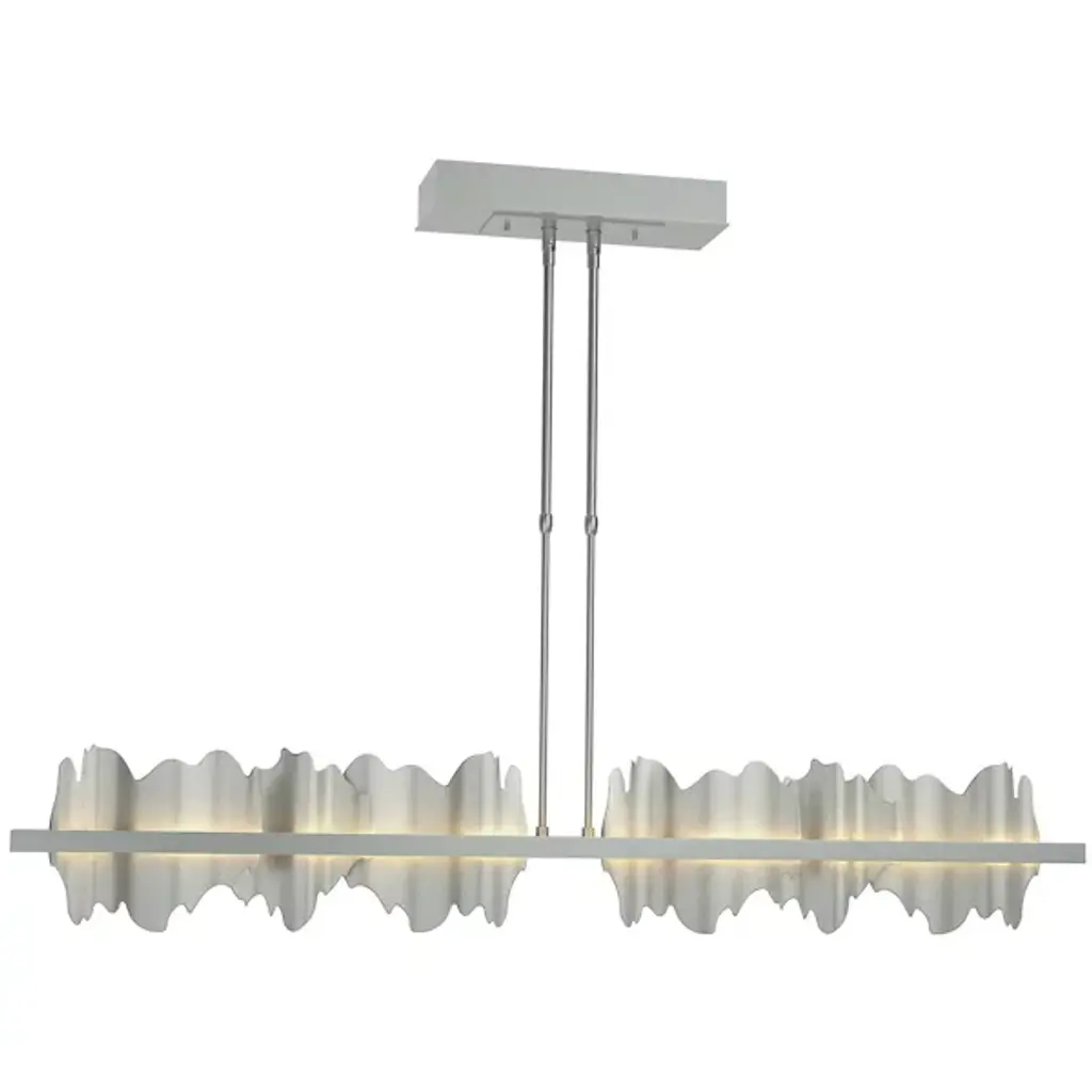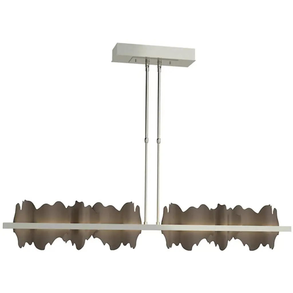 Take a unique approach to lighting your home with the Hildene Large LED Linear Suspension from Hubbardton Forge. A pair of downrods extend from a ceiling mount and uphold a thick metal frame. Flat and smooth metal plates are arranged upright and resemble flowing hill and valleys, adding a playful visual touch to the space. Integrated LEDs sit behind the frame, emitting a warm and clean glow that adds a touch of depth and life to the plates.