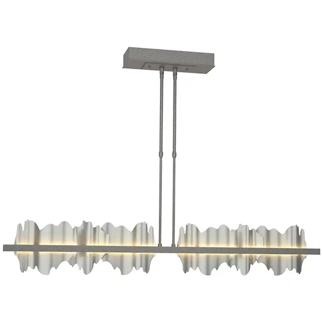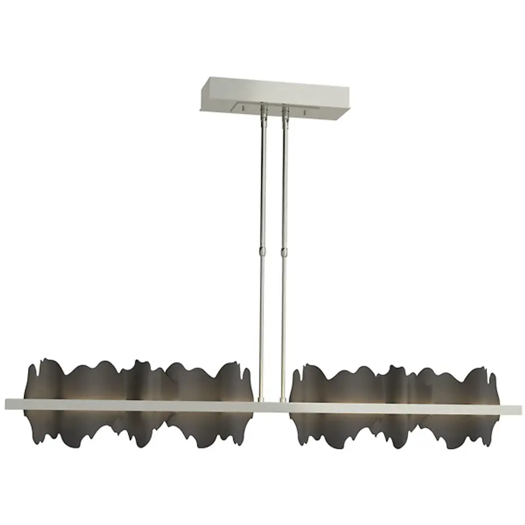 Take a unique approach to lighting your home with the Hildene Large LED Linear Suspension from Hubbardton Forge. A pair of downrods extend from a ceiling mount and uphold a thick metal frame. Flat and smooth metal plates are arranged upright and resemble flowing hill and valleys, adding a playful visual touch to the space. Integrated LEDs sit behind the frame, emitting a warm and clean glow that adds a touch of depth and life to the plates.